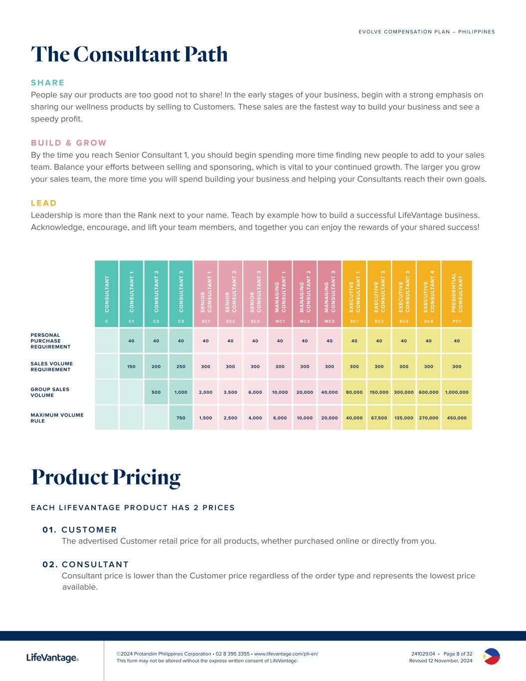 ©2024 Protandim Philippines Corporation • 02 8 395 3355 • www.lifevantage.com/ph-en/ This form may not be altered without the express written consent of LifeVantage. E V O LV E C O M P E N S AT I O N P L A N – P H I L I P P I N E S 241029.04 • Page 8 of 32 Revised 12 November, 2024 The Consultant Path S H A R E People say our products are too good not to share! In the early stages of your business, begin with a strong emphasis on sharing our wellness products by selling to Customers. These sales are the fastest way to build your business and see a speedy profit. B U I L D & G R O W By the time you reach Senior Consultant 1, you should begin spending more time finding new people to add to your sales team. Balance your efforts between selling and sponsoring, which is vital to your continued growth. The larger you grow your sales team, the more time you will spend building your business and helping your Consultants reach their own goals. L E A D Leadership is more than the Rank next to your name. Teach by example how to build a successful LifeVantage business. Acknowledge, encourage, and lift your team members, and together you can enjoy the rewards of your shared success! Product Pricing E AC H L I F E VA N TAG E P R O D U C T H A S 2 P R I C E S 0 1 . C U S TO M E R The advertised Customer retail price for all products, whether purchased online or directly from you. 0 2 . C O N S U LTA N T Consultant price is lower than the Customer price regardless of the order type and represents the lowest price available. C O N S U LT A N T C O N S U LT A N T 1 C O N S U LT A N T 2 C O N S U LT A N T 3 S E N IO R C O N S U LT A N T 1 S E N IO R C O N S U LT A N T 2 S E N IO R C O N S U LT A N T 3 M A N A G IN G C O N S U LT A N T 1 M A N A G IN G C O N S U LT A N T 2 M A N A G IN G C O N S U LT A N T 3 E X E C U T IV E C O N S U LT A N T 1 E X E C U T IV E C O N S U LT A N T 2 E X E C U T IV E C O N S U LT A N T 3 E X E C U T IV E C O N S U LT A N T 4 P R E S ID E N T IA L C O N S U LT A N T C C1 C2 C3 SC1 SC2 SC3 MC1 MC2 MC3 EC1 EC2 EC3 EC 4 PC1 PERSONAL PURCHASE REQUIREMENT 40 40 40 40 40 40 40 40 40 40 40 40 40 40 SALES VOLUME REQUIREMENT 150 200 250 300 300 300 300 300 300 300 300 300 300 300 GROUP SALES VOLUME 500 1,000 2,000 3,500 6,000 10,000 20,000 40,000 80,000 150,000 300,000 600,000 1,000,000 MAXIMUM VOLUME RULE 750 1,500 2,500 4,000 6,000 10,000 20,000 40,000 67,500 135,000 270,000 450,000