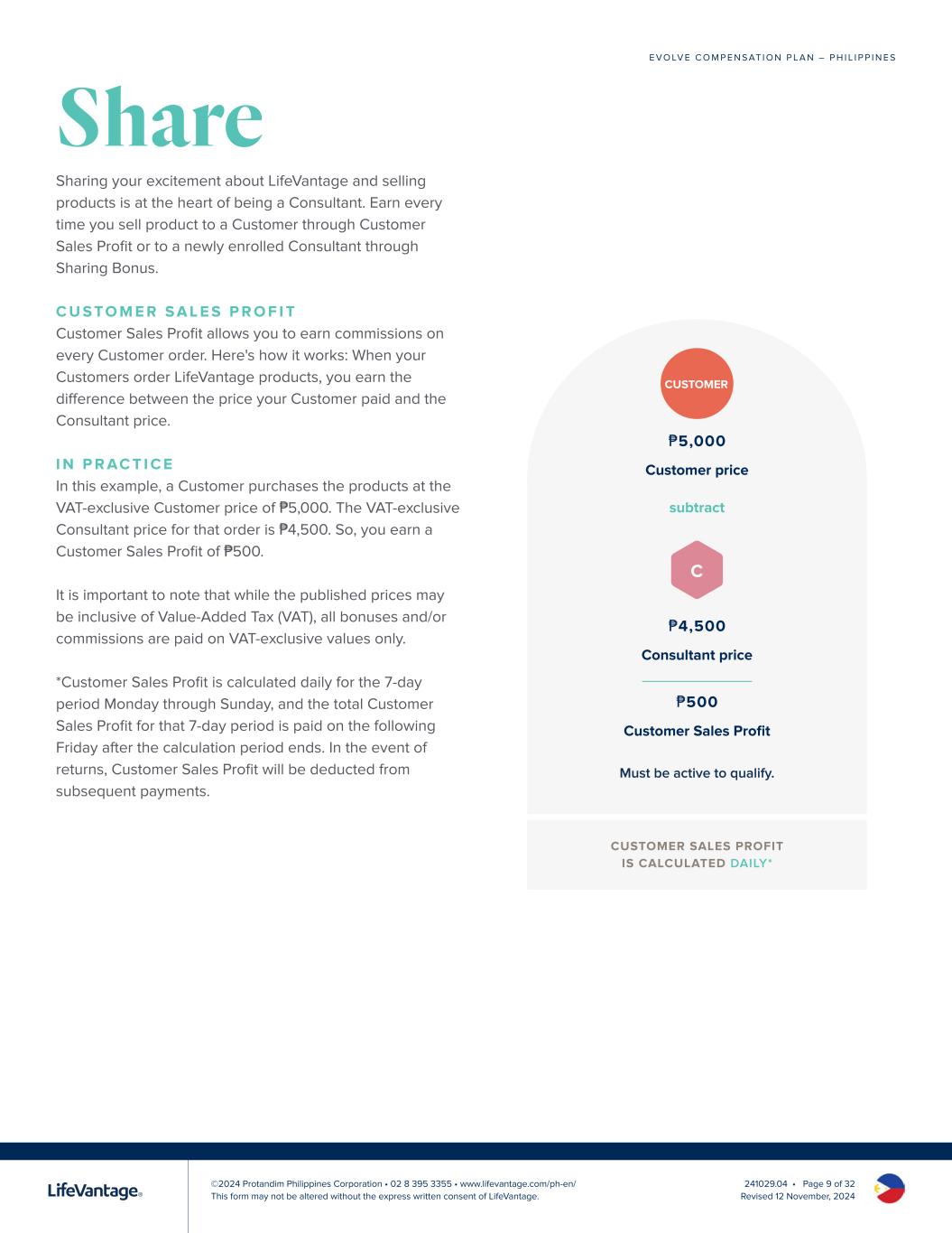 ©2024 Protandim Philippines Corporation • 02 8 395 3355 • www.lifevantage.com/ph-en/ This form may not be altered without the express written consent of LifeVantage. E V O LV E C O M P E N S AT I O N P L A N – P H I L I P P I N E S 241029.04 • Page 9 of 32 Revised 12 November, 2024 Share Sharing your excitement about LifeVantage and selling products is at the heart of being a Consultant. Earn every time you sell product to a Customer through Customer Sales Profit or to a newly enrolled Consultant through Sharing Bonus. C U S TO M E R S A L E S P R O F I T Customer Sales Profit allows you to earn commissions on every Customer order. Here's how it works: When your Customers order LifeVantage products, you earn the difference between the price your Customer paid and the Consultant price. I N P R AC T I C E In this example, a Customer purchases the products at the VAT-exclusive Customer price of ₱5,000. The VAT-exclusive Consultant price for that order is ₱4,500. So, you earn a Customer Sales Profit of ₱500. It is important to note that while the published prices may be inclusive of Value-Added Tax (VAT), all bonuses and/or commissions are paid on VAT-exclusive values only. *Customer Sales Profit is calculated daily for the 7-day period Monday through Sunday, and the total Customer Sales Profit for that 7-day period is paid on the following Friday after the calculation period ends. In the event of returns, Customer Sales Profit will be deducted from subsequent payments. ₱5,000 Customer price subtract ₱4,500 Consultant price ₱500 Customer Sales Profit CUSTOMER SALES PROFIT IS CALCULATED DAILY* CUSTOMER C Must be active to qualify.