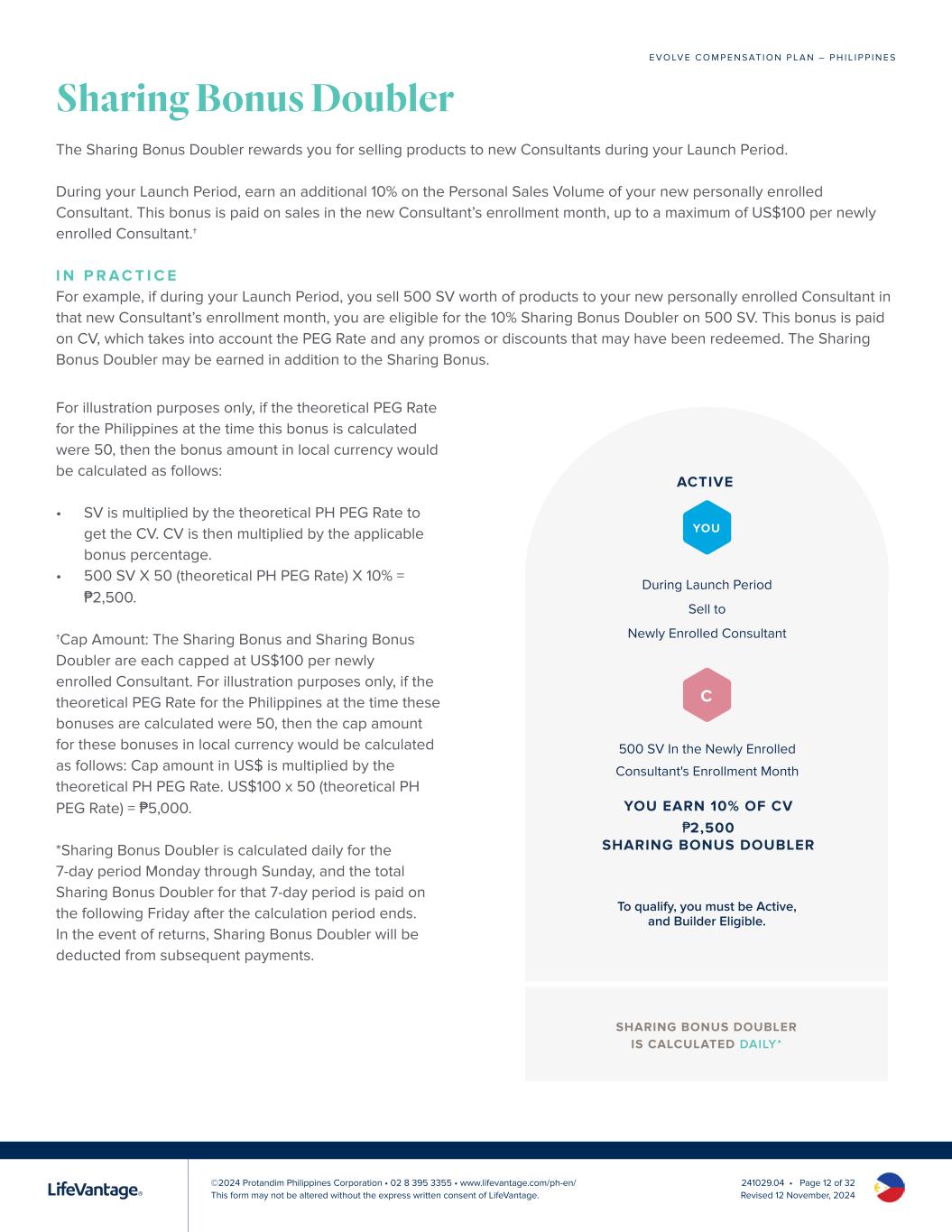 ©2024 Protandim Philippines Corporation • 02 8 395 3355 • www.lifevantage.com/ph-en/ This form may not be altered without the express written consent of LifeVantage. E V O LV E C O M P E N S AT I O N P L A N – P H I L I P P I N E S 241029.04 • Page 10 of 32 Revised 12 November, 2024 Sharing Bonus The Sharing Bonus rewards you for selling products to new Consultants. Earn 10% on the Personal Sales Volume of your new personally enrolled Consultant. This bonus is paid on sales in the new Consultant's enrollment month, up to a maximum of US$100 per newly enrolled Consultant.† I N P R AC T I C E For example, if you sell 500 SV worth of products to your new personally enrolled Consultant in that new Consultant’s enrollment month, you are eligible for the 10% Sharing Bonus on 500 SV. This bonus is paid on CV, which takes into account the PEG Rate and any promos or discounts that may have been redeemed. For illustration purposes only, if the theoretical PEG Rate for the Philippines at the time this bonus is calculated were 50, then the bonus amount in local currency would be calculated as follows: SHARING BONUS IS CALCULATED DAILY* Sell to Newly Enrolled Consultant 500 SV In the Newly Enrolled Consultant's Enrollment Month ACTIVE YOU EARN 10% OF CV ₱2,500 SHARING BONUS YOU Must be active to qualify. C • SV is multiplied by the theoretical PH PEG Rate to get the CV. CV is then multiplied by the applicable bonus percentage. • 500 SV X 50 (theoretical PH PEG Rate) X 10% = ₱2,500. *Sharing Bonus is calculated daily for the 7-day period Monday through Sunday, and the total Sharing Bonus for that 7-day period is paid on the following Friday after the calculation period ends. In the event of returns, Sharing Bonus will be deducted from subsequent payments.