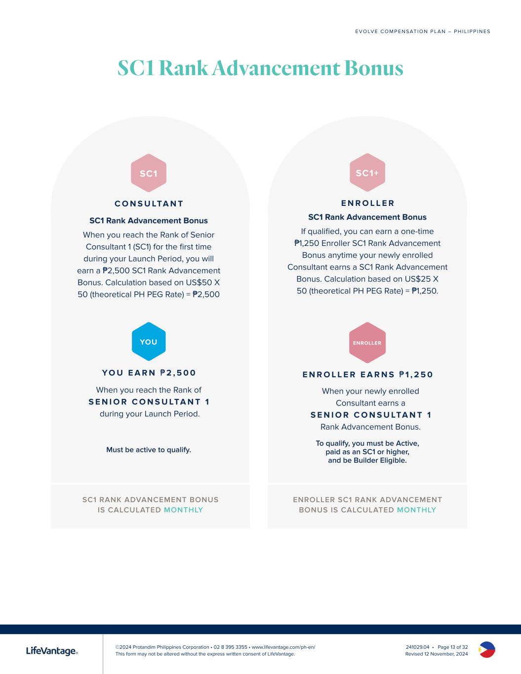 ©2024 Protandim Philippines Corporation • 02 8 395 3355 • www.lifevantage.com/ph-en/ This form may not be altered without the express written consent of LifeVantage. E V O LV E C O M P E N S AT I O N P L A N – P H I L I P P I N E S 241029.04 • Page 13 of 32 Revised 12 November, 2024 SC1 RANK ADVANCEMENT BONUS IS CALCULATED MONTHLY SC1 Rank Advancement Bonus ENROLLER SC1 RANK ADVANCEMENT BONUS IS CALCULATED MONTHLY Y O U E A R N ₱2 , 5 0 0 When you reach the Rank of S E N I O R C O N S U LTA N T 1 during your Launch Period. YOU Must be active to qualify. SC1 C O N S U LTA N T SC1 Rank Advancement Bonus When you reach the Rank of Senior Consultant 1 (SC1) for the first time during your Launch Period, you will earn a ₱2,500 SC1 Rank Advancement Bonus. Calculation based on US$50 X 50 (theoretical PH PEG Rate) = ₱2,500 E N R O L L E R E A R N S ₱ 1 , 2 5 0 When your newly enrolled Consultant earns a S E N I O R C O N S U LTA N T 1 Rank Advancement Bonus. ENROLLER SC1+ E N R O L L E R SC1 Rank Advancement Bonus If qualified, you can earn a one-time ₱1,250 Enroller SC1 Rank Advancement Bonus anytime your newly enrolled Consultant earns a SC1 Rank Advancement Bonus. Calculation based on US$25 X 50 (theoretical PH PEG Rate) = ₱1,250. To qualify, you must be Active, paid as an SC1 or higher, and be Builder Eligible.