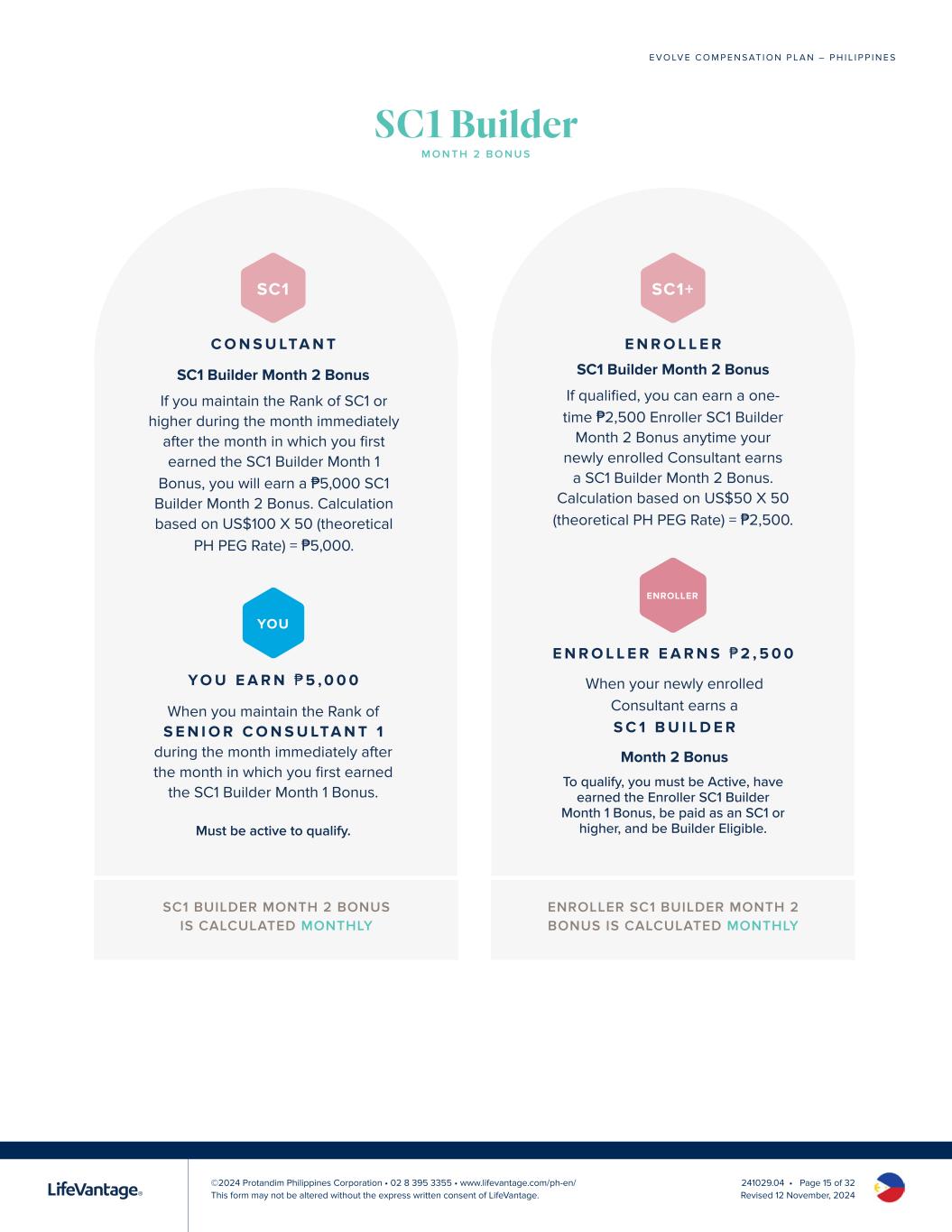 ©2024 Protandim Philippines Corporation • 02 8 395 3355 • www.lifevantage.com/ph-en/ This form may not be altered without the express written consent of LifeVantage. E V O LV E C O M P E N S AT I O N P L A N – P H I L I P P I N E S 241029.04 • Page 14 of 32 Revised 12 November, 2024 SC1 BUILDER MONTH 1 BONUS IS CALCULATED MONTHLY ENROLLER SC1 BUILDER MONTH 1 BONUS IS CALCULATED MONTHLY Y O U E A R N ₱2 , 5 0 0 When you maintain the Rank of S E N I O R C O N S U LTA N T 1 during the month immediately after the month in which you first earned the SC1 Rank Advancement Bonus. YOU Must be active to qualify. SC1 C O N S U LTA N T SC1 Builder Month 1 Bonus If you maintain the Rank of SC1 or higher during the month immediately after the month in which you first earned the SC1 Rank Advancement Bonus, you will earn a ₱2,500 SC1 Builder Month 1 Bonus. Calculation based on US$50 X 50 (theoretical PH PEG Rate) = ₱2,500. E N R O L L E R E A R N S ₱ 1 , 2 5 0 When your newly enrolled Consultant earns a S C 1 B U I L D E R Month 1 Bonus ENROLLER SC1+ E N R O L L E R SC1 Builder Month 1 Bonus If qualified, you can earn a one- time ₱1,250 Enroller SC1 Builder Month 1 Bonus anytime your newly enrolled Consultant earns a SC1 Builder Month 1 Bonus. Calculation based on US$25 X 50 (theoretical PH PEG Rate) = ₱1,250. To qualify, you must be Active, have earned the Enroller SC1 Rank Advancement Bonus, be paid as an SC1 or higher, and be Builder Eligible. SC1 Builder M O N T H 1 B O N U S