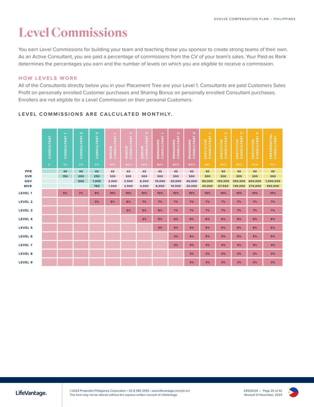 ©2024 Protandim Philippines Corporation • 02 8 395 3355 • www.lifevantage.com/ph-en/ This form may not be altered without the express written consent of LifeVantage. E V O LV E C O M P E N S AT I O N P L A N – P H I L I P P I N E S 241029.04 • Page 20 of 32 Revised 12 November, 2024 Level Commissions You earn Level Commissions for building your team and teaching those you sponsor to create strong teams of their own. As an Active Consultant, you are paid a percentage of commissions from the CV of your team’s sales. Your Paid-as Rank determines the percentages you earn and the number of levels on which you are eligible to receive a commission. H O W L E V E L S W O R K All of the Consultants directly below you in your Placement Tree are your Level 1. Consultants are paid Customers Sales Profit on personally enrolled Customer purchases and Sharing Bonus on personally enrolled Consultant purchases. Enrollers are not eligible for a Level Commission on their personal Customers. L E V E L C O M M I S S I O N S A R E C A LC U L AT E D M O N T H LY. C O N S U LT A N T C O N S U LT A N T 1 C O N S U LT A N T 2 C O N S U LT A N T 3 S E N IO R C O N S U LT A N T 1 S E N IO R C O N S U LT A N T 2 S E N IO R C O N S U LT A N T 3 M A N A G IN G C O N S U LT A N T 1 M A N A G IN G C O N S U LT A N T 2 M A N A G IN G C O N S U LT A N T 3 E X E C U T IV E C O N S U LT A N T 1 E X E C U T IV E C O N S U LT A N T 2 E X E C U T IV E C O N S U LT A N T 3 E X E C U T IV E C O N S U LT A N T 4 P R E S ID E N T IA L C O N S U LT A N T C C1 C2 C3 SC1 SC2 SC3 MC1 MC2 MC3 EC1 EC2 EC3 EC 4 PC1 40 40 40 40 40 40 40 40 40 40 40 40 40 40 150 200 250 300 300 300 300 300 300 300 300 300 300 300 500 1,000 2,000 3,500 6,000 10,000 20,000 40,000 80,000 150,000 300,000 600,000 1,000,000 750 1,500 2,500 4,000 6,000 10,000 20,000 40,000 67,500 135,000 270,000 450,000 LEVEL 1 5% 7% 9% 10% 10% 10% 10% 10% 10% 10% 10% 10% 10% 10% LEVEL 2 3% 5% 6% 7% 7% 7% 7% 7% 7% 7% 7% 7% LEVEL 3 3% 5% 6% 7% 7% 7% 7% 7% 7% 7% LEVEL 4 3% 5% 6% 6% 6% 6% 6% 6% 6% LEVEL 5 3% 5% 6% 6% 6% 6% 6% 6% LEVEL 6 3% 4% 5% 5% 5% 5% 5% LEVEL 7 3% 4% 4% 4% 4% 4% 4% LEVEL 8 3% 3% 3% 3% 3% 3% LEVEL 9 3% 3% 3% 3% 3% 3% PPR SVR GSV MVR