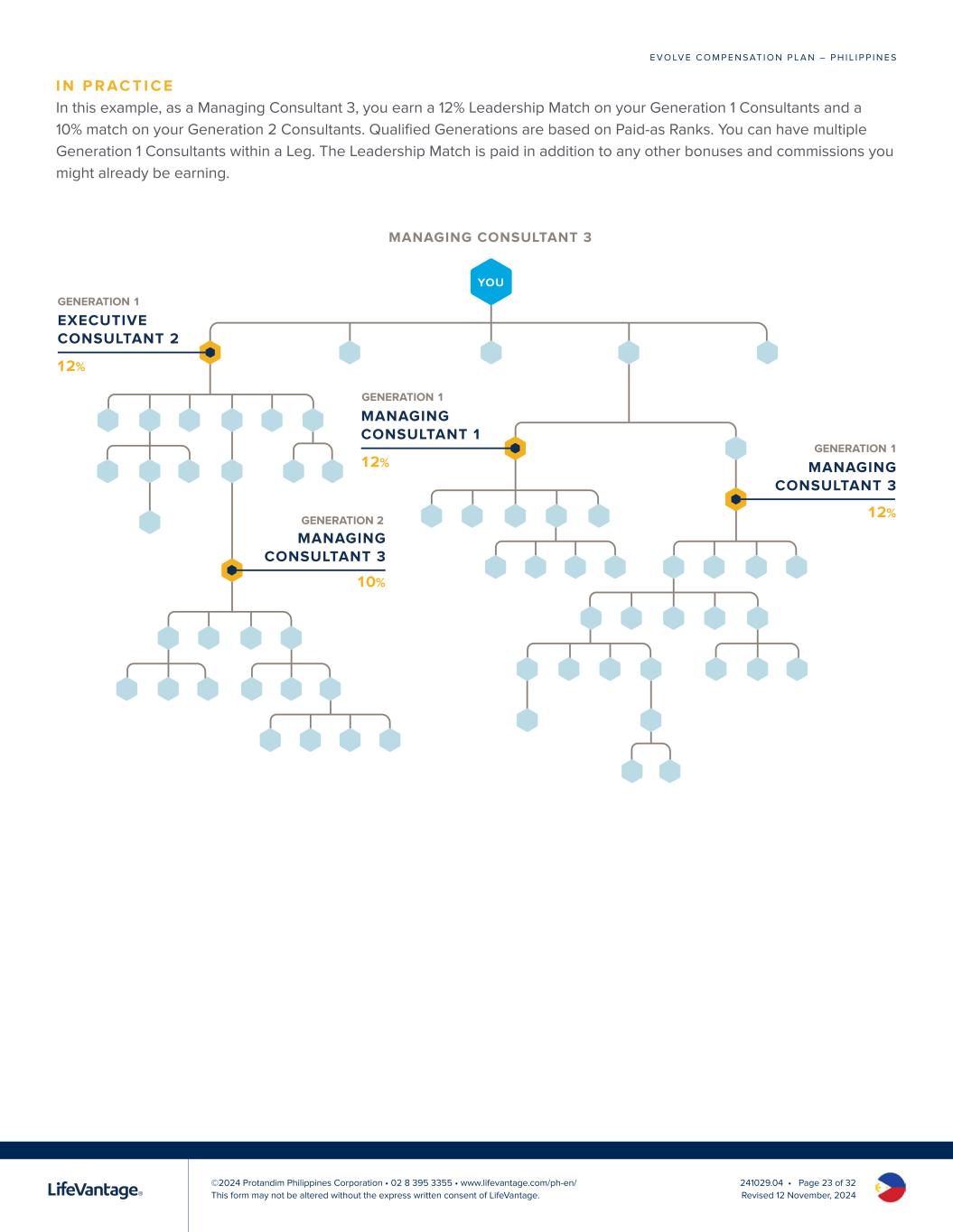 ©2024 Protandim Philippines Corporation • 02 8 395 3355 • www.lifevantage.com/ph-en/ This form may not be altered without the express written consent of LifeVantage. E V O LV E C O M P E N S AT I O N P L A N – P H I L I P P I N E S 241029.04 • Page 23 of 32 Revised 12 November, 2024 I N P R AC T I C E In this example, as a Managing Consultant 3, you earn a 12% Leadership Match on your Generation 1 Consultants and a 10% match on your Generation 2 Consultants. Qualified Generations are based on Paid-as Ranks. You can have multiple Generation 1 Consultants within a Leg. The Leadership Match is paid in addition to any other bonuses and commissions you might already be earning. YOU MANAGING CONSULTANT 3 10% 12% EXECUTIVE CONSULTANT 2 12% MANAGING CONSULTANT 1 12% MANAGING CONSULTANT 3 MANAGING CONSULTANT 3 GENERATION 1 GENERATION 1 GENERATION 2 GENERATION 1