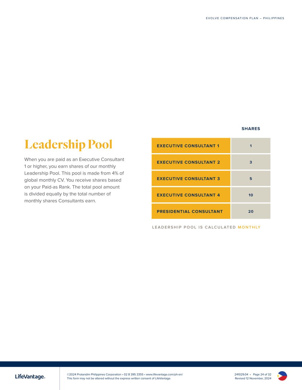 ©2024 Protandim Philippines Corporation • 02 8 395 3355 • www.lifevantage.com/ph-en/ This form may not be altered without the express written consent of LifeVantage. E V O LV E C O M P E N S AT I O N P L A N – P H I L I P P I N E S 241029.04 • Page 24 of 32 Revised 12 November, 2024 Leadership Pool When you are paid as an Executive Consultant 1 or higher, you earn shares of our monthly Leadership Pool. This pool is made from 4% of global monthly CV. You receive shares based on your Paid-as Rank. The total pool amount is divided equally by the total number of monthly shares Consultants earn. SHARES EXECUTIVE CONSULTANT 1 1 EXECUTIVE CONSULTANT 2 3 EXECUTIVE CONSULTANT 3 5 EXECUTIVE CONSULTANT 4 10 PRESIDENTIAL CONSULTANT 20 L E A D E R S H I P P O O L I S C A LC U L AT E D M O N T H LY
