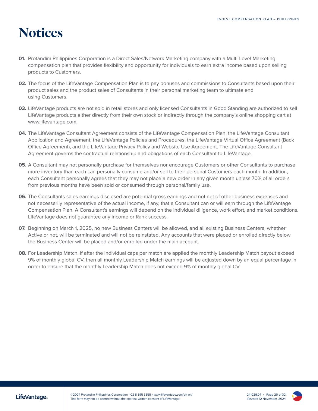 ©2024 Protandim Philippines Corporation • 02 8 395 3355 • www.lifevantage.com/ph-en/ This form may not be altered without the express written consent of LifeVantage. E V O LV E C O M P E N S AT I O N P L A N – P H I L I P P I N E S 241029.04 • Page 25 of 32 Revised 12 November, 2024 Notices 01. Protandim Philippines Corporation is a Direct Sales/Network Marketing company with a Multi-Level Marketing compensation plan that provides flexibility and opportunity for individuals to earn extra income based upon selling products to Customers. 02. The focus of the LifeVantage Compensation Plan is to pay bonuses and commissions to Consultants based upon their product sales and the product sales of Consultants in their personal marketing team to ultimate end using Customers. 03. LifeVantage products are not sold in retail stores and only licensed Consultants in Good Standing are authorized to sell LifeVantage products either directly from their own stock or indirectly through the company’s online shopping cart at www.lifevantage.com. 04. The LifeVantage Consultant Agreement consists of the LifeVantage Compensation Plan, the LifeVantage Consultant Application and Agreement, the LifeVantage Policies and Procedures, the LifeVantage Virtual Office Agreement (Back Office Agreement), and the LifeVantage Privacy Policy and Website Use Agreement. The LifeVantage Consultant Agreement governs the contractual relationship and obligations of each Consultant to LifeVantage. 05. A Consultant may not personally purchase for themselves nor encourage Customers or other Consultants to purchase more inventory than each can personally consume and/or sell to their personal Customers each month. In addition, each Consultant personally agrees that they may not place a new order in any given month unless 70% of all orders from previous months have been sold or consumed through personal/family use. 06. The Consultants sales earnings disclosed are potential gross earnings and not net of other business expenses and not necessarily representative of the actual income, if any, that a Consultant can or will earn through the LifeVantage Compensation Plan. A Consultant's earnings will depend on the individual diligence, work effort, and market conditions. LifeVantage does not guarantee any income or Rank success. 07. Beginning on March 1, 2025, no new Business Centers will be allowed, and all existing Business Centers, whether Active or not, will be terminated and will not be reinstated. Any accounts that were placed or enrolled directly below the Business Center will be placed and/or enrolled under the main account. 08. For Leadership Match, if after the individual caps per match are applied the monthly Leadership Match payout exceed 9% of monthly global CV, then all monthly Leadership Match earnings will be adjusted down by an equal percentage in order to ensure that the monthly Leadership Match does not exceed 9% of monthly global CV.