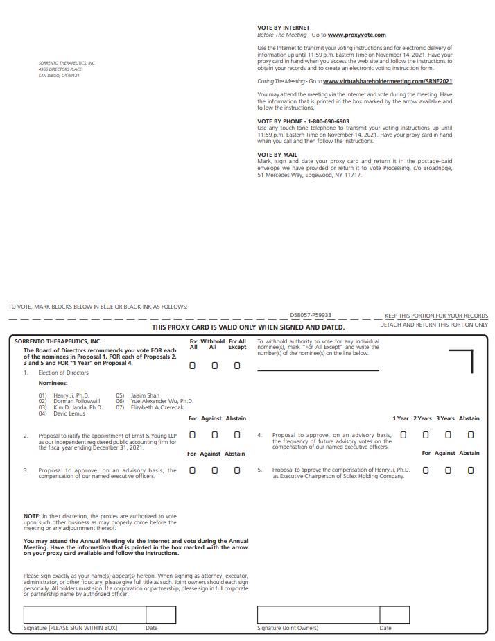 The Board of Directors (the “Board”) of Sorrento Therapeutics, Inc. (“Sorrento” or the “Company”) is soliciting your proxy to vote at the Annual Meeting of Stockholders (the “Annual Meeting”) to be held virtually, via live webcast at www.virtualshareholdermeeting.com/SRNE2021, on November 15, 2021 at 12:00 p.m. Pacific Time, including at any adjournments or postponements of the Annual Meeting. You are invited to attend the Annual Meeting to vote on the proposals described in this proxy statement. However, you do not need to attend the Annual Meeting to vote your shares. Instead, you may simply complete, sign and return the enclosed proxy card if you received paper copies of the proxy materials, or follow the instructions below to submit your proxy over the Internet.
