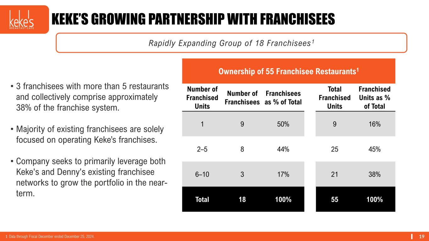 27 (5.3%) (3.8%) (4.0%) (4.6%) (0.9%) 4.1% Q2 23 Q4 23 Q1 24 Q2 24 Q3 24 Q4 24 (3.4%) 0.7% (1.1%) (4.4%) (1.7%) (3.7%) Q3 23 Q4 23 Q1 24 Q2 24 Q3 24 Q4 24 KEKE’S FRANCHISED AND COMPANY RESTAURANT SALES 1 Keke’s 2022 restaurant AUVs are annualized based on the reported Average Unit Volumes following acquisition. 2 Same-restaurant sales include sales at company restaurants and non-consolidated franchised and licensed restaurants that were open during the comparable periods noted. Total operating revenue is limited to company restaurant sales and royalties, advertising revenue, initial and other fees and occupancy revenue from non-consolidated franchised and licensed restaurants. Accordingly, domestic franchise same-restaurant sales and domestic system-wide same-restaurant sales should be considered as a supplement to, not a substitute for, the Company’s results as reported under GAAP. $1.5 $1.3 $1.8 $1.8 $1.8 $1.8 2019 2020 2021 2022 2023 2024 $M s $1.7 $1.3 $1.8 $1.7 $1.8 $1.7 2019 2020 2021 2022 2023 2024 $M s KEKE’S FRANCHISE RESTAURANTS AUVs1,2 KEKE’S FRANCHISED SAME-RESTAURANT SALES2 KEKE’S COMPANY RESTAURANTS AUVs1,2 KEKE’S COMPANY SAME-RESTAURANT SALES2