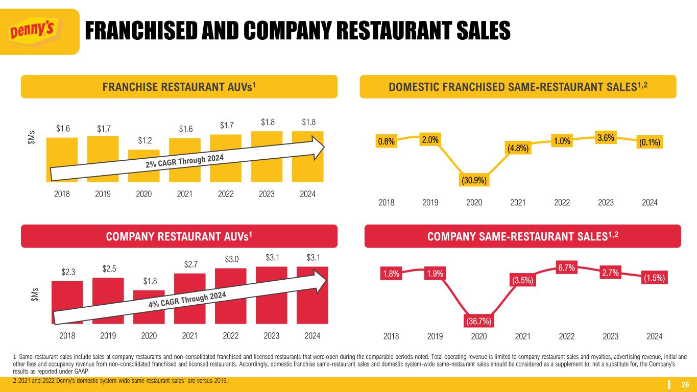 24 Rise of a New Day 5% - 7% Adjusted EBITDA* Growth CAGR Flat to Slightly Positive Same- Restaurant Sales* 3% Net Unit Growth CAGR 5% - 6% G&A Reduction Over Next 12 Months Balancing Seed & Feed with Share Repurchases 2.5x – 3.5x Debt Leverage LONG-RANGE OUTLOOK1 0% - 1% UNIT GROWTH CAGR $2.2M AUV TARGET Mid-Teens COMPANY MARGIN TARGET 25% - 30% UNIT GROWTH CAGR $2.2M AUV TARGET Upper-Teens COMPANY MARGIN TARGET 1. As presented on 10/22/24 in conjunction with Denny’s Corporation Investor Day. *Same-restaurant sales include sales at company restaurants and non-consolidated franchised and licensed restaurants that were open during the comparable periods noted. Total operating revenue is limited to company restaurant sales and royalties, advertising revenue, initial and other fees and occupancy revenue from non-consolidated franchised and licensed restaurants. Accordingly, domestic franchise same-restaurant sales and domestic system-wide same-restaurant sales should be considered as a supplement to, not a substitute for, the Company’s results as reported under GAAP. Additionally, see Appendix for reconciliation of Net Income (Loss) to Non-GAAP Financial Measures, as well as the reconciliation of Operating Income to Non-GAAP Financial Measures.