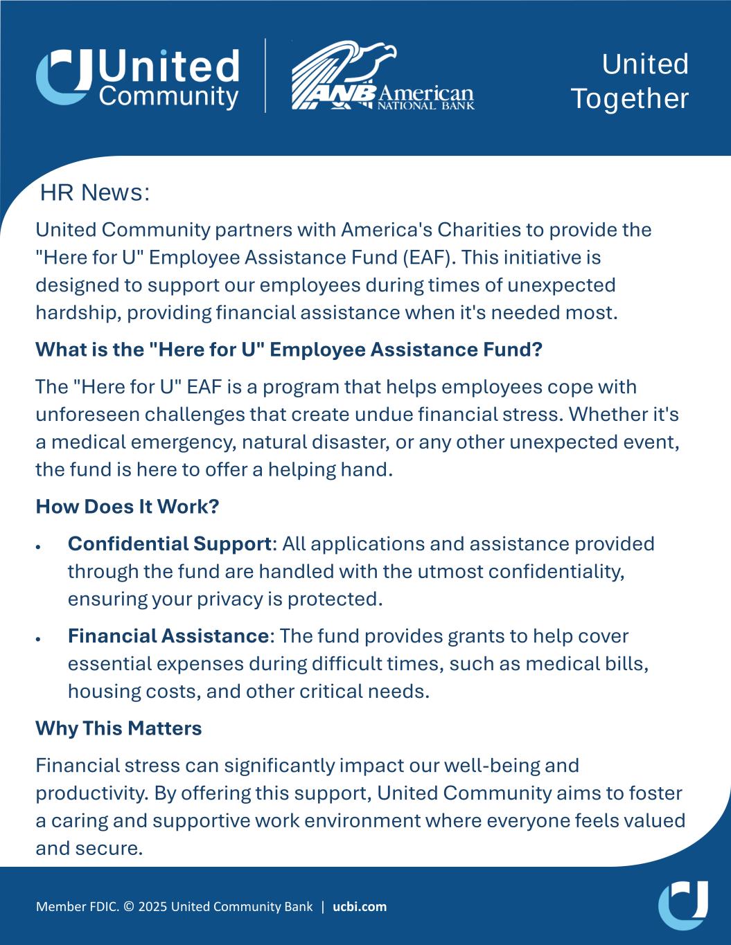 Member FDIC. © 2025 United Community Bank | ucbi.com United Together HR News: United Community partners with America's Charities to provide the "Here for U" Employee Assistance Fund (EAF). This initiative is designed to support our employees during times of unexpected hardship, providing financial assistance when it's needed most. What is the "Here for U" Employee Assistance Fund? The "Here for U" EAF is a program that helps employees cope with unforeseen challenges that create undue financial stress. Whether it's a medical emergency, natural disaster, or any other unexpected event, the fund is here to offer a helping hand. How Does It Work? • Confidential Support: All applications and assistance provided through the fund are handled with the utmost confidentiality, ensuring your privacy is protected. • Financial Assistance: The fund provides grants to help cover essential expenses during difficult times, such as medical bills, housing costs, and other critical needs. Why This Matters Financial stress can significantly impact our well-being and productivity. By offering this support, United Community aims to foster a caring and supportive work environment where everyone feels valued and secure.