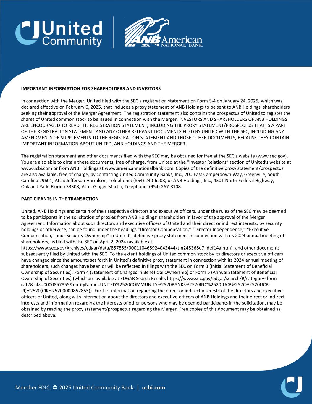 Member FDIC. © 2025 United Community Bank | ucbi.com IMPORTANT INFORMATION FOR SHAREHOLDERS AND INVESTORS In connection with the Merger, United filed with the SEC a registration statement on Form S-4 on January 24, 2025, which was declared effective on February 6, 2025, that includes a proxy statement of ANB Holdings to be sent to ANB Holdings’ shareholders seeking their approval of the Merger Agreement. The registration statement also contains the prospectus of United to register the shares of United common stock to be issued in connection with the Merger. INVESTORS AND SHAREHOLDERS OF ANB HOLDINGS ARE ENCOURAGED TO READ THE REGISTRATION STATEMENT, INCLUDING THE PROXY STATEMENT/PROSPECTUS THAT IS A PART OF THE REGISTRATION STATEMENT AND ANY OTHER RELEVANT DOCUMENTS FILED BY UNITED WITH THE SEC, INCLUDING ANY AMENDMENTS OR SUPPLEMENTS TO THE REGISTRATION STATEMENT AND THOSE OTHER DOCUMENTS, BECAUSE THEY CONTAIN IMPORTANT INFORMATION ABOUT UNITED, ANB HOLDINGS AND THE MERGER. The registration statement and other documents filed with the SEC may be obtained for free at the SEC’s website (www.sec.gov). You are also able to obtain these documents, free of charge, from United at the “Investor Relations” section of United’s website at www.ucbi.com or from ANB Holdings at www.americannationalbank.com. Copies of the definitive proxy statement/prospectus are also available, free of charge, by contacting United Community Banks, Inc., 200 East Camperdown Way, Greenville, South Carolina 29601, Attn: Jefferson Harralson, Telephone: (864) 240-6208, or ANB Holdings, Inc., 4301 North Federal Highway, Oakland Park, Florida 33308, Attn: Ginger Martin, Telephone: (954) 267-8108. PARTICIPANTS IN THE TRANSACTION United, ANB Holdings and certain of their respective directors and executive officers, under the rules of the SEC may be deemed to be participants in the solicitation of proxies from ANB Holdings’ shareholders in favor of the approval of the Merger Agreement. Information about such directors and executive officers of United and their direct or indirect interests, by security holdings or otherwise, can be found under the headings “Director Compensation,” “Director Independence,” “Executive Compensation,” and “Security Ownership” in United’s definitive proxy statement in connection with its 2024 annual meeting of shareholders, as filed with the SEC on April 2, 2024 (available at: https://www.sec.gov/Archives/edgar/data/857855/000110465924042444/tm248368d7_def14a.htm), and other documents subsequently filed by United with the SEC. To the extent holdings of United common stock by its directors or executive officers have changed since the amounts set forth in United’s definitive proxy statement in connection with its 2024 annual meeting of shareholders, such changes have been or will be reflected in filings with the SEC on Form 3 (Initial Statement of Beneficial Ownership of Securities), Form 4 (Statement of Changes in Beneficial Ownership) or Form 5 (Annual Statement of Beneficial Ownership of Securities) (which are available at EDGAR Search Results https://www.sec.gov/edgar/search/#/category=form- cat2&ciks=0000857855&entityName=UNITED%2520COMMUNITY%2520BANKS%2520INC%2520(UCB%252C%2520UCB- PI)%2520(CIK%25200000857855)). Further information regarding the direct or indirect interests of the directors and executive officers of United, along with information about the directors and executive officers of ANB Holdings and their direct or indirect interests and information regarding the interests of other persons who may be deemed participants in the solicitation, may be obtained by reading the proxy statement/prospectus regarding the Merger. Free copies of this document may be obtained as described above.