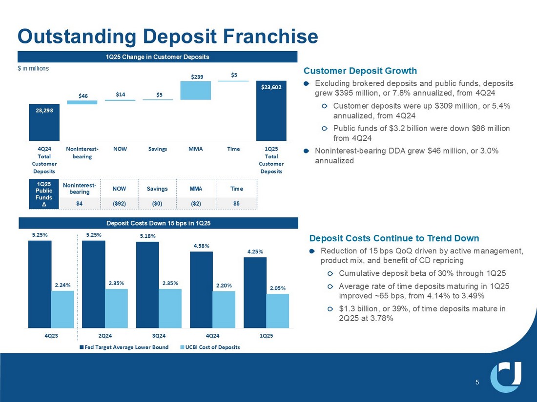 5.25% ϱ͘Ϯϱ й 5.18% 4.58% ϰ͘Ϯϱ й Ϯ͘Ϯϰ й 2.35% 2.35% 2.20% Ϯ͘Ϭϱ й 4Q23 2Q24 3Q24 4Q24 1Q25 Fed Target Average Lower Bound UCBI Cost of Deposits Outstanding Deposit Franchise Deposit Costs Down 15 bps in 1Q25 &XVWRPHU'HSRVLW*URZWK ([FOXGLQJEURNHUHGGHSRVLWVDQGSXEOLFIXQGVGHSRVLWV JUHZ PLOOLRQRU DQQXDOL]HGIURP 4 &XVWRPHUGHSRVLWVZHUHXS PLOOLRQRU DQQXDOL]HGIURP 4 3XEOLFIXQGVRI ELOOLRQZHUHGRZQ PLOOLRQ IURP 4 1RQLQWHUHVW EHDULQJ''$JUHZ PLOOLRQRU DQQXDOL]HG 1Q25 Change in Customer Deposits $ 23,602 23,293 Ψ ϰϲ $14 $5 Ψ Ϯϯϵ Ψ ϱ 4Q24 Total Customer Deposits Noninterest- bearing NOW Savings MMA Time 1Q25 Total Customer Deposits $ in millions Deposit Costs Continue to Trend Down Reduction of 15 bps QoQ driven by active management, product mix, and benefit of CD repricing Cumulative deposit beta of 30% through 1Q25 Average rate of time deposits maturing in 1Q25 improved ~65 bps, from 4.14% to 3.49% $1.3 billion, or 39%, of time deposits mature in 2Q25 at 3.78% Time MMA Savings NOW Noninterest - bearing 1Q25 Public Funds Δ $5 ($2) ($0) ($92) $4 EB0 EB1 EB2 EB3 AK4 EB5