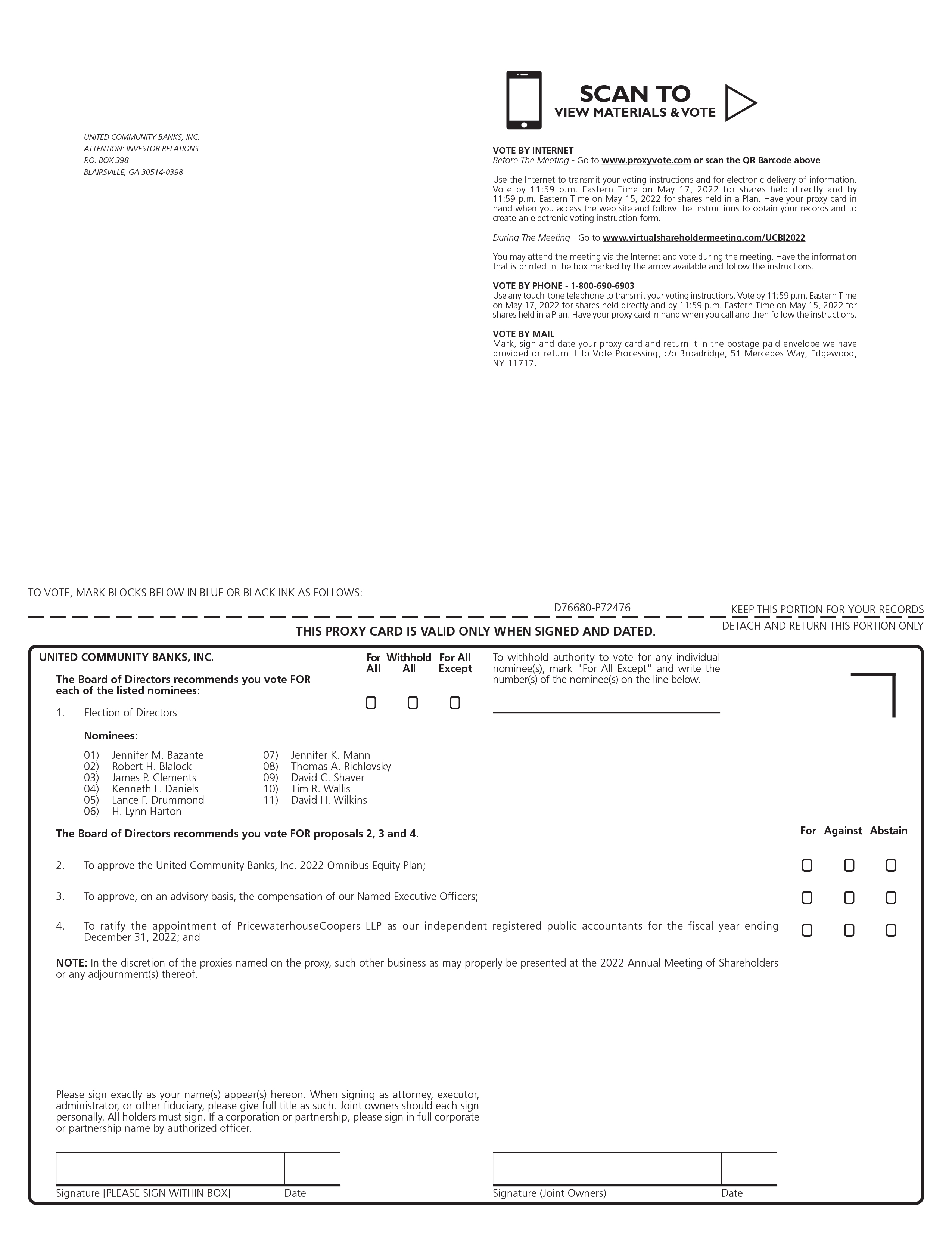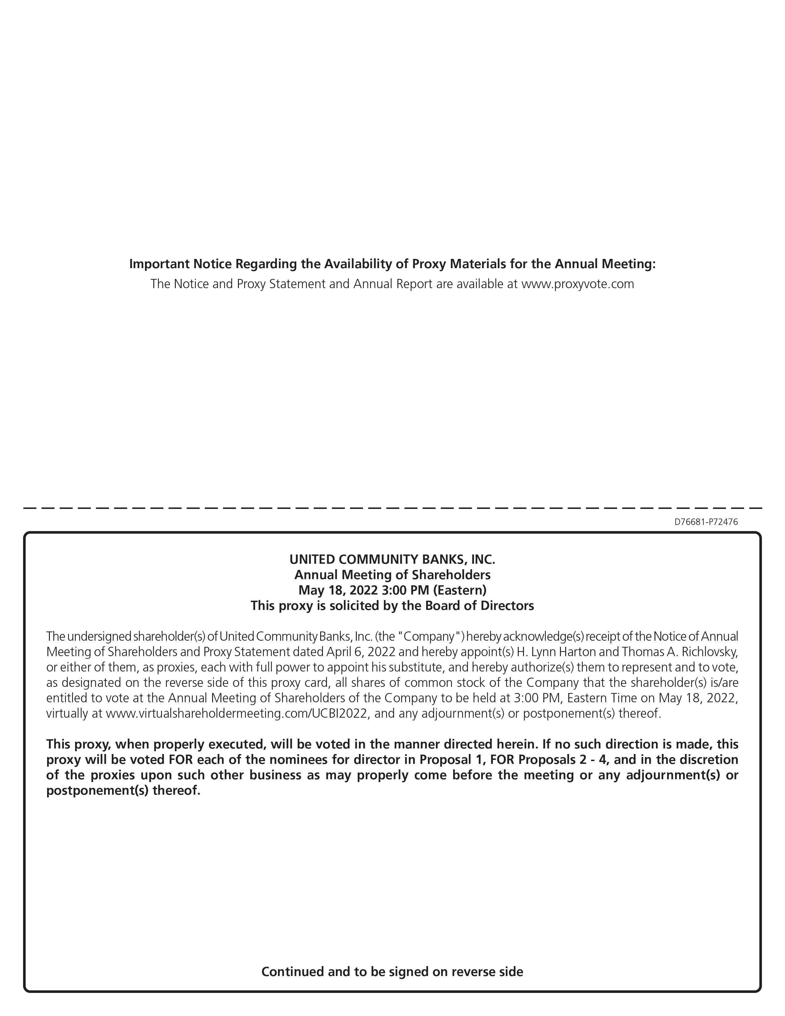 | Internet Availability of Proxy Materials: | Important Notice Regarding the Availability of Proxy Materials for the Shareholder Meeting to be Held on May 18, 2022: The solicitation of the enclosed proxy is made on behalf of the Board of Directors for use at the Shareholder Meeting to be held on May 18, 2022. It is expected that this Proxy Statement and related materials will first be provided to shareholders on or about April 6, 2022. A copy of this Notice of Virtual Annual Meeting of Shareholders of United Community Banks, Inc. and Proxy Statement is available at: www.virtualshareholdermeeting.com/ucbi2022. Also available at this website is our 2021 Annual Report and our Annual Report on Form 10-K for the year ended December 31, 2021. | |