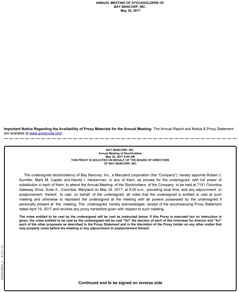The 2016 Annual Meeting (the “Annual Meeting”) of Stockholders of Bay Bancorp, Inc., a Maryland corporation (the “Company”), will be held at 7151 Columbia Gateway Drive, Suite A, Columbia, Maryland 21046, on May 24, 2017, at 9:00 a.m., prevailing local time, for the following purposes: