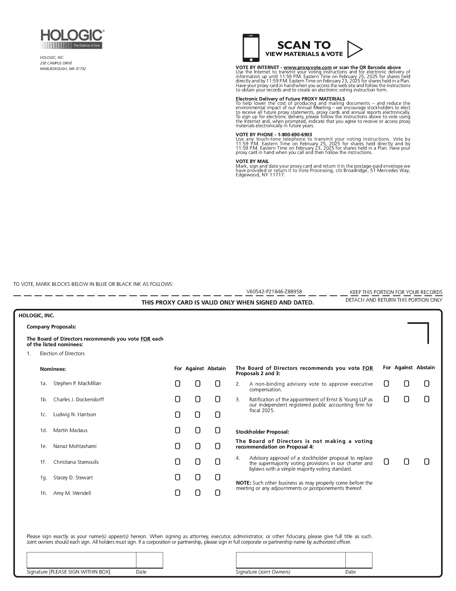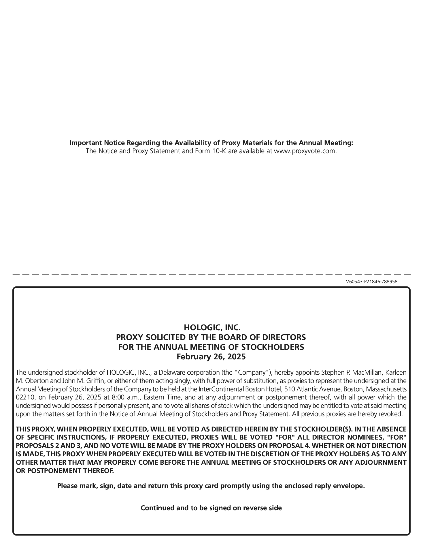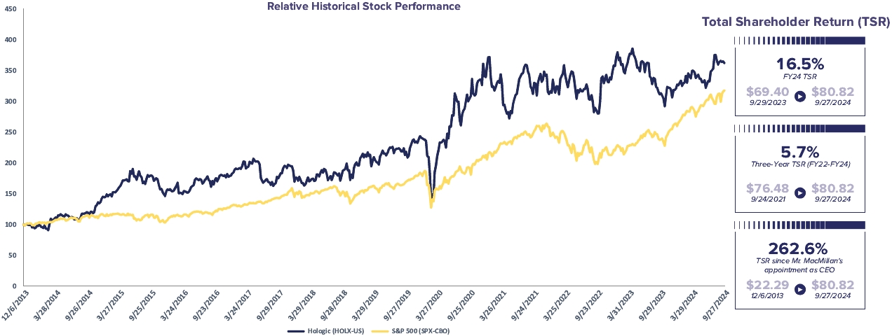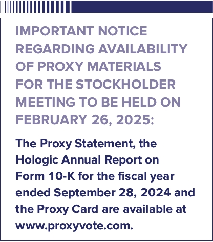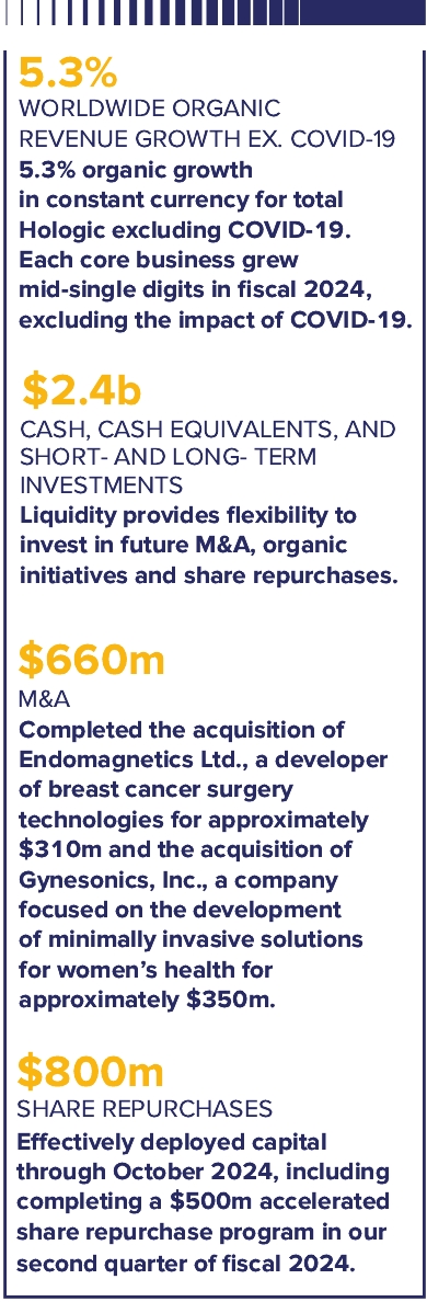 |   | Fiscal 2024 was another good year for Hologic, as we continued to build on our strong foundation. Our teams around the world again delivered exceptional performance fueling significant growth. Guided by our Purpose, Passion and Promise, we delivered on our financial and operational commitments and reaffirmed our core philosophy to provide the best technologies and services for our customers and patients.