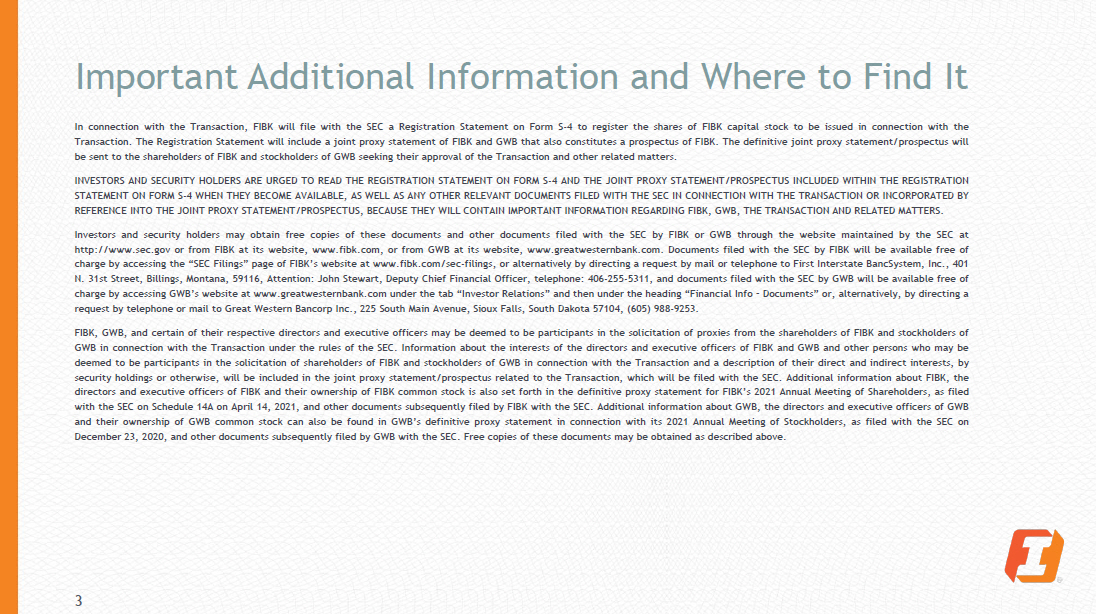 Important Additional Information and Where to Find It 3 In connection with the Transaction, FIBK will file with the SEC a Registration Statement on Form S - 4 to register the shares of FIBK capital stock to be issued in connection with the Transaction . The Registration Statement will include a joint proxy statement of FIBK and GWB that also constitutes a prospectus of FIBK . The definitive joint proxy statement/prospectus will be sent to the shareholders of FIBK and stockholders of GWB seeking their approval of the Transaction and other related matters . INVESTORS AND SECURITY HOLDERS ARE URGED TO READ THE REGISTRATION STATEMENT ON FORM S - 4 AND THE JOINT PROXY STATEMENT/PROSPECTUS INCLUDED WITHIN THE REGISTRATION STATEMENT ON FORM S - 4 WHEN THEY BECOME AVAILABLE, AS WELL AS ANY OTHER RELEVANT DOCUMENTS FILED WITH THE SEC IN CONNECTION WITH THE TRANSACTION OR INCORPORATED BY REFERENCE INTO THE JOINT PROXY STATEMENT/PROSPECTUS, BECAUSE THEY WILL CONTAIN IMPORTANT INFORMATION REGARDING FIBK, GWB, THE TRANSACTION AND RELATED MATTERS . Investors and security holders may obtain free copies of these documents and other documents filed with the SEC by FIBK or GWB through the website maintained by the SEC at http : //www . sec . gov or from FIBK at its website, www . fibk . com, or from GWB at its website, www . greatwesternbank . com . Documents filed with the SEC by FIBK will be available free of charge by accessing the “SEC Filings” page of FIBK’s website at www . fibk . com/sec - filings, or alternatively by directing a request by mail or telephone to First Interstate BancSystem, Inc . , 401 N . 31 st Street, Billings, Montana, 59116 , Attention : John Stewart, Deputy Chief Financial Officer, telephone : 406 - 255 - 5311 , and documents filed with the SEC by GWB will be available free of charge by accessing GWB’s website at www . greatwesternbank . com under the tab “Investor Relations” and then under the heading “Financial Info – Documents” or, alternatively, by directing a request by telephone or mail to Great Western Bancorp Inc . , 225 South Main Avenue, Sioux Falls, South Dakota 57104 , ( 605 ) 988 - 9253 . FIBK, GWB, and certain of their respective directors and executive officers may be deemed to be participants in the solicitation of proxies from the shareholders of FIBK and stockholders of GWB in connection with the Transaction under the rules of the SEC . Information about the interests of the directors and executive officers of FIBK and GWB and other persons who may be deemed to be participants in the solicitation of shareholders of FIBK and stockholders of GWB in connection with the Transaction and a description of their direct and indirect interests, by security holdings or otherwise, will be included in the joint proxy statement/prospectus related to the Transaction, which will be filed with the SEC . Additional information about FIBK, the directors and executive officers of FIBK and their ownership of FIBK common stock is also set forth in the definitive proxy statement for FIBK’s 2021 Annual Meeting of Shareholders, as filed with the SEC on Schedule 14 A on April 14 , 2021 , and other documents subsequently filed by FIBK with the SEC . Additional information about GWB, the directors and executive officers of GWB and their ownership of GWB common stock can also be found in GWB’s definitive proxy statement in connection with its 2021 Annual Meeting of Stockholders, as filed with the SEC on December 23 , 2020 , and other documents subsequently filed by GWB with the SEC . Free copies of these documents may be obtained as described above .