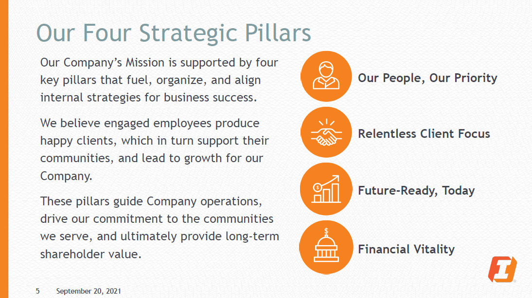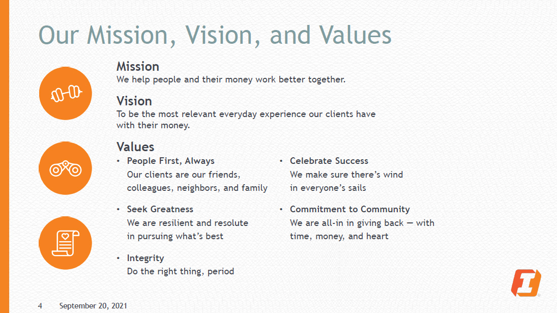 Our Mission, Vision, and Values Mission We help people and their money work better together. Vision To be the most relevant everyday experience our clients have with their money. Values • People First, Always Our clients are our friends, colleagues, neighbors, and family • Seek Greatness We are resilient and resolute in pursuing what’s best • Integrity Do the right thing, period • Celebrate Success We make sure there’s wind in everyone’s sails • Commitment to Community We are all - in in giving back — with time, money, and heart 4 September 20, 2021