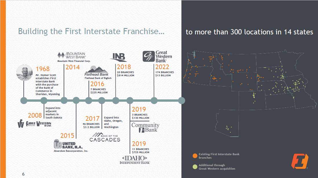 to more than 300 locations in 14 states Building the First Interstate Franchise… 1968 Mr. Homer Scott establishes First Interstate Bank with the purchase of the Bank of Commerce in Sheridan, Wyoming 2019 11 BRANCHES $725 MILLION 2018 20 BRANCHES $814 MILLION 2019 3 BRANCHES $130 MILLION 2014 Mountain West Financial Corp. 2015 Absarokee Bancorporation, Inc. 2016 7 BRANCHES $225 MILLION Flathead Bank of Bigfork 2017 46 BRANCHES $3.2 BILLION Expand into Idaho, Oregon, and Washington 2008 Expand into adjacent markets in South Dakota 2022 174 BRANCHES $13 BILLION Existing First Interstate Bank branches 6 Additional through Great Western acquisition