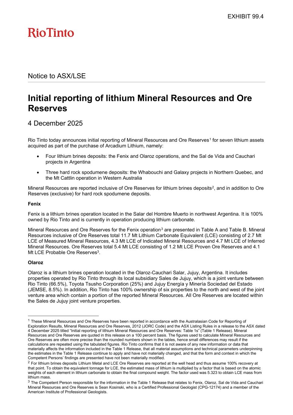 Notice to ASX/LSE Initial reporting of lithium Mineral Resources and Ore Reserves 4 December 2025 Rio Tinto today announces initial reporting of Mineral Resources and Ore Reserves1 for seven lithium assets acquired as part of the purchase of Arcadium Lithium, namely: • Four lithium brines deposits: the Fenix and Olaroz operations, and the Sal de Vida and Cauchari projects in Argentina • Three hard rock spodumene deposits: the Whabouchi and Galaxy projects in Northern Quebec, and the Mt Cattlin operation in Western Australia Mineral Resources are reported inclusive of Ore Reserves for lithium brines deposits2, and in addition to Ore Reserves (exclusive) for hard rock spodumene deposits. Fenix Fenix is a lithium brines operation located in the Salar del Hombre Muerto in northwest Argentina. It is 100% owned by Rio Tinto and is currently in operation producing lithium carbonate. Mineral Resources and Ore Reserves for the Fenix operation3 are presented in Table A and Table B. Mineral Resources inclusive of Ore Reserves total 11.7 Mt Lithium Carbonate Equivalent (LCE) consisting of 2.7 Mt LCE of Measured Mineral Resources, 4.3 Mt LCE of Indicated Mineral Resources and 4.7 Mt LCE of Inferred Mineral Resources. Ore Reserves total 5.4 Mt LCE consisting of 1.2 Mt LCE Proven Ore Reserves and 4.1 Mt LCE Probable Ore Reserves3. Olaroz Olaroz is a lithium brines operation located in the Olaroz-Cauchari Salar, Jujuy, Argentina. It includes properties operated by Rio Tinto through its local subsidiary Sales de Jujuy, which is a joint venture between Rio Tinto (66.5%), Toyota Tsusho Corporation (25%) and Jujuy Energía y Minería Sociedad del Estado (JEMSE, 8.5%). In addition, Rio Tinto has 100% ownership of six properties to the north and west of the joint venture area which contain a portion of the reported Mineral Resources. All Ore Reserves are located within the Sales de Jujuy joint venture properties. 1 These Mineral Resources and Ore Reserves have been reported in accordance with the Australasian Code for Reporting of Exploration Results, Mineral Resources and Ore Reserves, 2012 (JORC Code) and the ASX Listing Rules in a release to the ASX dated 4 December 2025 titled “Initial reporting of lithium Mineral Resources and Ore Reserves: Table 1s” (Table 1 Release). Mineral Resources and Ore Reserves are quoted in this release on a 100 percent basis. The figures used to calculate Mineral Resources and Ore Reserves are often more precise than the rounded numbers shown in the tables, hence small differences may result if the calculations are repeated using the tabulated figures. Rio Tinto confirms that it is not aware of any new information or data that materially affects the information included in the Table 1 Release, that all material assumptions and technical parameters underpinning the estimates in the Table 1 Release continue to apply and have not materially changed, and that the form and context in which the Competent Persons’ findings are presented have not been materially modified. 2 For lithium brines deposits Lithium Metal and LCE Ore Reserves are reported at the well head and thus assume 100% recovery at that point. To obtain the equivalent tonnage for LCE, the estimated mass of lithium is multiplied by a factor that is based on the atomic weights of each element in lithium carbonate to obtain the final compound weight. The factor used was 5.323 to obtain LCE mass from lithium mass. 3 The Competent Person responsible for the information in the Table 1 Release that relates to Fenix, Olaroz, Sal de Vida and Cauchari Mineral Resources and Ore Reserves is Sean Kosinski, who is a Certified Professional Geologist (CPG-12174) and a member of the American Institute of Professional Geologists. .4
