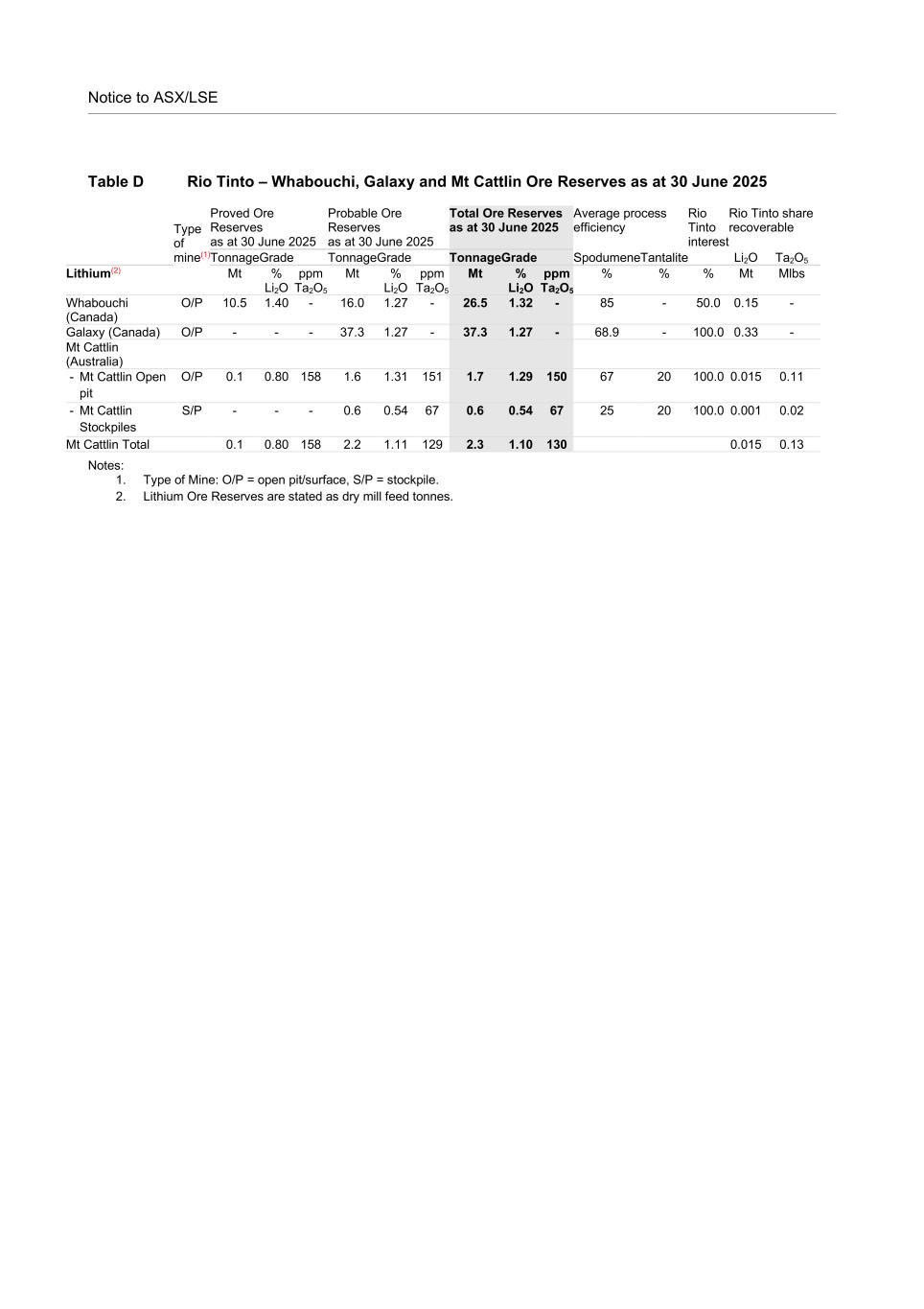 Notice to ASX/LSE Table D Rio Tinto – Whabouchi, Galaxy and Mt Cattlin Ore Reserves as at 30 June 2025 Type of mine(1) Proved Ore Reserves as at 30 June 2025 Probable Ore Reserves as at 30 June 2025 Total Ore Reserves as at 30 June 2025 Average process efficiency Rio Tinto interest Rio Tinto share recoverable Tonnage Grade Tonnage Grade Tonnage Grade Spodumene Tantalite Li2O Ta2O5 Lithium(2) Mt % Li2O ppm Ta2O5 Mt % Li2O ppm Ta2O5 Mt % Li2O ppm Ta2O5 % % % Mt Mlbs Whabouchi (Canada) O/P 10.5 1.40 - 16.0 1.27 - 26.5 1.32 - 85 - 50.0 0.15 - Galaxy (Canada) O/P - - - 37.3 1.27 - 37.3 1.27 - 68.9 - 100.0 0.33 - Mt Cattlin (Australia) - Mt Cattlin Open pit O/P 0.1 0.80 158 1.6 1.31 151 1.7 1.29 150 67 20 100.0 0.015 0.11 - Mt Cattlin Stockpiles S/P - - - 0.6 0.54 67 0.6 0.54 67 25 20 100.0 0.001 0.02 Mt Cattlin Total 0.1 0.80 158 2.2 1.11 129 2.3 1.10 130 0.015 0.13 Notes: 1. Type of Mine: O/P = open pit/surface, S/P = stockpile. 2. Lithium Ore Reserves are stated as dry mill feed tonnes.
