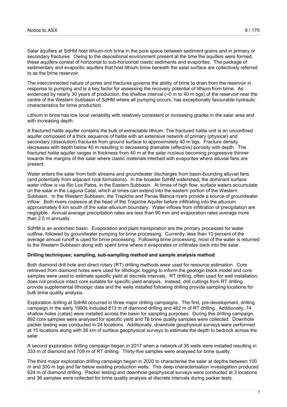 Notice to ASX 9 / 170 9 Salar aquifers at SdHM host lithium-rich brine in the pore space between sediment grains and in primary or secondary fractures. Owing to the depositional environment present at the time the aquifers were formed, these aquifers consist of horizontal to sub-horizontal clastic sediments and evaporites. The package of sedimentary and evaporitic aquifers that host lithium brine beneath the salar surface are collectively referred to as the brine reservoir. The interconnected nature of pores and fractures governs the ability of brine to drain from the reservoir in response to pumping and is a key factor for assessing the recovery potential of lithium from brine. As evidenced by nearly 30 years of production, the shallow interval (~0 m to 40 m bgs) of the reservoir near the centre of the Western Subbasin of SdHM where all pumping occurs, has exceptionally favourable hydraulic characteristics for brine production. Lithium in brine has low local variability with relatively consistent or increasing grades in the salar area and with increasing depth. A fractured halite aquifer contains the bulk of extractable lithium. The fractured halite unit is an unconfined aquifer composed of a thick sequence of halite with an extensive network of primary (physical) and secondary (dissolution) fractures from ground surface to approximately 40 m bgs. Fracture density decreases with depth below 40 m resulting in decreasing drainable (effective) porosity with depth. The fractured halite aquifer ranges in thickness from 40 m at the salar nucleus becoming progressive thinner towards the margins of the salar where clastic materials interbed with evaporites where alluvial fans are present. Water enters the salar from both streams and groundwater discharges from basin-bounding alluvial fans (and potentially from adjacent rock formations). In the broader SdHM watershed, the dominant surface water inflow is via Rio Los Patos, in the Eastern Subbasin. At times of high flow, surface waters accumulate on the salar in the Laguna Catal, which at times can extend into the eastern portion of the Western Subbasin. In the Western Subbasin, the Trapiche and Penas Blanca rivers provide a source of groundwater inflow. Both rivers coalesce at the head of the Trapiche Aquifer before infiltrating into the alluvium approximately 6 km south of the salar-alluvium boundary. Water inflows from infiltration of precipitation are negligible. Annual average precipitation rates are less than 90 mm and evaporation rates average more than 2.5 m annually. SdHM is an endorheic basin. Evaporation and plant transpiration are the primary processes for water outflow, followed by groundwater pumping for brine processing. Currently, less than 10 percent of the average annual runoff is used for brine processing. Following brine processing, most of the water is returned to the Western Subbasin along with spent brine where it evaporates or infiltrates back into the salar. Drilling techniques; sampling, sub-sampling method and sample analysis method Both diamond drill hole and direct rotary (RT) drilling methods were used for resource estimation. Core retrieved from diamond holes were used for lithologic logging to inform the geologic block model and core samples were used to estimate specific yield at discrete intervals. RT drilling, often used for well installation, does not produce intact core suitable for specific yield analysis. Instead, drill cuttings from RT drilling provide supplemental lithologic data and the wells installed following drilling provide sampling locations for bulk brine quality analysis. Exploration drilling at SdHM occurred in three major drilling campaigns. The first, pre-development, drilling campaign in the early 1990s included 813 m of diamond drilling and 462 m of RT drilling. Additionally, 74 shallow holes (catas) were installed across the basin for sampling purposes. During this drilling campaign, 892 core samples were analysed for specific yield and 78 brine quality samples were collected. Downhole packer testing was conducted in 24 locations. Additionally, downhole geophysical surveys were performed at 15 locations along with 36 km of surface geophysical surveys to estimate the depth to bedrock across the salar. A second exploration drilling campaign began in 2017 when a network of 35 wells were installed resulting in 333 m of diamond and 709 m of RT drilling. Thirty-five samples were analysed for brine quality. The third major exploration drilling campaign began in 2020 to characterise the salar at depths between 100 m and 300 m bgs and far below existing production wells. This deep characterisation investigation produced 624 m of diamond drilling. Packer testing and downhole geophysical surveys were conducted at 3 locations and 36 samples were collected for brine quality analysis at discrete intervals during packer tests.