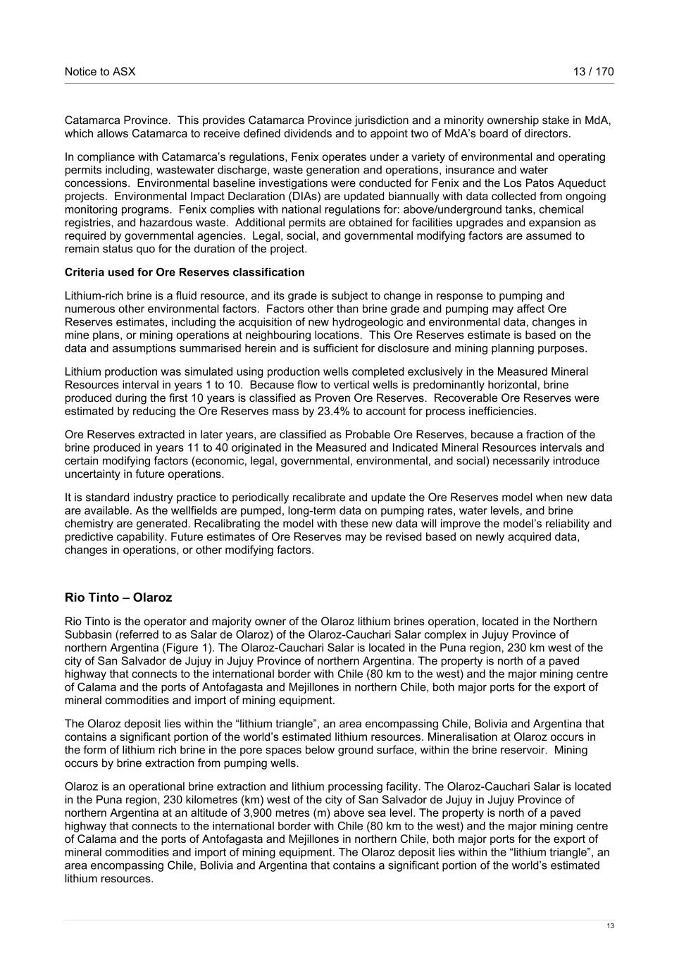 Notice to ASX 13 / 170 13 Catamarca Province. This provides Catamarca Province jurisdiction and a minority ownership stake in MdA, which allows Catamarca to receive defined dividends and to appoint two of MdA’s board of directors. In compliance with Catamarca’s regulations, Fenix operates under a variety of environmental and operating permits including, wastewater discharge, waste generation and operations, insurance and water concessions. Environmental baseline investigations were conducted for Fenix and the Los Patos Aqueduct projects. Environmental Impact Declaration (DIAs) are updated biannually with data collected from ongoing monitoring programs. Fenix complies with national regulations for: above/underground tanks, chemical registries, and hazardous waste. Additional permits are obtained for facilities upgrades and expansion as required by governmental agencies. Legal, social, and governmental modifying factors are assumed to remain status quo for the duration of the project. Criteria used for Ore Reserves classification Lithium-rich brine is a fluid resource, and its grade is subject to change in response to pumping and numerous other environmental factors. Factors other than brine grade and pumping may affect Ore Reserves estimates, including the acquisition of new hydrogeologic and environmental data, changes in mine plans, or mining operations at neighbouring locations. This Ore Reserves estimate is based on the data and assumptions summarised herein and is sufficient for disclosure and mining planning purposes. Lithium production was simulated using production wells completed exclusively in the Measured Mineral Resources interval in years 1 to 10. Because flow to vertical wells is predominantly horizontal, brine produced during the first 10 years is classified as Proven Ore Reserves. Recoverable Ore Reserves were estimated by reducing the Ore Reserves mass by 23.4% to account for process inefficiencies. Ore Reserves extracted in later years, are classified as Probable Ore Reserves, because a fraction of the brine produced in years 11 to 40 originated in the Measured and Indicated Mineral Resources intervals and certain modifying factors (economic, legal, governmental, environmental, and social) necessarily introduce uncertainty in future operations. It is standard industry practice to periodically recalibrate and update the Ore Reserves model when new data are available. As the wellfields are pumped, long-term data on pumping rates, water levels, and brine chemistry are generated. Recalibrating the model with these new data will improve the model’s reliability and predictive capability. Future estimates of Ore Reserves may be revised based on newly acquired data, changes in operations, or other modifying factors. Rio Tinto – Olaroz Rio Tinto is the operator and majority owner of the Olaroz lithium brines operation, located in the Northern Subbasin (referred to as Salar de Olaroz) of the Olaroz-Cauchari Salar complex in Jujuy Province of northern Argentina (Figure 1). The Olaroz-Cauchari Salar is located in the Puna region, 230 km west of the city of San Salvador de Jujuy in Jujuy Province of northern Argentina. The property is north of a paved highway that connects to the international border with Chile (80 km to the west) and the major mining centre of Calama and the ports of Antofagasta and Mejillones in northern Chile, both major ports for the export of mineral commodities and import of mining equipment. The Olaroz deposit lies within the “lithium triangle”, an area encompassing Chile, Bolivia and Argentina that contains a significant portion of the world’s estimated lithium resources. Mineralisation at Olaroz occurs in the form of lithium rich brine in the pore spaces below ground surface, within the brine reservoir. Mining occurs by brine extraction from pumping wells. Olaroz is an operational brine extraction and lithium processing facility. The Olaroz-Cauchari Salar is located in the Puna region, 230 kilometres (km) west of the city of San Salvador de Jujuy in Jujuy Province of northern Argentina at an altitude of 3,900 metres (m) above sea level. The property is north of a paved highway that connects to the international border with Chile (80 km to the west) and the major mining centre of Calama and the ports of Antofagasta and Mejillones in northern Chile, both major ports for the export of mineral commodities and import of mining equipment. The Olaroz deposit lies within the “lithium triangle”, an area encompassing Chile, Bolivia and Argentina that contains a significant portion of the world’s estimated lithium resources.