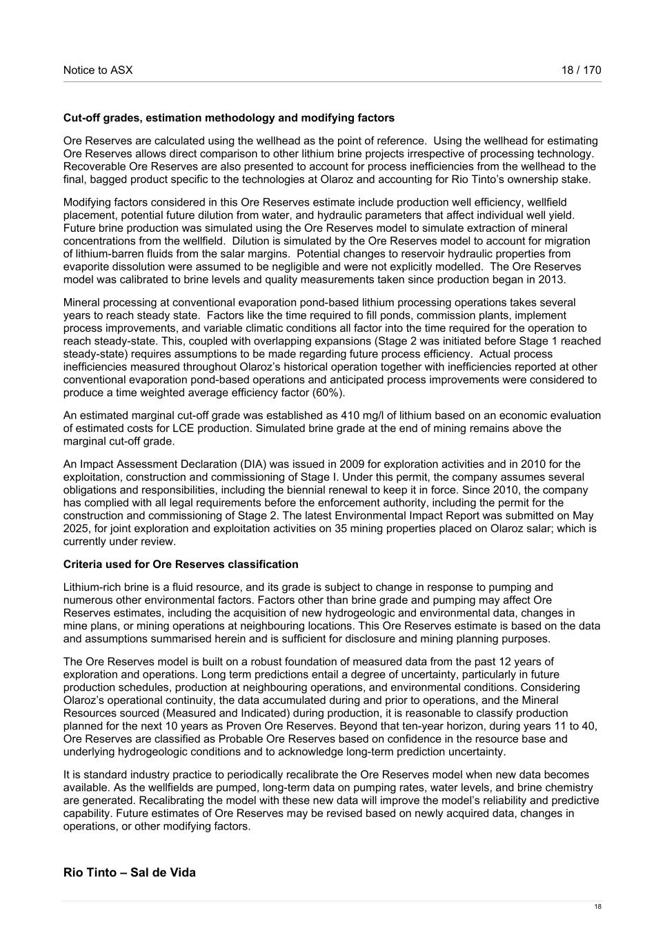 Notice to ASX 17 / 170 17 of the project, the results of which were published by the previous owners in April 2022. Construction for Stage 2 is now complete and initial production began in July 2023. Rio Tinto applies a common process to the generation of commodity price assumptions across the group. This involves generation of long-term price forecasts based on current sales contracts, industry capacity analysis, global commodity consumption and economic growth trends. Project prices are adjusted to reflect the expectation that they will be sold on cost, insurance, and freight (CIF) terms. Exchange rates are also based on internal Rio Tinto modelling of expected future country exchange rates. Due to the commercial sensitivity of these assumptions, an explanation of the methodology used to determine these assumptions has been provided, rather than the actual figures. Capital and operating cost estimates are sourced from internal Rio Tinto financial modelling and/or project capital estimates. Economic evaluation using Rio Tinto long-term prices demonstrates a positive NPV across a range of price, cost, and productivity scenarios. Mining method and assumptions Olaroz wells and ponds have been operating successfully since 2013. Onsite lithium processing and sales of lithium carbonate began in 2015 following Stage 1 project development. The Stage 2 development included a substantial increase in the evaporation pond area with the addition of 9 km2 of new evaporation ponds. A second processing plant was built to increase annual production capacity to 42.5 kt per year LCE from the combined Stages 1 and 2. The new plant design is based upon the original Stage 1 plant but with improved equipment selection and processing strategy based on prior experience. Mining is undertaken by the installation of large diameter (12 inch installed casing) wells into the salar sediments. Once installed and developed the wells are pumped to provide a continuous supply of brine to evaporation ponds. The Ore Reserves model simulates brine production at Olaroz and neighbouring operations along with environmental factors that affect the movement and grade of lithium in brine. The Ore Reserves model was calibrated to observed brine elevations and lithium grades using actual pumping rates since operations began in 2013. Following calibration, the Ore Reserves model was used to simulate the future production of lithium in brine for a 40 year period beginning 1 July 2025. Common industry practice suggests predictive simulations not be extended into the future more than twice the period for which calibration data are available. However, this is not always practical, particularly at the start of a project when data are sparse. A 40 year predictive simulation is considered appropriate for Olaroz based on its operational history, the successful production history at nearby operations and the overall size of the underlying Mineral Resources. Processing methods and assumptions Mineral processing at Olaroz uses conventional evaporation ponds to concentrate brine before it’s converted to lithium carbonate. The main processing facilities at Olaroz include brine and groundwater production wells, an extensive network of lined evaporation ponds, a Liming Plant, a Carbonate Plant, and Auxiliary Services Plant. Rio Tinto continues to process lithium at Olaroz essentially the same way it and its predecessors have since operations began in 2013. The most significant changes to operations occurred in 2023 when Stage 2 went into service. Mineral processing involves the removal of lithium from brine. At Olaroz, this occurs primarily by the process of solar evaporation. Lithium-rich brine is extracted from below ground surface using vertical pumping wells. Extracted “native or raw” brine is directed to a chain of evaporation ponds. Solar evaporation removes water from native brine, leading to a series of progressively higher concentration brines further along the evaporation pond chain. In addition to concentrated brine, ponds retain solids as minerals precipitates (salts) from solution. Periodically, entrained brine is recovered and reprocessed from residual precipitates, and the residual salts are harvested and disposed of. The concentrated brine stream is directed to the onsite Carbonate Plant where it undergoes additional processing before becoming saleable product. Olaroz Stage 1 began in 2013 and is designed to produce 17.5 kt LCE per year. Olaroz Stage 2, designed to produce 25.0 kt LCE per year, began in 2023 and is continuing to ramp up production. Olaroz Stage 1 has a successful track record of lithium carbonate production. The same is expected for Stage 2, which relies on the same basic technology as Stage 1 with improvements made based on prior experience.