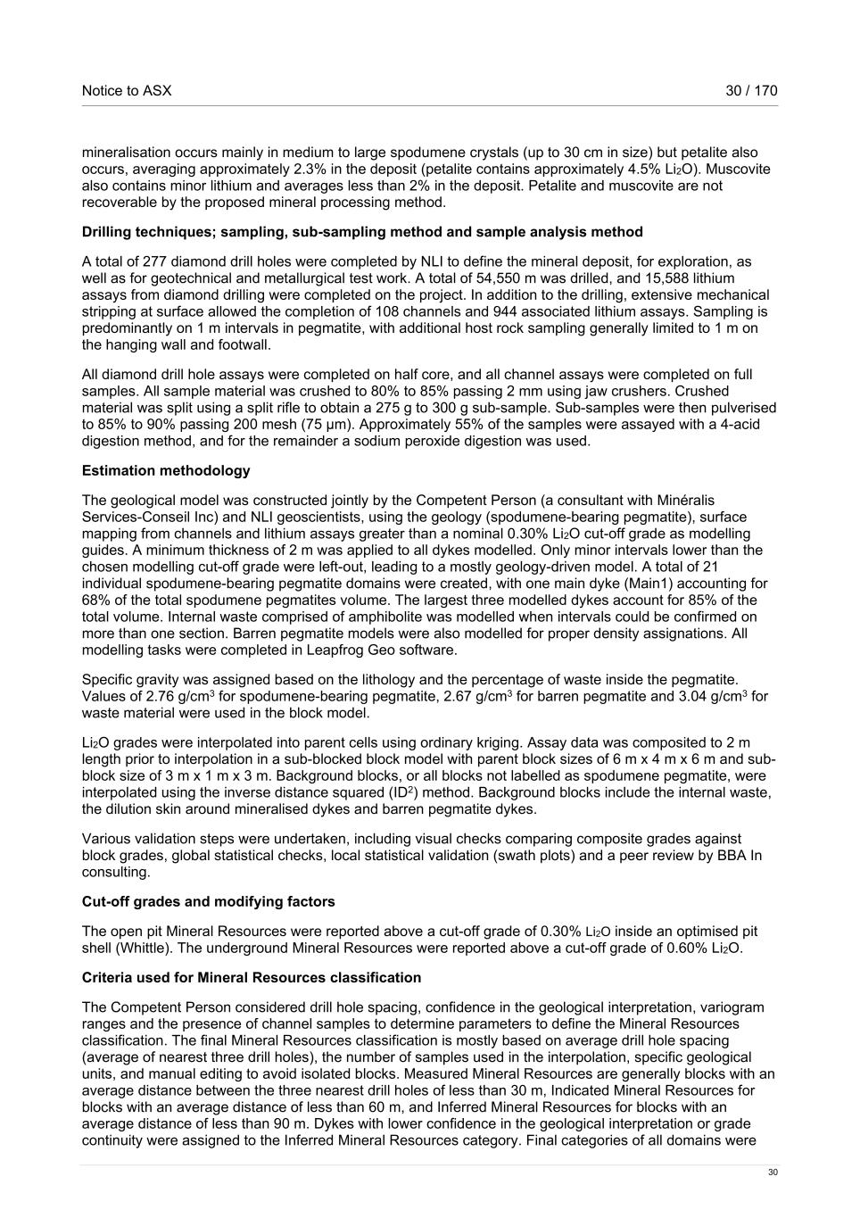 Notice to ASX 30 / 170 30 mineralisation occurs mainly in medium to large spodumene crystals (up to 30 cm in size) but petalite also occurs, averaging approximately 2.3% in the deposit (petalite contains approximately 4.5% Li2O). Muscovite also contains minor lithium and averages less than 2% in the deposit. Petalite and muscovite are not recoverable by the proposed mineral processing method. Drilling techniques; sampling, sub-sampling method and sample analysis method A total of 277 diamond drill holes were completed by NLI to define the mineral deposit, for exploration, as well as for geotechnical and metallurgical test work. A total of 54,550 m was drilled, and 15,588 lithium assays from diamond drilling were completed on the project. In addition to the drilling, extensive mechanical stripping at surface allowed the completion of 108 channels and 944 associated lithium assays. Sampling is predominantly on 1 m intervals in pegmatite, with additional host rock sampling generally limited to 1 m on the hanging wall and footwall. All diamond drill hole assays were completed on half core, and all channel assays were completed on full samples. All sample material was crushed to 80% to 85% passing 2 mm using jaw crushers. Crushed material was split using a split rifle to obtain a 275 g to 300 g sub-sample. Sub-samples were then pulverised to 85% to 90% passing 200 mesh (75 μm). Approximately 55% of the samples were assayed with a 4-acid digestion method, and for the remainder a sodium peroxide digestion was used. Estimation methodology The geological model was constructed jointly by the Competent Person (a consultant with Minéralis Services-Conseil Inc) and NLI geoscientists, using the geology (spodumene-bearing pegmatite), surface mapping from channels and lithium assays greater than a nominal 0.30% Li2O cut-off grade as modelling guides. A minimum thickness of 2 m was applied to all dykes modelled. Only minor intervals lower than the chosen modelling cut-off grade were left-out, leading to a mostly geology-driven model. A total of 21 individual spodumene-bearing pegmatite domains were created, with one main dyke (Main1) accounting for 68% of the total spodumene pegmatites volume. The largest three modelled dykes account for 85% of the total volume. Internal waste comprised of amphibolite was modelled when intervals could be confirmed on more than one section. Barren pegmatite models were also modelled for proper density assignations. All modelling tasks were completed in Leapfrog Geo software. Specific gravity was assigned based on the lithology and the percentage of waste inside the pegmatite. Values of 2.76 g/cm3 for spodumene-bearing pegmatite, 2.67 g/cm3 for barren pegmatite and 3.04 g/cm3 for waste material were used in the block model. Li2O grades were interpolated into parent cells using ordinary kriging. Assay data was composited to 2 m length prior to interpolation in a sub-blocked block model with parent block sizes of 6 m x 4 m x 6 m and sub- block size of 3 m x 1 m x 3 m. Background blocks, or all blocks not labelled as spodumene pegmatite, were interpolated using the inverse distance squared (ID2) method. Background blocks include the internal waste, the dilution skin around mineralised dykes and barren pegmatite dykes. Various validation steps were undertaken, including visual checks comparing composite grades against block grades, global statistical checks, local statistical validation (swath plots) and a peer review by BBA In consulting. Cut-off grades and modifying factors The open pit Mineral Resources were reported above a cut-off grade of 0.30% Li2O inside an optimised pit shell (Whittle). The underground Mineral Resources were reported above a cut-off grade of 0.60% Li2O. Criteria used for Mineral Resources classification The Competent Person considered drill hole spacing, confidence in the geological interpretation, variogram ranges and the presence of channel samples to determine parameters to define the Mineral Resources classification. The final Mineral Resources classification is mostly based on average drill hole spacing (average of nearest three drill holes), the number of samples used in the interpolation, specific geological units, and manual editing to avoid isolated blocks. Measured Mineral Resources are generally blocks with an average distance between the three nearest drill holes of less than 30 m, Indicated Mineral Resources for blocks with an average distance of less than 60 m, and Inferred Mineral Resources for blocks with an average distance of less than 90 m. Dykes with lower confidence in the geological interpretation or grade continuity were assigned to the Inferred Mineral Resources category. Final categories of all domains were