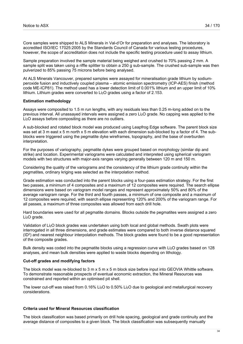 Notice to ASX 34 / 170 34 Core samples were shipped to ALS Minerals in Val-d’Or for preparation and analyses. The laboratory is accredited ISO/IEC 17025:2005 by the Standards Council of Canada for various testing procedures, however, the scope of accreditation does not include the specific testing procedure used to assay lithium. Sample preparation involved the sample material being weighed and crushed to 70% passing 2 mm. A sample split was taken using a riffle splitter to obtain a 250 g sub-sample. The crushed sub-sample was then pulverized to 85% passing 75 microns before being analysed. At ALS Minerals Vancouver, prepared samples were assayed for mineralisation grade lithium by sodium- peroxide fusion and inductively coupled plasma – atomic emission spectrometry (ICP-AES) finish (method code ME-ICP81). The method used has a lower detection limit of 0.001% lithium and an upper limit of 10% lithium. Lithium grades were converted to Li2O grades using a factor of 2.153. Estimation methodology Assays were composited to 1.5 m run lengths, with any residuals less than 0.25 m-long added on to the previous interval. All unassayed intervals were assigned a zero Li2O grade. No capping was applied to the Li2O assays before compositing as there are no outliers. A sub-blocked and rotated block model was produced using Leapfrog Edge software. The parent block size was set at 3 m east x 5 m north x 5 m elevation with each dimension sub-blocked by a factor of 4. The sub- blocks were triggered using the pegmatite dyke wireframes, topography, and the base of overburden interpretation. For the purposes of variography, pegmatite dykes were grouped based on morphology (similar dip and strike) and location. Experimental variograms were calculated and interpreted using spherical variogram models with two structures with major-axis ranges varying generally between 120 m and 150 m. Considering the quality of the variograms and the consistency of the lithium grade continuity within the pegmatites, ordinary kriging was selected as the interpolation method. Grade estimation was conducted into the parent blocks using a four-pass estimation strategy. For the first two passes, a minimum of 4 composites and a maximum of 12 composites were required. The search ellipse dimensions were based on variogram model ranges and represent approximately 50% and 80% of the average variogram range. For the third and fourth passes, a minimum of one composite and a maximum of 12 composites were required, with search ellipse representing 120% and 200% of the variogram range. For all passes, a maximum of three composites was allowed from each drill hole. Hard boundaries were used for all pegmatite domains. Blocks outside the pegmatites were assigned a zero Li2O grade. Validation of Li2O block grades was undertaken using both local and global methods. Swath plots were interrogated in all three dimensions, and grade estimates were compared to both inverse distance squared (ID2) and nearest neighbour interpolation methods. The block grades were found to be a good representation of the composite grades. Bulk density was coded into the pegmatite blocks using a regression curve with Li2O grades based on 128 analyses, and mean bulk densities were applied to waste blocks depending on lithology. Cut-off grades and modifying factors The block model was re-blocked to 3 m x 5 m x 5 m block size before input into GEOVIA Whittle software. To demonstrate reasonable prospects of eventual economic extraction, the Mineral Resources was constrained and reported within an optimised pit shell. The lower cut-off was raised from 0.16% Li2O to 0.50% Li2O due to geological and metallurgical recovery considerations. Criteria used for Mineral Resources classification The block classification was based primarily on drill hole spacing, geological and grade continuity and the average distance of composites to a given block. The block classification was subsequently manually