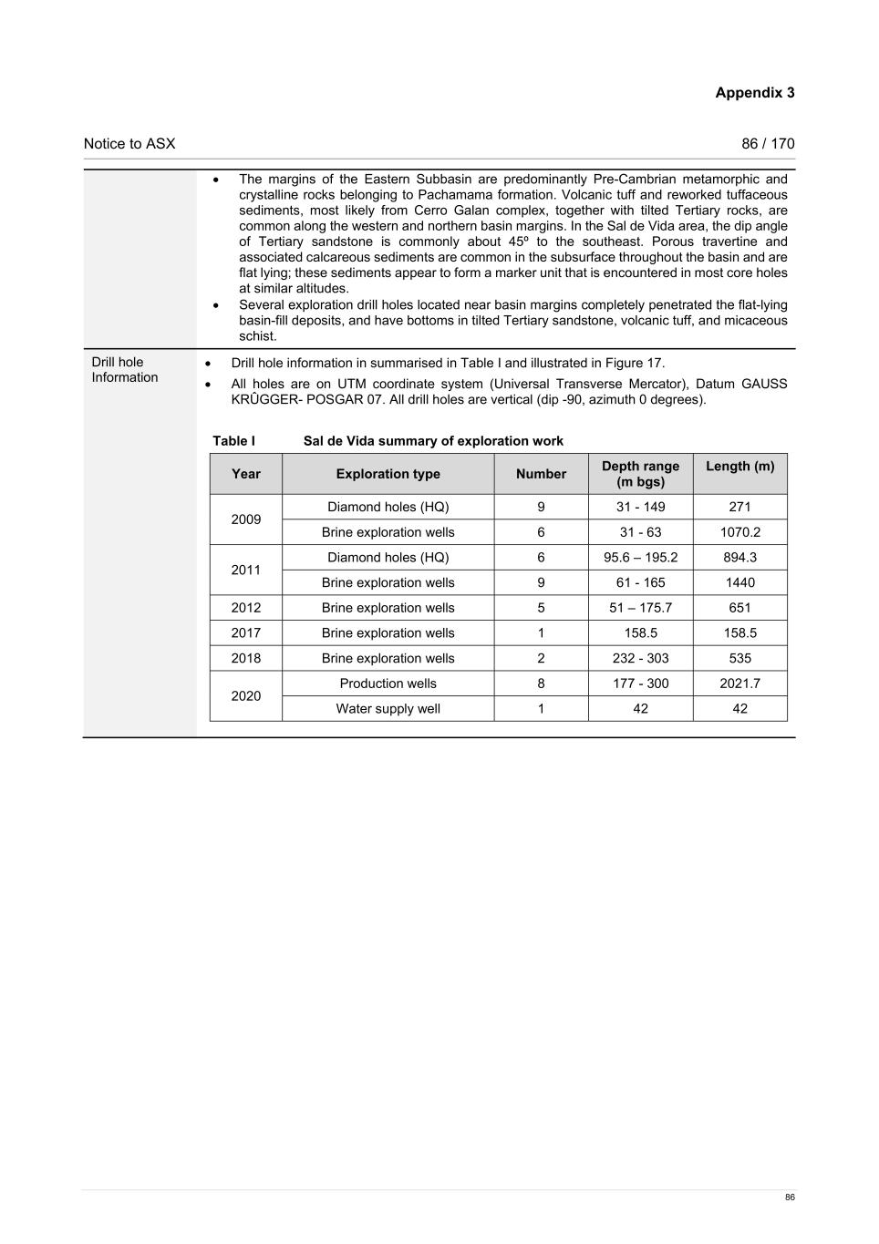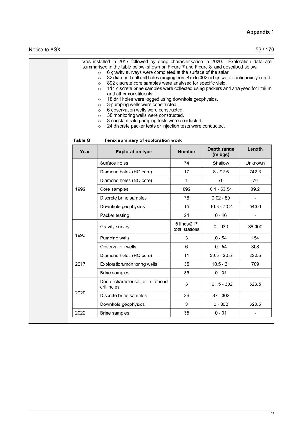 Appendix 1 Notice to ASX 53 / 170 53 was installed in 2017 followed by deep characterisation in 2020. Exploration data are summarised in the table below, shown on Figure 7 and Figure 8, and described below: o 6 gravity surveys were completed at the surface of the salar. o 32 diamond drill drill holes ranging from 8 m to 302 m bgs were continuously cored. o 892 discrete core samples were analysed for specific yield. o 114 discrete brine samples were collected using packers and analysed for lithium and other constituents. o 18 drill holes were logged using downhole geophysics. o 3 pumping wells were constructed. o 6 observation wells were constructed. o 38 monitoring wells were constructed. o 3 constant rate pumping tests were conducted. o 24 discrete packer tests or injection tests were conducted. Table G Fenix summary of exploration work Year Exploration type Number Depth range (m bgs) Length 1992 Surface holes 74 Shallow Unknown Diamond holes (HQ core) 17 8 - 92.5 742.3 Diamond holes (NQ core) 1 70 70 Core samples 892 0.1 - 63.54 89.2 Discrete brine samples 78 0.02 - 89 - Downhole geophysics 15 16.8 - 70.2 540.6 Packer testing 24 0 - 46 - 1993 Gravity survey 6 lines/217 total stations 0 - 930 36,000 Pumping wells 3 0 - 54 154 Observation wells 6 0 - 54 308 2017 Diamond holes (HQ core) 11 29.5 - 30.5 333.5 Exploration/monitoring wells 35 10.5 - 31 709 Brine samples 35 0 - 31 - 2020 Deep characterisation diamond drill holes 3 101.5 - 302 623.5 Discrete brine samples 36 37 - 302 - Downhole geophysics 3 0 - 302 623.5 2022 Brine samples 35 0 - 31 -