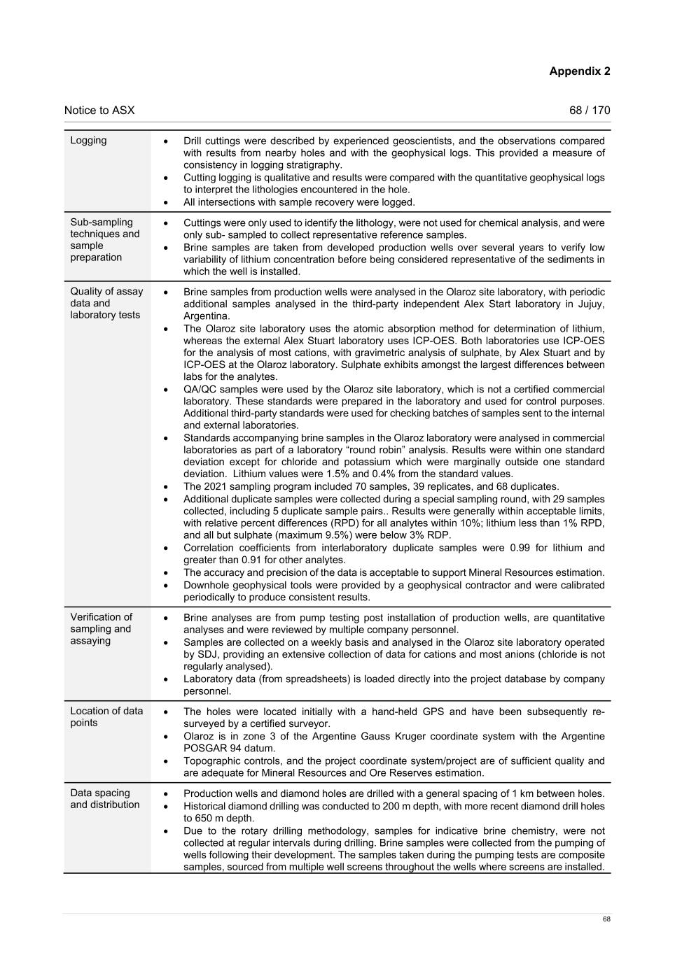 Appendix 2 Notice to ASX 68 / 170 68 Logging • Drill cuttings were described by experienced geoscientists, and the observations compared with results from nearby holes and with the geophysical logs. This provided a measure of consistency in logging stratigraphy. • Cutting logging is qualitative and results were compared with the quantitative geophysical logs to interpret the lithologies encountered in the hole. • All intersections with sample recovery were logged. Sub-sampling techniques and sample preparation • Cuttings were only used to identify the lithology, were not used for chemical analysis, and were only sub- sampled to collect representative reference samples. • Brine samples are taken from developed production wells over several years to verify low variability of lithium concentration before being considered representative of the sediments in which the well is installed. Quality of assay data and laboratory tests • Brine samples from production wells were analysed in the Olaroz site laboratory, with periodic additional samples analysed in the third-party independent Alex Start laboratory in Jujuy, Argentina. • The Olaroz site laboratory uses the atomic absorption method for determination of lithium, whereas the external Alex Stuart laboratory uses ICP-OES. Both laboratories use ICP-OES for the analysis of most cations, with gravimetric analysis of sulphate, by Alex Stuart and by ICP-OES at the Olaroz laboratory. Sulphate exhibits amongst the largest differences between labs for the analytes. • QA/QC samples were used by the Olaroz site laboratory, which is not a certified commercial laboratory. These standards were prepared in the laboratory and used for control purposes. Additional third-party standards were used for checking batches of samples sent to the internal and external laboratories. • Standards accompanying brine samples in the Olaroz laboratory were analysed in commercial laboratories as part of a laboratory “round robin” analysis. Results were within one standard deviation except for chloride and potassium which were marginally outside one standard deviation. Lithium values were 1.5% and 0.4% from the standard values. • The 2021 sampling program included 70 samples, 39 replicates, and 68 duplicates. • Additional duplicate samples were collected during a special sampling round, with 29 samples collected, including 5 duplicate sample pairs.. Results were generally within acceptable limits, with relative percent differences (RPD) for all analytes within 10%; lithium less than 1% RPD, and all but sulphate (maximum 9.5%) were below 3% RDP. • Correlation coefficients from interlaboratory duplicate samples were 0.99 for lithium and greater than 0.91 for other analytes. • The accuracy and precision of the data is acceptable to support Mineral Resources estimation. • Downhole geophysical tools were provided by a geophysical contractor and were calibrated periodically to produce consistent results. Verification of sampling and assaying • Brine analyses are from pump testing post installation of production wells, are quantitative analyses and were reviewed by multiple company personnel. • Samples are collected on a weekly basis and analysed in the Olaroz site laboratory operated by SDJ, providing an extensive collection of data for cations and most anions (chloride is not regularly analysed). • Laboratory data (from spreadsheets) is loaded directly into the project database by company personnel. Location of data points • The holes were located initially with a hand-held GPS and have been subsequently re- surveyed by a certified surveyor. • Olaroz is in zone 3 of the Argentine Gauss Kruger coordinate system with the Argentine POSGAR 94 datum. • Topographic controls, and the project coordinate system/project are of sufficient quality and are adequate for Mineral Resources and Ore Reserves estimation. Data spacing and distribution • Production wells and diamond holes are drilled with a general spacing of 1 km between holes. • Historical diamond drilling was conducted to 200 m depth, with more recent diamond drill holes to 650 m depth. • Due to the rotary drilling methodology, samples for indicative brine chemistry, were not collected at regular intervals during drilling. Brine samples were collected from the pumping of wells following their development. The samples taken during the pumping tests are composite samples, sourced from multiple well screens throughout the wells where screens are installed.