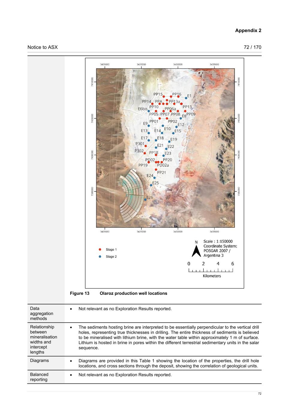 Appendix 2 Notice to ASX 72 / 170 72 Figure 13 Olaroz production well locations Data aggregation methods • Not relevant as no Exploration Results reported. Relationship between mineralisation widths and intercept lengths • The sediments hosting brine are interpreted to be essentially perpendicular to the vertical drill holes, representing true thicknesses in drilling. The entire thickness of sediments is believed to be mineralised with lithium brine, with the water table within approximately 1 m of surface. Lithium is hosted in brine in pores within the different terrestrial sedimentary units in the salar sequence. Diagrams • Diagrams are provided in this Table 1 showing the location of the properties, the drill hole locations, and cross sections through the deposit, showing the correlation of geological units. Balanced reporting • Not relevant as no Exploration Results reported.
