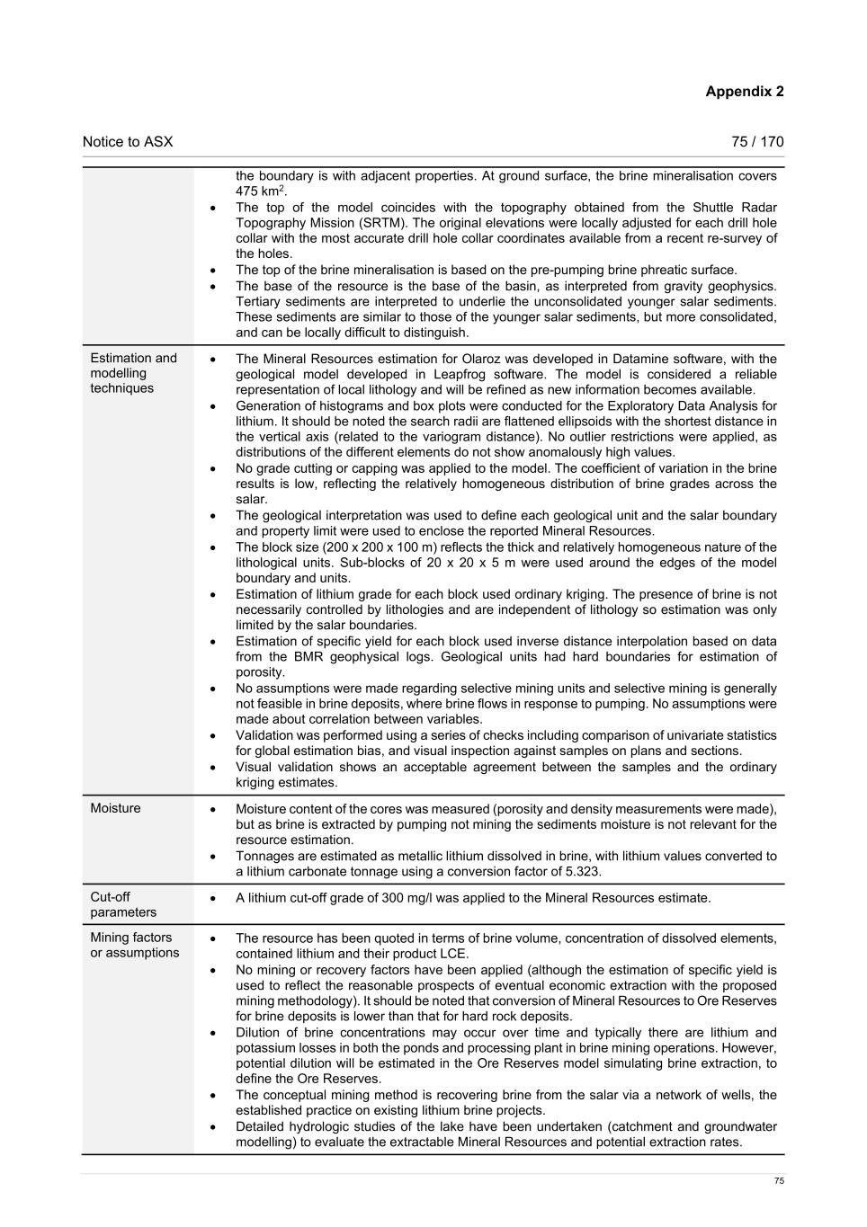 Appendix 2 Notice to ASX 75 / 170 75 the boundary is with adjacent properties. At ground surface, the brine mineralisation covers 475 km2. • The top of the model coincides with the topography obtained from the Shuttle Radar Topography Mission (SRTM). The original elevations were locally adjusted for each drill hole collar with the most accurate drill hole collar coordinates available from a recent re-survey of the holes. • The top of the brine mineralisation is based on the pre-pumping brine phreatic surface. • The base of the resource is the base of the basin, as interpreted from gravity geophysics. Tertiary sediments are interpreted to underlie the unconsolidated younger salar sediments. These sediments are similar to those of the younger salar sediments, but more consolidated, and can be locally difficult to distinguish. Estimation and modelling techniques • The Mineral Resources estimation for Olaroz was developed in Datamine software, with the geological model developed in Leapfrog software. The model is considered a reliable representation of local lithology and will be refined as new information becomes available. • Generation of histograms and box plots were conducted for the Exploratory Data Analysis for lithium. It should be noted the search radii are flattened ellipsoids with the shortest distance in the vertical axis (related to the variogram distance). No outlier restrictions were applied, as distributions of the different elements do not show anomalously high values. • No grade cutting or capping was applied to the model. The coefficient of variation in the brine results is low, reflecting the relatively homogeneous distribution of brine grades across the salar. • The geological interpretation was used to define each geological unit and the salar boundary and property limit were used to enclose the reported Mineral Resources. • The block size (200 x 200 x 100 m) reflects the thick and relatively homogeneous nature of the lithological units. Sub-blocks of 20 x 20 x 5 m were used around the edges of the model boundary and units. • Estimation of lithium grade for each block used ordinary kriging. The presence of brine is not necessarily controlled by lithologies and are independent of lithology so estimation was only limited by the salar boundaries. • Estimation of specific yield for each block used inverse distance interpolation based on data from the BMR geophysical logs. Geological units had hard boundaries for estimation of porosity. • No assumptions were made regarding selective mining units and selective mining is generally not feasible in brine deposits, where brine flows in response to pumping. No assumptions were made about correlation between variables. • Validation was performed using a series of checks including comparison of univariate statistics for global estimation bias, and visual inspection against samples on plans and sections. • Visual validation shows an acceptable agreement between the samples and the ordinary kriging estimates. Moisture • Moisture content of the cores was measured (porosity and density measurements were made), but as brine is extracted by pumping not mining the sediments moisture is not relevant for the resource estimation. • Tonnages are estimated as metallic lithium dissolved in brine, with lithium values converted to a lithium carbonate tonnage using a conversion factor of 5.323. Cut-off parameters • A lithium cut-off grade of 300 mg/l was applied to the Mineral Resources estimate. Mining factors or assumptions • The resource has been quoted in terms of brine volume, concentration of dissolved elements, contained lithium and their product LCE. • No mining or recovery factors have been applied (although the estimation of specific yield is used to reflect the reasonable prospects of eventual economic extraction with the proposed mining methodology). It should be noted that conversion of Mineral Resources to Ore Reserves for brine deposits is lower than that for hard rock deposits. • Dilution of brine concentrations may occur over time and typically there are lithium and potassium losses in both the ponds and processing plant in brine mining operations. However, potential dilution will be estimated in the Ore Reserves model simulating brine extraction, to define the Ore Reserves. • The conceptual mining method is recovering brine from the salar via a network of wells, the established practice on existing lithium brine projects. • Detailed hydrologic studies of the lake have been undertaken (catchment and groundwater modelling) to evaluate the extractable Mineral Resources and potential extraction rates.