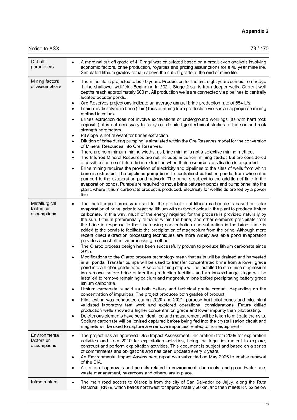 Appendix 2 Notice to ASX 78 / 170 78 Cut-off parameters • A marginal cut-off grade of 410 mg/l was calculated based on a break-even analysis involving economic factors, brine production, royalties and pricing assumptions for a 40 year mine life. Simulated lithium grades remain above the cut-off grade at the end of mine life. Mining factors or assumptions • The mine life is projected to be 40 years. Production for the first eight years comes from Stage 1, the shallower wellfield. Beginning in 2021, Stage 2 starts from deeper wells. Current well depths reach approximately 600 m. All production wells are connected via pipelines to centrally located booster ponds. • Ore Reserves projections indicate an average annual brine production rate of 654 L/s. • Lithium is dissolved in brine (fluid) thus pumping from production wells is an appropriate mining method in salars. • Brines extraction does not involve excavations or underground workings (as with hard rock deposits), it is not necessary to carry out detailed geotechnical studies of the soil and rock strength parameters. • Pit slope is not relevant for brines extraction. • Dilution of brine during pumping is simulated within the Ore Reserves model for the conversion of Mineral Resources into Ore Reserves. • There are no minimum mining widths, as brine mining is not a selective mining method. • The Inferred Mineral Resources are not included in current mining studies but are considered a possible source of future brine extraction when their resource classification is upgraded. • Brine mining requires the provision of electricity and pipelines to the sites of wells from which brine is extracted. The pipelines pump brine to centralised collection ponds, from where it is pumped to the evaporation pond network. The brine is subject to the addition of lime in the evaporation ponds. Pumps are required to move brine between ponds and pump brine into the plant, where lithium carbonate product is produced. Electricity for wellfields are fed by a power line. Metallurgical factors or assumptions • The metallurgical process utilised for the production of lithium carbonate is based on solar evaporation of brine, prior to reacting lithium with carbon dioxide in the plant to produce lithium carbonate. In this way, much of the energy required for the process is provided naturally by the sun. Lithium preferentially remains within the brine, and other elements precipitate from the brine in response to their increasing concentration and saturation in the brine. Lime is added to the ponds to facilitate the precipitation of magnesium from the brine. Although more recent direct extraction processing techniques are more widely available pond evaporation provides a cost-effective processing method. • The Olaroz process design has been successfully proven to produce lithium carbonate since 2015. • Modifications to the Olaroz process technology mean that salts will be drained and harvested in all ponds. Transfer pumps will be used to transfer concentrated brine from a lower grade pond into a higher-grade pond. A second liming stage will be installed to maximise magnesium ion removal before brine enters the production facilities and an ion-exchange stage will be installed to remove remaining calcium and magnesium ions before precipitating battery grade lithium carbonate. • Lithium carbonate is sold as both battery and technical grade product, depending on the concentration of impurities. The project produces both grades of product. • Pilot testing was conducted during 2020 and 2021; purpose-built pilot ponds and pilot plant validated laboratory test work and explored operational considerations. Future drilled production wells showed a higher concentration grade and lower impurity than pilot testing. • Deleterious elements have been identified and measurement will be taken to mitigate the risks. Sodium carbonate will be ionised captured before being fed into the crystallisation circuit and magnets will be used to capture are remove impurities related to iron equipment. Environmental factors or assumptions • The project has an approved DIA (Impact Assessment Declaration) from 2009 for exploration activities and from 2010 for exploitation activities, being the legal instrument to explore, construct and perform exploitation activities. This document is subject and based on a series of commitments and obligations and has been updated every 2 years. • An Environmental Impact Assessment report was submitted on May 2025 to enable renewal of the DIA. • A series of approvals and permits related to environment, chemicals, and groundwater use, waste management, hazardous and others, are in place. Infrastructure • The main road access to Olaroz is from the city of San Salvador de Jujuy, along the Ruta Nacional (RN) 9, which heads northwest for approximately 60 km, and then meets RN 52 below