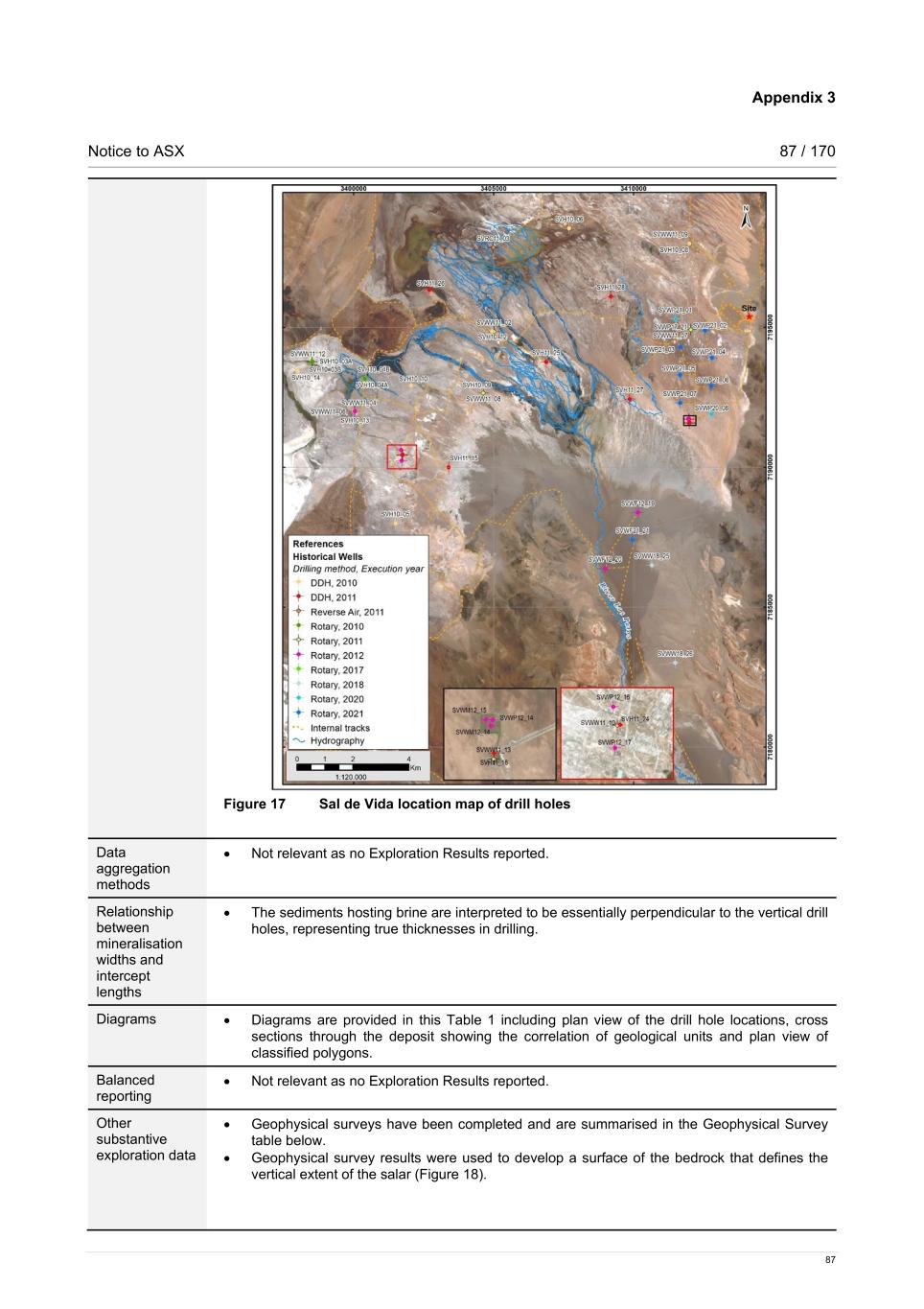 Appendix 3 Notice to ASX 87 / 170 87 Figure 17 Sal de Vida location map of drill holes Data aggregation methods • Not relevant as no Exploration Results reported. Relationship between mineralisation widths and intercept lengths • The sediments hosting brine are interpreted to be essentially perpendicular to the vertical drill holes, representing true thicknesses in drilling. Diagrams • Diagrams are provided in this Table 1 including plan view of the drill hole locations, cross sections through the deposit showing the correlation of geological units and plan view of classified polygons. Balanced reporting • Not relevant as no Exploration Results reported. Other substantive exploration data • Geophysical surveys have been completed and are summarised in the Geophysical Survey table below. • Geophysical survey results were used to develop a surface of the bedrock that defines the vertical extent of the salar (Figure 18).