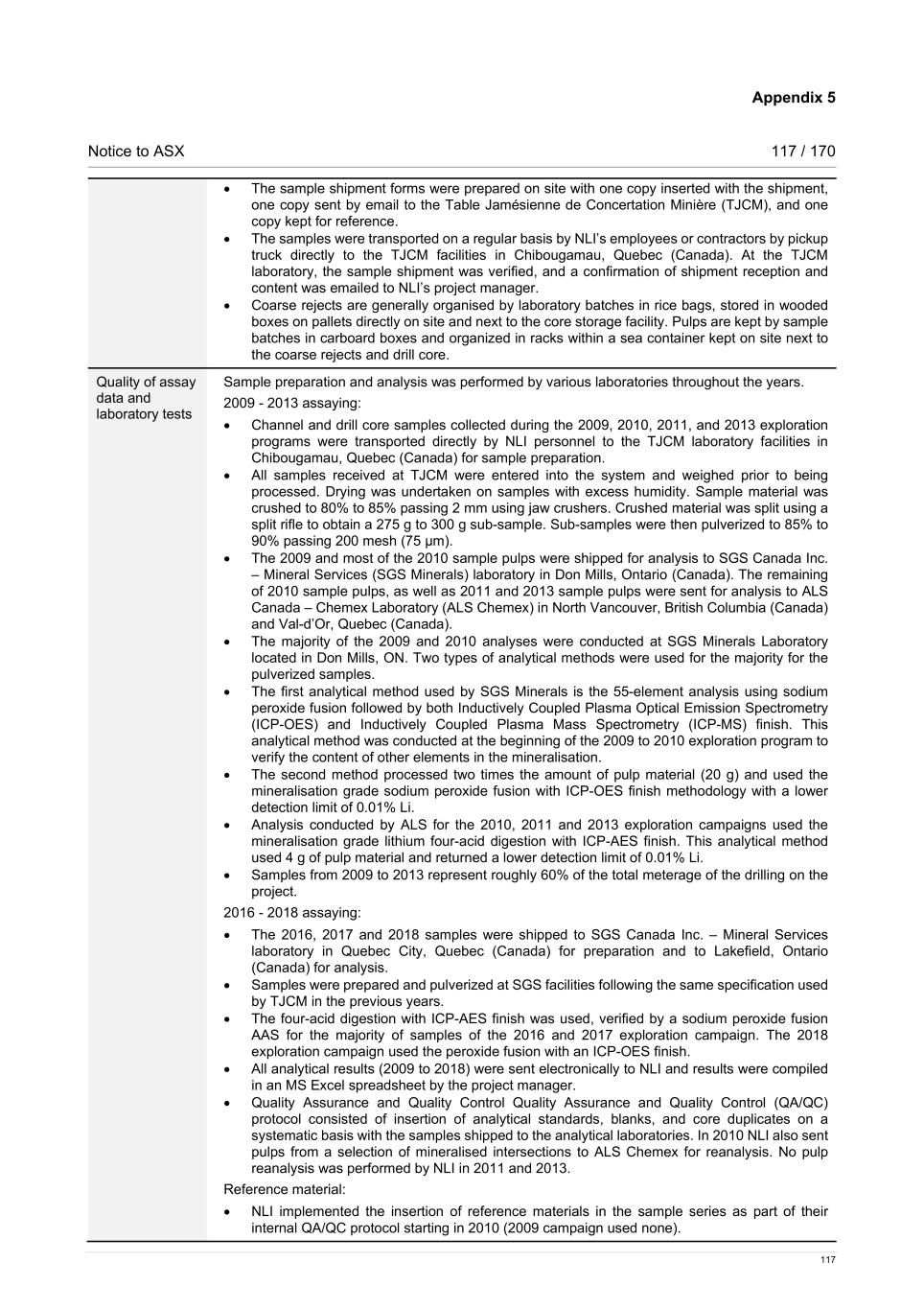 Appendix 5 Notice to ASX 117 / 170 117 • The sample shipment forms were prepared on site with one copy inserted with the shipment, one copy sent by email to the Table Jamésienne de Concertation Minière (TJCM), and one copy kept for reference. • The samples were transported on a regular basis by NLI’s employees or contractors by pickup truck directly to the TJCM facilities in Chibougamau, Quebec (Canada). At the TJCM laboratory, the sample shipment was verified, and a confirmation of shipment reception and content was emailed to NLI’s project manager. • Coarse rejects are generally organised by laboratory batches in rice bags, stored in wooded boxes on pallets directly on site and next to the core storage facility. Pulps are kept by sample batches in carboard boxes and organized in racks within a sea container kept on site next to the coarse rejects and drill core. Quality of assay data and laboratory tests Sample preparation and analysis was performed by various laboratories throughout the years. 2009 - 2013 assaying: • Channel and drill core samples collected during the 2009, 2010, 2011, and 2013 exploration programs were transported directly by NLI personnel to the TJCM laboratory facilities in Chibougamau, Quebec (Canada) for sample preparation. • All samples received at TJCM were entered into the system and weighed prior to being processed. Drying was undertaken on samples with excess humidity. Sample material was crushed to 80% to 85% passing 2 mm using jaw crushers. Crushed material was split using a split rifle to obtain a 275 g to 300 g sub-sample. Sub-samples were then pulverized to 85% to 90% passing 200 mesh (75 μm). • The 2009 and most of the 2010 sample pulps were shipped for analysis to SGS Canada Inc. – Mineral Services (SGS Minerals) laboratory in Don Mills, Ontario (Canada). The remaining of 2010 sample pulps, as well as 2011 and 2013 sample pulps were sent for analysis to ALS Canada – Chemex Laboratory (ALS Chemex) in North Vancouver, British Columbia (Canada) and Val-d’Or, Quebec (Canada). • The majority of the 2009 and 2010 analyses were conducted at SGS Minerals Laboratory located in Don Mills, ON. Two types of analytical methods were used for the majority for the pulverized samples. • The first analytical method used by SGS Minerals is the 55-element analysis using sodium peroxide fusion followed by both Inductively Coupled Plasma Optical Emission Spectrometry (ICP-OES) and Inductively Coupled Plasma Mass Spectrometry (ICP-MS) finish. This analytical method was conducted at the beginning of the 2009 to 2010 exploration program to verify the content of other elements in the mineralisation. • The second method processed two times the amount of pulp material (20 g) and used the mineralisation grade sodium peroxide fusion with ICP-OES finish methodology with a lower detection limit of 0.01% Li. • Analysis conducted by ALS for the 2010, 2011 and 2013 exploration campaigns used the mineralisation grade lithium four-acid digestion with ICP-AES finish. This analytical method used 4 g of pulp material and returned a lower detection limit of 0.01% Li. • Samples from 2009 to 2013 represent roughly 60% of the total meterage of the drilling on the project. 2016 - 2018 assaying: • The 2016, 2017 and 2018 samples were shipped to SGS Canada Inc. – Mineral Services laboratory in Quebec City, Quebec (Canada) for preparation and to Lakefield, Ontario (Canada) for analysis. • Samples were prepared and pulverized at SGS facilities following the same specification used by TJCM in the previous years. • The four-acid digestion with ICP-AES finish was used, verified by a sodium peroxide fusion AAS for the majority of samples of the 2016 and 2017 exploration campaign. The 2018 exploration campaign used the peroxide fusion with an ICP-OES finish. • All analytical results (2009 to 2018) were sent electronically to NLI and results were compiled in an MS Excel spreadsheet by the project manager. • Quality Assurance and Quality Control Quality Assurance and Quality Control (QA/QC) protocol consisted of insertion of analytical standards, blanks, and core duplicates on a systematic basis with the samples shipped to the analytical laboratories. In 2010 NLI also sent pulps from a selection of mineralised intersections to ALS Chemex for reanalysis. No pulp reanalysis was performed by NLI in 2011 and 2013. Reference material: • NLI implemented the insertion of reference materials in the sample series as part of their internal QA/QC protocol starting in 2010 (2009 campaign used none).