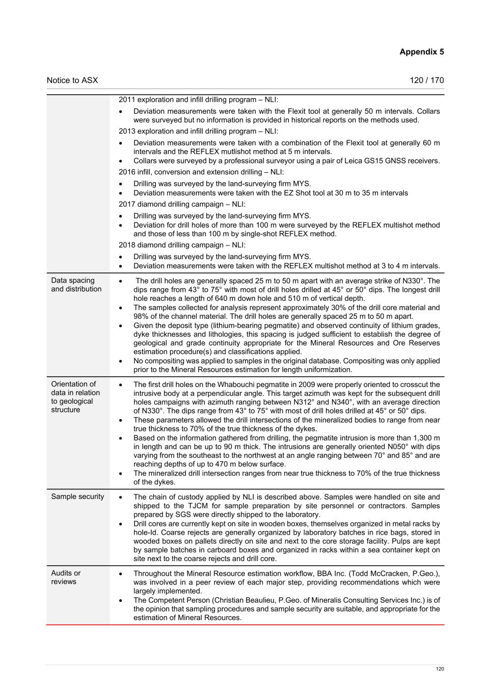 Appendix 5 Notice to ASX 120 / 170 120 2011 exploration and infill drilling program – NLI: • Deviation measurements were taken with the Flexit tool at generally 50 m intervals. Collars were surveyed but no information is provided in historical reports on the methods used. 2013 exploration and infill drilling program – NLI: • Deviation measurements were taken with a combination of the Flexit tool at generally 60 m intervals and the REFLEX mutlishot method at 5 m intervals. • Collars were surveyed by a professional surveyor using a pair of Leica GS15 GNSS receivers. 2016 infill, conversion and extension drilling – NLI: • Drilling was surveyed by the land-surveying firm MYS. • Deviation measurements were taken with the EZ Shot tool at 30 m to 35 m intervals 2017 diamond drilling campaign – NLI: • Drilling was surveyed by the land-surveying firm MYS. • Deviation for drill holes of more than 100 m were surveyed by the REFLEX multishot method and those of less than 100 m by single-shot REFLEX method. 2018 diamond drilling campaign – NLI: • Drilling was surveyed by the land-surveying firm MYS. • Deviation measurements were taken with the REFLEX multishot method at 3 to 4 m intervals. Data spacing and distribution • The drill holes are generally spaced 25 m to 50 m apart with an average strike of N330°. The dips range from 43° to 75° with most of drill holes drilled at 45° or 50° dips. The longest drill hole reaches a length of 640 m down hole and 510 m of vertical depth. • The samples collected for analysis represent approximately 30% of the drill core material and 98% of the channel material. The drill holes are generally spaced 25 m to 50 m apart. • Given the deposit type (lithium-bearing pegmatite) and observed continuity of lithium grades, dyke thicknesses and lithologies, this spacing is judged sufficient to establish the degree of geological and grade continuity appropriate for the Mineral Resources and Ore Reserves estimation procedure(s) and classifications applied. • No compositing was applied to samples in the original database. Compositing was only applied prior to the Mineral Resources estimation for length uniformization. Orientation of data in relation to geological structure • The first drill holes on the Whabouchi pegmatite in 2009 were properly oriented to crosscut the intrusive body at a perpendicular angle. This target azimuth was kept for the subsequent drill holes campaigns with azimuth ranging between N312° and N340°, with an average direction of N330°. The dips range from 43° to 75° with most of drill holes drilled at 45° or 50° dips. • These parameters allowed the drill intersections of the mineralized bodies to range from near true thickness to 70% of the true thickness of the dykes. • Based on the information gathered from drilling, the pegmatite intrusion is more than 1,300 m in length and can be up to 90 m thick. The intrusions are generally oriented N050° with dips varying from the southeast to the northwest at an angle ranging between 70° and 85° and are reaching depths of up to 470 m below surface. • The mineralized drill intersection ranges from near true thickness to 70% of the true thickness of the dykes. Sample security • The chain of custody applied by NLI is described above. Samples were handled on site and shipped to the TJCM for sample preparation by site personnel or contractors. Samples prepared by SGS were directly shipped to the laboratory. • Drill cores are currently kept on site in wooden boxes, themselves organized in metal racks by hole-Id. Coarse rejects are generally organized by laboratory batches in rice bags, stored in wooded boxes on pallets directly on site and next to the core storage facility. Pulps are kept by sample batches in carboard boxes and organized in racks within a sea container kept on site next to the coarse rejects and drill core. Audits or reviews • Throughout the Mineral Resource estimation workflow, BBA Inc. (Todd McCracken, P.Geo.), was involved in a peer review of each major step, providing recommendations which were largely implemented. • The Competent Person (Christian Beaulieu, P.Geo. of Mineralis Consulting Services Inc.) is of the opinion that sampling procedures and sample security are suitable, and appropriate for the estimation of Mineral Resources.