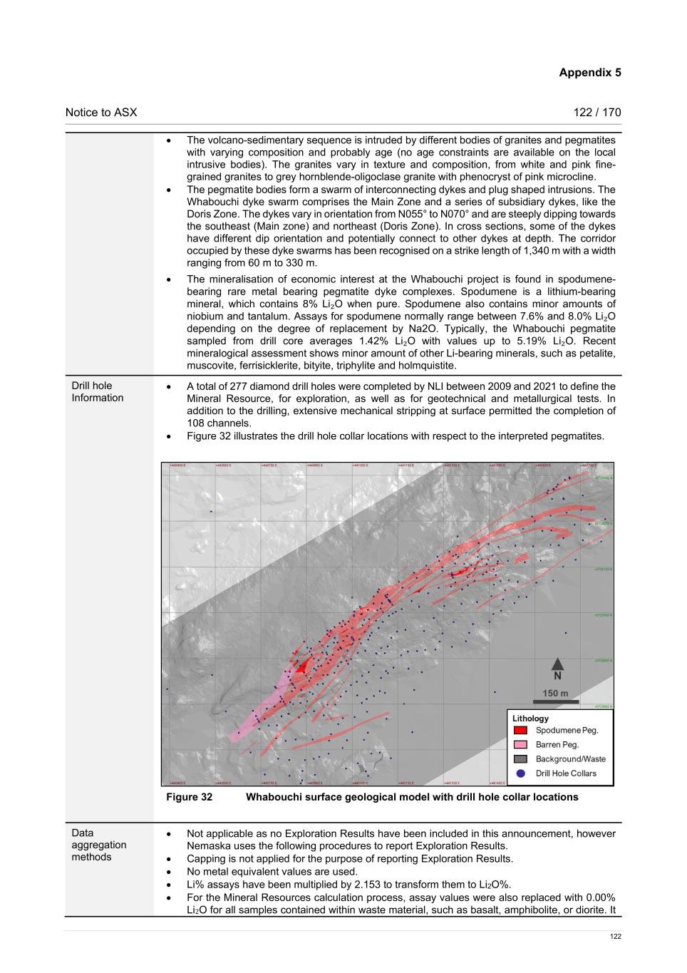 Appendix 5 Notice to ASX 122 / 170 122 • The volcano-sedimentary sequence is intruded by different bodies of granites and pegmatites with varying composition and probably age (no age constraints are available on the local intrusive bodies). The granites vary in texture and composition, from white and pink fine- grained granites to grey hornblende-oligoclase granite with phenocryst of pink microcline. • The pegmatite bodies form a swarm of interconnecting dykes and plug shaped intrusions. The Whabouchi dyke swarm comprises the Main Zone and a series of subsidiary dykes, like the Doris Zone. The dykes vary in orientation from N055° to N070° and are steeply dipping towards the southeast (Main zone) and northeast (Doris Zone). In cross sections, some of the dykes have different dip orientation and potentially connect to other dykes at depth. The corridor occupied by these dyke swarms has been recognised on a strike length of 1,340 m with a width ranging from 60 m to 330 m. • The mineralisation of economic interest at the Whabouchi project is found in spodumene- bearing rare metal bearing pegmatite dyke complexes. Spodumene is a lithium-bearing mineral, which contains 8% Li₂O when pure. Spodumene also contains minor amounts of niobium and tantalum. Assays for spodumene normally range between 7.6% and 8.0% Li₂O depending on the degree of replacement by Na2O. Typically, the Whabouchi pegmatite sampled from drill core averages 1.42% Li₂O with values up to 5.19% Li₂O. Recent mineralogical assessment shows minor amount of other Li-bearing minerals, such as petalite, muscovite, ferrisicklerite, bityite, triphylite and holmquistite. Drill hole Information • A total of 277 diamond drill holes were completed by NLI between 2009 and 2021 to define the Mineral Resource, for exploration, as well as for geotechnical and metallurgical tests. In addition to the drilling, extensive mechanical stripping at surface permitted the completion of 108 channels. • Figure 32 illustrates the drill hole collar locations with respect to the interpreted pegmatites. Figure 32 Whabouchi surface geological model with drill hole collar locations Data aggregation methods • Not applicable as no Exploration Results have been included in this announcement, however Nemaska uses the following procedures to report Exploration Results. • Capping is not applied for the purpose of reporting Exploration Results. • No metal equivalent values are used. • Li% assays have been multiplied by 2.153 to transform them to Li2O%. • For the Mineral Resources calculation process, assay values were also replaced with 0.00% Li2O for all samples contained within waste material, such as basalt, amphibolite, or diorite. It