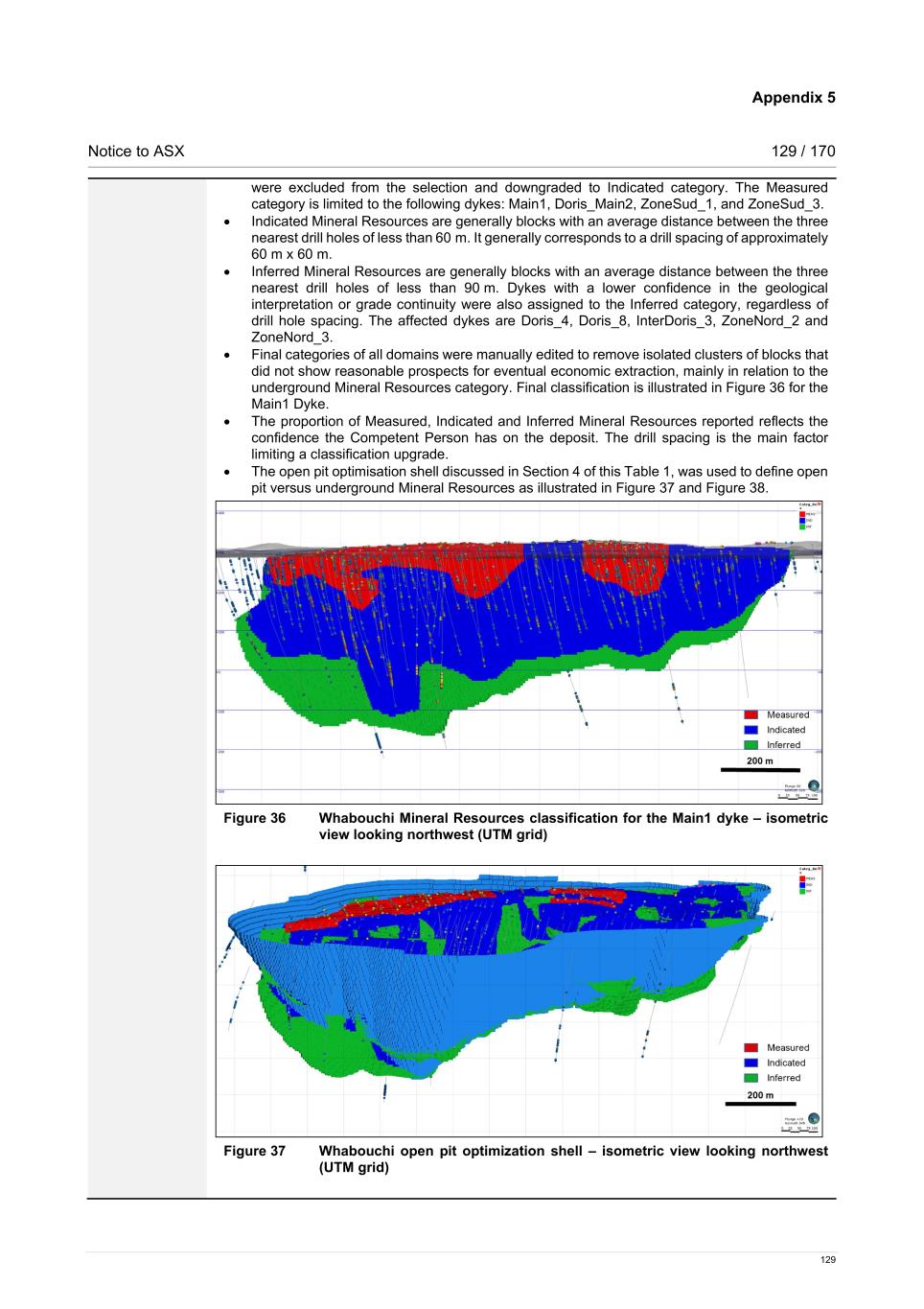 Appendix 5 Notice to ASX 129 / 170 129 were excluded from the selection and downgraded to Indicated category. The Measured category is limited to the following dykes: Main1, Doris_Main2, ZoneSud_1, and ZoneSud_3. • Indicated Mineral Resources are generally blocks with an average distance between the three nearest drill holes of less than 60 m. It generally corresponds to a drill spacing of approximately 60 m x 60 m. • Inferred Mineral Resources are generally blocks with an average distance between the three nearest drill holes of less than 90 m. Dykes with a lower confidence in the geological interpretation or grade continuity were also assigned to the Inferred category, regardless of drill hole spacing. The affected dykes are Doris_4, Doris_8, InterDoris_3, ZoneNord_2 and ZoneNord_3. • Final categories of all domains were manually edited to remove isolated clusters of blocks that did not show reasonable prospects for eventual economic extraction, mainly in relation to the underground Mineral Resources category. Final classification is illustrated in Figure 36 for the Main1 Dyke. • The proportion of Measured, Indicated and Inferred Mineral Resources reported reflects the confidence the Competent Person has on the deposit. The drill spacing is the main factor limiting a classification upgrade. • The open pit optimisation shell discussed in Section 4 of this Table 1, was used to define open pit versus underground Mineral Resources as illustrated in Figure 37 and Figure 38. Figure 36 Whabouchi Mineral Resources classification for the Main1 dyke – isometric view looking northwest (UTM grid) Figure 37 Whabouchi open pit optimization shell – isometric view looking northwest (UTM grid)