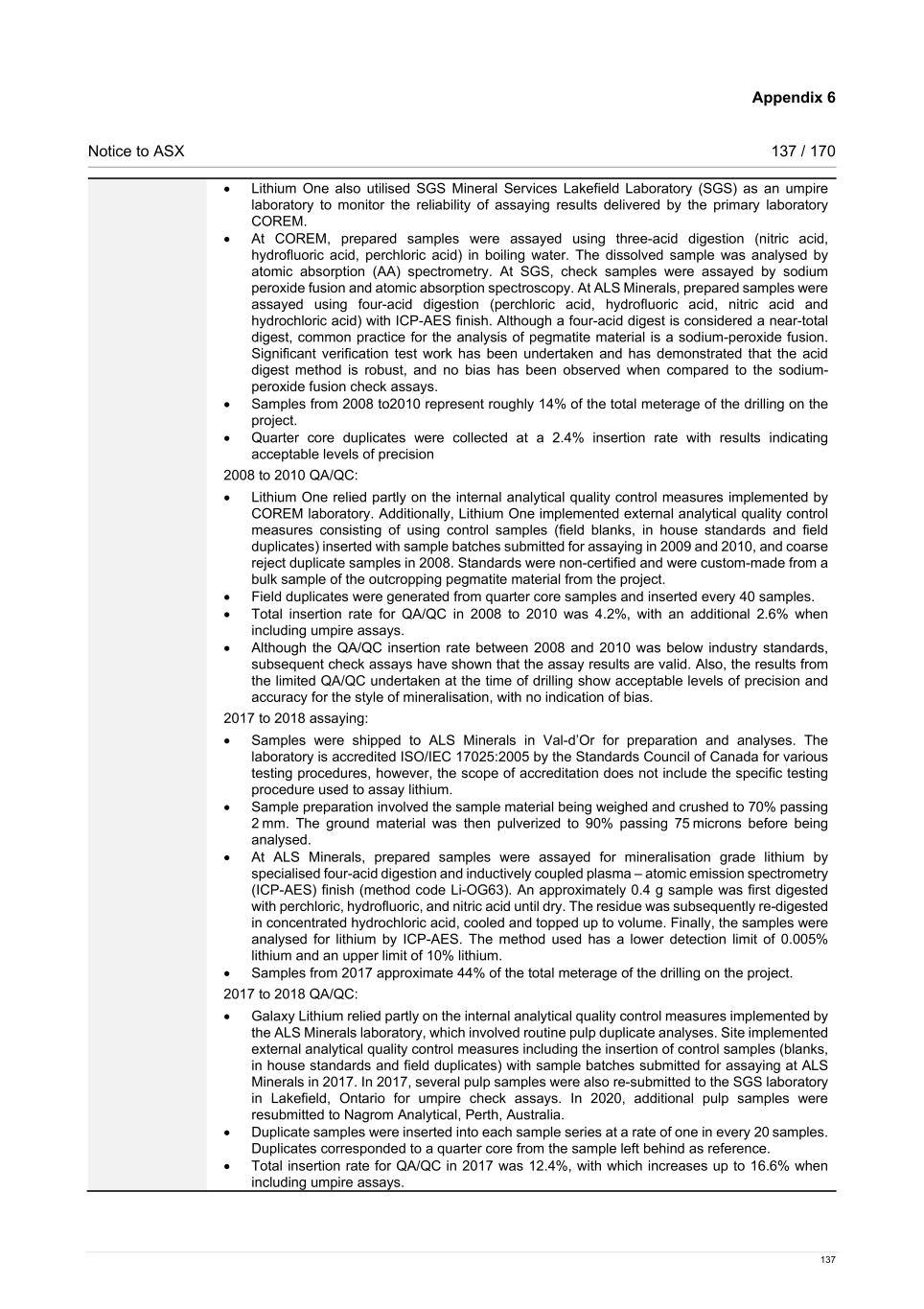Appendix 6 Notice to ASX 137 / 170 137 • Lithium One also utilised SGS Mineral Services Lakefield Laboratory (SGS) as an umpire laboratory to monitor the reliability of assaying results delivered by the primary laboratory COREM. • At COREM, prepared samples were assayed using three-acid digestion (nitric acid, hydrofluoric acid, perchloric acid) in boiling water. The dissolved sample was analysed by atomic absorption (AA) spectrometry. At SGS, check samples were assayed by sodium peroxide fusion and atomic absorption spectroscopy. At ALS Minerals, prepared samples were assayed using four-acid digestion (perchloric acid, hydrofluoric acid, nitric acid and hydrochloric acid) with ICP-AES finish. Although a four-acid digest is considered a near-total digest, common practice for the analysis of pegmatite material is a sodium-peroxide fusion. Significant verification test work has been undertaken and has demonstrated that the acid digest method is robust, and no bias has been observed when compared to the sodium- peroxide fusion check assays. • Samples from 2008 to2010 represent roughly 14% of the total meterage of the drilling on the project. • Quarter core duplicates were collected at a 2.4% insertion rate with results indicating acceptable levels of precision 2008 to 2010 QA/QC: • Lithium One relied partly on the internal analytical quality control measures implemented by COREM laboratory. Additionally, Lithium One implemented external analytical quality control measures consisting of using control samples (field blanks, in house standards and field duplicates) inserted with sample batches submitted for assaying in 2009 and 2010, and coarse reject duplicate samples in 2008. Standards were non-certified and were custom-made from a bulk sample of the outcropping pegmatite material from the project. • Field duplicates were generated from quarter core samples and inserted every 40 samples. • Total insertion rate for QA/QC in 2008 to 2010 was 4.2%, with an additional 2.6% when including umpire assays. • Although the QA/QC insertion rate between 2008 and 2010 was below industry standards, subsequent check assays have shown that the assay results are valid. Also, the results from the limited QA/QC undertaken at the time of drilling show acceptable levels of precision and accuracy for the style of mineralisation, with no indication of bias. 2017 to 2018 assaying: • Samples were shipped to ALS Minerals in Val-d’Or for preparation and analyses. The laboratory is accredited ISO/IEC 17025:2005 by the Standards Council of Canada for various testing procedures, however, the scope of accreditation does not include the specific testing procedure used to assay lithium. • Sample preparation involved the sample material being weighed and crushed to 70% passing 2 mm. The ground material was then pulverized to 90% passing 75 microns before being analysed. • At ALS Minerals, prepared samples were assayed for mineralisation grade lithium by specialised four-acid digestion and inductively coupled plasma – atomic emission spectrometry (ICP-AES) finish (method code Li-OG63). An approximately 0.4 g sample was first digested with perchloric, hydrofluoric, and nitric acid until dry. The residue was subsequently re-digested in concentrated hydrochloric acid, cooled and topped up to volume. Finally, the samples were analysed for lithium by ICP-AES. The method used has a lower detection limit of 0.005% lithium and an upper limit of 10% lithium. • Samples from 2017 approximate 44% of the total meterage of the drilling on the project. 2017 to 2018 QA/QC: • Galaxy Lithium relied partly on the internal analytical quality control measures implemented by the ALS Minerals laboratory, which involved routine pulp duplicate analyses. Site implemented external analytical quality control measures including the insertion of control samples (blanks, in house standards and field duplicates) with sample batches submitted for assaying at ALS Minerals in 2017. In 2017, several pulp samples were also re-submitted to the SGS laboratory in Lakefield, Ontario for umpire check assays. In 2020, additional pulp samples were resubmitted to Nagrom Analytical, Perth, Australia. • Duplicate samples were inserted into each sample series at a rate of one in every 20 samples. Duplicates corresponded to a quarter core from the sample left behind as reference. • Total insertion rate for QA/QC in 2017 was 12.4%, with which increases up to 16.6% when including umpire assays.