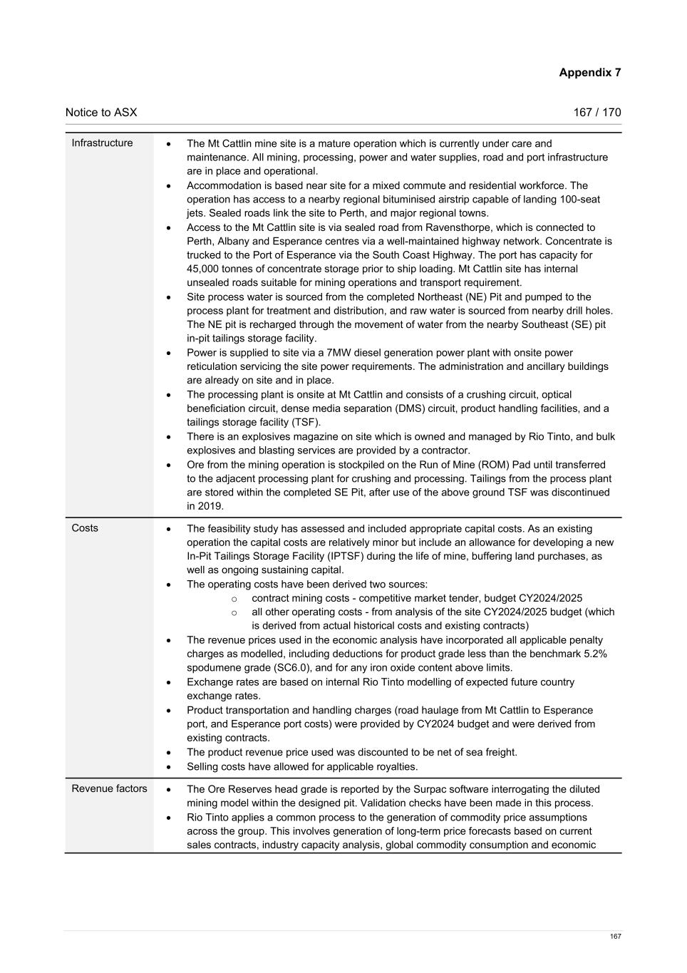 Appendix 7 Notice to ASX 167 / 170 167 Infrastructure • The Mt Cattlin mine site is a mature operation which is currently under care and maintenance. All mining, processing, power and water supplies, road and port infrastructure are in place and operational. • Accommodation is based near site for a mixed commute and residential workforce. The operation has access to a nearby regional bituminised airstrip capable of landing 100-seat jets. Sealed roads link the site to Perth, and major regional towns. • Access to the Mt Cattlin site is via sealed road from Ravensthorpe, which is connected to Perth, Albany and Esperance centres via a well-maintained highway network. Concentrate is trucked to the Port of Esperance via the South Coast Highway. The port has capacity for 45,000 tonnes of concentrate storage prior to ship loading. Mt Cattlin site has internal unsealed roads suitable for mining operations and transport requirement. • Site process water is sourced from the completed Northeast (NE) Pit and pumped to the process plant for treatment and distribution, and raw water is sourced from nearby drill holes. The NE pit is recharged through the movement of water from the nearby Southeast (SE) pit in-pit tailings storage facility. • Power is supplied to site via a 7MW diesel generation power plant with onsite power reticulation servicing the site power requirements. The administration and ancillary buildings are already on site and in place. • The processing plant is onsite at Mt Cattlin and consists of a crushing circuit, optical beneficiation circuit, dense media separation (DMS) circuit, product handling facilities, and a tailings storage facility (TSF). • There is an explosives magazine on site which is owned and managed by Rio Tinto, and bulk explosives and blasting services are provided by a contractor. • Ore from the mining operation is stockpiled on the Run of Mine (ROM) Pad until transferred to the adjacent processing plant for crushing and processing. Tailings from the process plant are stored within the completed SE Pit, after use of the above ground TSF was discontinued in 2019. Costs • The feasibility study has assessed and included appropriate capital costs. As an existing operation the capital costs are relatively minor but include an allowance for developing a new In-Pit Tailings Storage Facility (IPTSF) during the life of mine, buffering land purchases, as well as ongoing sustaining capital. • The operating costs have been derived two sources: o contract mining costs - competitive market tender, budget CY2024/2025 o all other operating costs - from analysis of the site CY2024/2025 budget (which is derived from actual historical costs and existing contracts) • The revenue prices used in the economic analysis have incorporated all applicable penalty charges as modelled, including deductions for product grade less than the benchmark 5.2% spodumene grade (SC6.0), and for any iron oxide content above limits. • Exchange rates are based on internal Rio Tinto modelling of expected future country exchange rates. • Product transportation and handling charges (road haulage from Mt Cattlin to Esperance port, and Esperance port costs) were provided by CY2024 budget and were derived from existing contracts. • The product revenue price used was discounted to be net of sea freight. • Selling costs have allowed for applicable royalties. Revenue factors • The Ore Reserves head grade is reported by the Surpac software interrogating the diluted mining model within the designed pit. Validation checks have been made in this process. • Rio Tinto applies a common process to the generation of commodity price assumptions across the group. This involves generation of long-term price forecasts based on current sales contracts, industry capacity analysis, global commodity consumption and economic
