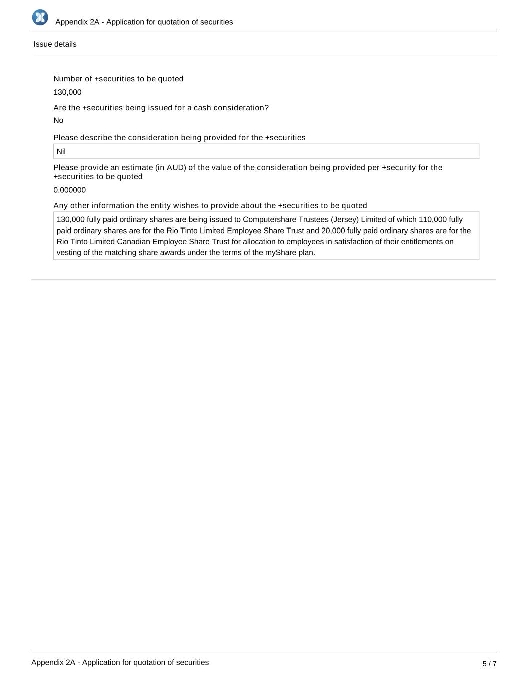 Appendix 2A - Application for quotation of securities Appendix 2A - Application for quotation of securities 5 / 7 Issue details Number of +securities to be quoted 130,000 Are the +securities being issued for a cash consideration? Please describe the consideration being provided for the +securities Nil Please provide an estimate (in AUD) of the value of the consideration being provided per +security for the +securities to be quoted 0.000000 Any other information the entity wishes to provide about the +securities to be quoted 130,000 fully paid ordinary shares are being issued to Computershare Trustees (Jersey) Limited of which 110,000 fully paid ordinary shares are for the Rio Tinto Limited Employee Share Trust and 20,000 fully paid ordinary shares are for the Rio Tinto Limited Canadian Employee Share Trust for allocation to employees in satisfaction of their entitlements on vesting of the matching share awards under the terms of the myShare plan. No