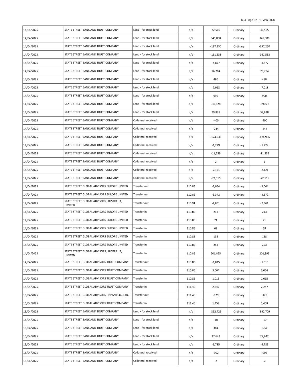 604 Page 32 19-Jan-2026 14/04/2025 n/a 32,505 Ordinary 32,505 14/04/2025 n/a 345,000 Ordinary 345,000 14/04/2025 n/a -197,230 Ordinary -197,230 14/04/2025 n/a -161,533 Ordinary -161,533 14/04/2025 n/a -4,877 Ordinary -4,877 14/04/2025 n/a 76,784 Ordinary 76,784 14/04/2025 n/a 480 Ordinary 480 14/04/2025 n/a -7,018 Ordinary -7,018 14/04/2025 n/a 990 Ordinary 990 14/04/2025 n/a -39,828 Ordinary -39,828 14/04/2025 n/a 39,828 Ordinary 39,828 14/04/2025 n/a -400 Ordinary -400 14/04/2025 n/a -244 Ordinary -244 14/04/2025 n/a -124,936 Ordinary -124,936 14/04/2025 n/a -1,229 Ordinary -1,229 14/04/2025 n/a -11,259 Ordinary -11,259 14/04/2025 n/a 2 Ordinary 2 14/04/2025 n/a -2,121 Ordinary -2,121 14/04/2025 n/a -72,515 Ordinary -72,515 14/04/2025 110.85 -3,064 Ordinary -3,064 14/04/2025 110.85 -3,372 Ordinary -3,372 14/04/2025 110.91 -2,861 Ordinary -2,861 14/04/2025 110.85 213 Ordinary 213 14/04/2025 110.85 71 Ordinary 71 14/04/2025 110.85 69 Ordinary 69 14/04/2025 110.85 138 Ordinary 138 14/04/2025 110.85 253 Ordinary 253 14/04/2025 110.85 201,895 Ordinary 201,895 14/04/2025 110.85 -1,015 Ordinary -1,015 14/04/2025 110.85 3,064 Ordinary 3,064 14/04/2025 110.85 1,015 Ordinary 1,015 15/04/2025 111.40 2,247 Ordinary 2,247 15/04/2025 111.40 -129 Ordinary -129 15/04/2025 111.40 1,458 Ordinary 1,458 15/04/2025 n/a -392,729 Ordinary -392,729 15/04/2025 n/a -10 Ordinary -10 15/04/2025 n/a 384 Ordinary 384 15/04/2025 n/a 27,642 Ordinary 27,642 15/04/2025 n/a -6,785 Ordinary -6,785 15/04/2025 n/a -902 Ordinary -902 15/04/2025 n/a -2 Ordinary -2 Collateral received Transfer out Collateral received STATE STREET BANK AND TRUST COMPANY Lend - for stock lend STATE STREET GLOBAL ADVISORS, AUSTRALIA, LIMITED STATE STREET BANK AND TRUST COMPANY STATE STREET BANK AND TRUST COMPANY Collateral received Transfer in STATE STREET GLOBAL ADVISORS EUROPE LIMITED STATE STREET BANK AND TRUST COMPANY STATE STREET BANK AND TRUST COMPANY Lend - for stock lend Transfer in Collateral received STATE STREET BANK AND TRUST COMPANY Lend - for stock lend STATE STREET GLOBAL ADVISORS EUROPE LIMITED STATE STREET BANK AND TRUST COMPANY STATE STREET BANK AND TRUST COMPANY STATE STREET BANK AND TRUST COMPANY STATE STREET BANK AND TRUST COMPANY Transfer in Transfer out Lend - for stock lend STATE STREET GLOBAL ADVISORS TRUST COMPANY STATE STREET GLOBAL ADVISORS EUROPE LIMITED STATE STREET BANK AND TRUST COMPANY Collateral received STATE STREET BANK AND TRUST COMPANY Lend - for stock lend STATE STREET GLOBAL ADVISORS TRUST COMPANY STATE STREET BANK AND TRUST COMPANY STATE STREET BANK AND TRUST COMPANY Transfer in Lend - for stock lend STATE STREET BANK AND TRUST COMPANY Transfer out STATE STREET GLOBAL ADVISORS TRUST COMPANY Collateral received STATE STREET GLOBAL ADVISORS (JAPAN) CO., LTD. Lend - for stock lend STATE STREET GLOBAL ADVISORS, AUSTRALIA, LIMITED STATE STREET BANK AND TRUST COMPANY Lend - for stock lend Transfer in Collateral received STATE STREET GLOBAL ADVISORS TRUST COMPANY Lend - for stock lend STATE STREET GLOBAL ADVISORS EUROPE LIMITED STATE STREET BANK AND TRUST COMPANY Transfer out Transfer out Lend - for stock lend STATE STREET GLOBAL ADVISORS TRUST COMPANY STATE STREET GLOBAL ADVISORS EUROPE LIMITED STATE STREET BANK AND TRUST COMPANY Transfer in Transfer in Lend - for stock lend Transfer in Collateral received STATE STREET BANK AND TRUST COMPANY Lend - for stock lend STATE STREET GLOBAL ADVISORS EUROPE LIMITED STATE STREET BANK AND TRUST COMPANY STATE STREET BANK AND TRUST COMPANY Lend - for stock lend Transfer in STATE STREET BANK AND TRUST COMPANY Collateral received Lend - for stock lend STATE STREET BANK AND TRUST COMPANY Lend - for stock lend Transfer in Collateral received STATE STREET BANK AND TRUST COMPANY Lend - for stock lend STATE STREET GLOBAL ADVISORS EUROPE LIMITED STATE STREET BANK AND TRUST COMPANY STATE STREET BANK AND TRUST COMPANY