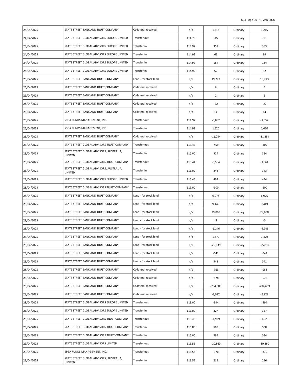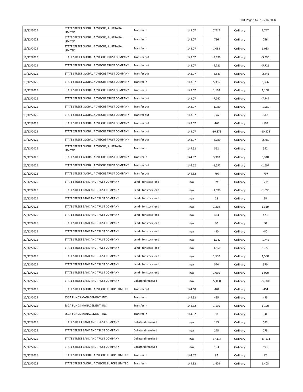 604 Page 134 19-Jan-2026 04/12/2025 n/a -3,766 Ordinary -3,766 04/12/2025 n/a -1,625 Ordinary -1,625 04/12/2025 n/a -382 Ordinary -382 04/12/2025 n/a -36,489 Ordinary -36,489 04/12/2025 n/a -4,972 Ordinary -4,972 04/12/2025 n/a -1,550 Ordinary -1,550 04/12/2025 n/a -726 Ordinary -726 04/12/2025 n/a -3,031 Ordinary -3,031 04/12/2025 n/a 3,031 Ordinary 3,031 04/12/2025 n/a -74 Ordinary -74 04/12/2025 n/a 74 Ordinary 74 04/12/2025 138.00 1,143 Ordinary 1,143 04/12/2025 n/a -737 Ordinary -737 04/12/2025 n/a 737 Ordinary 737 04/12/2025 n/a -357 Ordinary -357 04/12/2025 n/a 357 Ordinary 357 04/12/2025 n/a -5,135 Ordinary -5,135 04/12/2025 n/a 5,180 Ordinary 5,180 04/12/2025 n/a -9,968 Ordinary -9,968 04/12/2025 n/a 9,968 Ordinary 9,968 04/12/2025 n/a -42,214 Ordinary -42,214 04/12/2025 n/a 42,214 Ordinary 42,214 04/12/2025 n/a -5,673 Ordinary -5,673 04/12/2025 n/a 4,386 Ordinary 4,386 04/12/2025 n/a -1,534 Ordinary -1,534 04/12/2025 n/a 1,534 Ordinary 1,534 04/12/2025 n/a -38,687 Ordinary -38,687 04/12/2025 n/a 38,687 Ordinary 38,687 04/12/2025 n/a -36,426 Ordinary -36,426 04/12/2025 n/a 36,426 Ordinary 36,426 04/12/2025 n/a -34,881 Ordinary -34,881 04/12/2025 n/a 69,373 Ordinary 69,373 04/12/2025 n/a -51,118 Ordinary -51,118 04/12/2025 n/a 51,118 Ordinary 51,118 04/12/2025 n/a -110,175 Ordinary -110,175 04/12/2025 n/a 110,175 Ordinary 110,175 04/12/2025 n/a -21,942 Ordinary -21,942 04/12/2025 n/a 21,942 Ordinary 21,942 04/12/2025 140.58 92 Ordinary 92 04/12/2025 138.12 300 Ordinary 300 04/12/2025 140.48 -1,113 Ordinary -1,113 04/12/2025 138.00 -2,028 Ordinary -2,028STATE STREET GLOBAL ADVISORS TRUST COMPANY STATE STREET BANK AND TRUST COMPANY Borrow - for stock borrows STATE STREET BANK AND TRUST COMPANY STATE STREET BANK AND TRUST COMPANY STATE STREET BANK AND TRUST COMPANY Collateral received Collateral received STATE STREET BANK AND TRUST COMPANY Collateral received Collateral received Collateral received Collateral received Borrow - for stock borrows STATE STREET BANK AND TRUST COMPANY STATE STREET BANK AND TRUST COMPANY Collateral received STATE STREET BANK AND TRUST COMPANY Collateral received Collateral received STATE STREET BANK AND TRUST COMPANY Lend - for stock lend SSGA FUNDS MANAGEMENT, INC. STATE STREET BANK AND TRUST COMPANY Transfer in STATE STREET BANK AND TRUST COMPANY Lend - for stock lend STATE STREET BANK AND TRUST COMPANY Lend - for stock lend STATE STREET BANK AND TRUST COMPANY STATE STREET BANK AND TRUST COMPANY STATE STREET BANK AND TRUST COMPANY STATE STREET BANK AND TRUST COMPANY STATE STREET BANK AND TRUST COMPANY Collateral received Collateral received Collateral received Collateral received Collateral received Collateral received Lend - for stock lend STATE STREET BANK AND TRUST COMPANY Collateral received Collateral received Collateral received STATE STREET BANK AND TRUST COMPANY Lend - for stock lend STATE STREET BANK AND TRUST COMPANY STATE STREET BANK AND TRUST COMPANY STATE STREET BANK AND TRUST COMPANY Collateral received Collateral received STATE STREET BANK AND TRUST COMPANY STATE STREET BANK AND TRUST COMPANY Lend - for stock lend STATE STREET BANK AND TRUST COMPANY STATE STREET BANK AND TRUST COMPANY STATE STREET BANK AND TRUST COMPANY STATE STREET BANK AND TRUST COMPANY STATE STREET BANK AND TRUST COMPANY Transfer in STATE STREET BANK AND TRUST COMPANY STATE STREET BANK AND TRUST COMPANY Transfer out Collateral received Transfer in Collateral received Collateral received Lend - for stock lend STATE STREET GLOBAL ADVISORS EUROPE LIMITED STATE STREET BANK AND TRUST COMPANY Transfer out Collateral received Borrow - for stock borrows Collateral received STATE STREET GLOBAL ADVISORS TRUST COMPANY STATE STREET BANK AND TRUST COMPANY STATE STREET BANK AND TRUST COMPANY Collateral received STATE STREET GLOBAL ADVISORS EUROPE LIMITED STATE STREET BANK AND TRUST COMPANY Borrow - for stock borrows STATE STREET BANK AND TRUST COMPANY STATE STREET BANK AND TRUST COMPANY