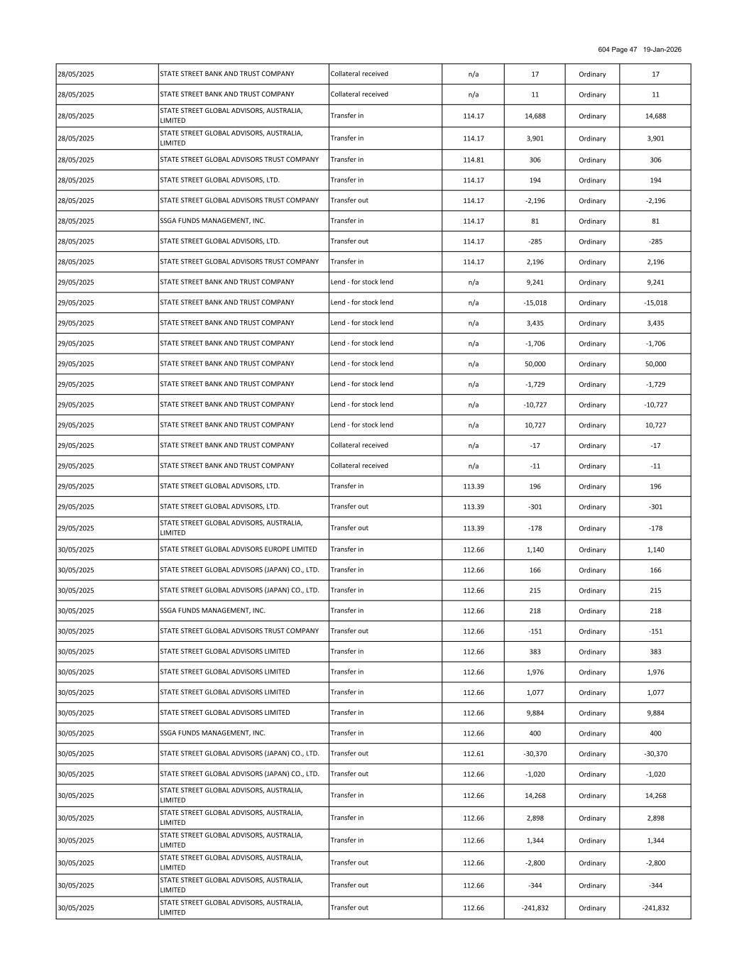 604 Page 47 19-Jan-2026 28/05/2025 n/a 17 Ordinary 17 28/05/2025 n/a 11 Ordinary 11 28/05/2025 114.17 14,688 Ordinary 14,688 28/05/2025 114.17 3,901 Ordinary 3,901 28/05/2025 114.81 306 Ordinary 306 28/05/2025 114.17 194 Ordinary 194 28/05/2025 114.17 -2,196 Ordinary -2,196 28/05/2025 114.17 81 Ordinary 81 28/05/2025 114.17 -285 Ordinary -285 28/05/2025 114.17 2,196 Ordinary 2,196 29/05/2025 n/a 9,241 Ordinary 9,241 29/05/2025 n/a -15,018 Ordinary -15,018 29/05/2025 n/a 3,435 Ordinary 3,435 29/05/2025 n/a -1,706 Ordinary -1,706 29/05/2025 n/a 50,000 Ordinary 50,000 29/05/2025 n/a -1,729 Ordinary -1,729 29/05/2025 n/a -10,727 Ordinary -10,727 29/05/2025 n/a 10,727 Ordinary 10,727 29/05/2025 n/a -17 Ordinary -17 29/05/2025 n/a -11 Ordinary -11 29/05/2025 113.39 196 Ordinary 196 29/05/2025 113.39 -301 Ordinary -301 29/05/2025 113.39 -178 Ordinary -178 30/05/2025 112.66 1,140 Ordinary 1,140 30/05/2025 112.66 166 Ordinary 166 30/05/2025 112.66 215 Ordinary 215 30/05/2025 112.66 218 Ordinary 218 30/05/2025 112.66 -151 Ordinary -151 30/05/2025 112.66 383 Ordinary 383 30/05/2025 112.66 1,976 Ordinary 1,976 30/05/2025 112.66 1,077 Ordinary 1,077 30/05/2025 112.66 9,884 Ordinary 9,884 30/05/2025 112.66 400 Ordinary 400 30/05/2025 112.61 -30,370 Ordinary -30,370 30/05/2025 112.66 -1,020 Ordinary -1,020 30/05/2025 112.66 14,268 Ordinary 14,268 30/05/2025 112.66 2,898 Ordinary 2,898 30/05/2025 112.66 1,344 Ordinary 1,344 30/05/2025 112.66 -2,800 Ordinary -2,800 30/05/2025 112.66 -344 Ordinary -344 30/05/2025 112.66 -241,832 Ordinary -241,832 STATE STREET GLOBAL ADVISORS, LTD. STATE STREET GLOBAL ADVISORS LIMITED Lend - for stock lend Transfer out Transfer in STATE STREET GLOBAL ADVISORS, LTD. STATE STREET BANK AND TRUST COMPANY Transfer in STATE STREET GLOBAL ADVISORS LIMITED STATE STREET BANK AND TRUST COMPANY STATE STREET GLOBAL ADVISORS, LTD. Collateral received Lend - for stock lend SSGA FUNDS MANAGEMENT, INC. Transfer out Transfer out STATE STREET GLOBAL ADVISORS TRUST COMPANY Lend - for stock lend Transfer in Transfer in STATE STREET BANK AND TRUST COMPANY STATE STREET BANK AND TRUST COMPANY STATE STREET GLOBAL ADVISORS, AUSTRALIA, LIMITED Collateral received STATE STREET GLOBAL ADVISORS (JAPAN) CO., LTD. Lend - for stock lend Transfer in Transfer out STATE STREET GLOBAL ADVISORS, AUSTRALIA, LIMITED STATE STREET BANK AND TRUST COMPANY Transfer in STATE STREET GLOBAL ADVISORS (JAPAN) CO., LTD. STATE STREET GLOBAL ADVISORS, AUSTRALIA, LIMITED Lend - for stock lend Transfer in Transfer in STATE STREET BANK AND TRUST COMPANY STATE STREET BANK AND TRUST COMPANY STATE STREET GLOBAL ADVISORS EUROPE LIMITED STATE STREET GLOBAL ADVISORS (JAPAN) CO., LTD. Transfer in Transfer out STATE STREET GLOBAL ADVISORS, AUSTRALIA, LIMITED STATE STREET GLOBAL ADVISORS, AUSTRALIA, LIMITED STATE STREET BANK AND TRUST COMPANY STATE STREET GLOBAL ADVISORS (JAPAN) CO., LTD. Transfer in Lend - for stock lend Transfer in Transfer in STATE STREET GLOBAL ADVISORS TRUST COMPANY STATE STREET GLOBAL ADVISORS, AUSTRALIA, LIMITED Transfer out Lend - for stock lend Transfer in Transfer out STATE STREET GLOBAL ADVISORS TRUST COMPANY STATE STREET BANK AND TRUST COMPANY Transfer in SSGA FUNDS MANAGEMENT, INC. Lend - for stock lend STATE STREET GLOBAL ADVISORS, AUSTRALIA, LIMITED Transfer out STATE STREET GLOBAL ADVISORS TRUST COMPANY STATE STREET BANK AND TRUST COMPANY Transfer in STATE STREET GLOBAL ADVISORS LIMITED STATE STREET GLOBAL ADVISORS, AUSTRALIA, LIMITED Collateral received Transfer in Transfer out STATE STREET GLOBAL ADVISORS, LTD. STATE STREET BANK AND TRUST COMPANY Transfer in Transfer in SSGA FUNDS MANAGEMENT, INC. STATE STREET BANK AND TRUST COMPANY STATE STREET GLOBAL ADVISORS LIMITED Transfer out STATE STREET GLOBAL ADVISORS, AUSTRALIA, LIMITED Collateral received Transfer in