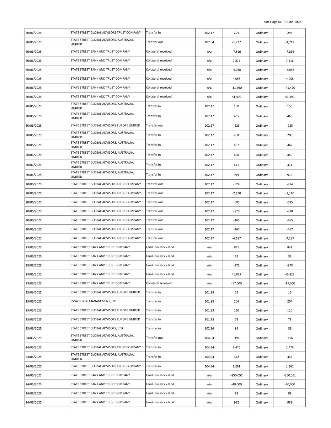 604 Page 57 19-Jan-2026 24/06/2025 n/a 217 Ordinary 217 24/06/2025 n/a -1,237 Ordinary -1,237 24/06/2025 104.94 1,399 Ordinary 1,399 24/06/2025 104.94 -1,062 Ordinary -1,062 24/06/2025 104.94 102 Ordinary 102 24/06/2025 104.94 1,207 Ordinary 1,207 24/06/2025 104.94 -2,647 Ordinary -2,647 24/06/2025 104.94 -1,261 Ordinary -1,261 24/06/2025 104.94 -1,399 Ordinary -1,399 24/06/2025 104.94 -1,207 Ordinary -1,207 25/06/2025 104.95 1,517 Ordinary 1,517 25/06/2025 104.30 1,071 Ordinary 1,071 25/06/2025 104.30 592 Ordinary 592 25/06/2025 104.30 706 Ordinary 706 25/06/2025 104.30 -706 Ordinary -706 25/06/2025 n/a -24,300 Ordinary -24,300 25/06/2025 n/a 192,664 Ordinary 192,664 25/06/2025 n/a -1,264 Ordinary -1,264 25/06/2025 n/a -591 Ordinary -591 25/06/2025 n/a -3,328 Ordinary -3,328 25/06/2025 104.30 45 Ordinary 45 25/06/2025 104.30 -3,132 Ordinary -3,132 25/06/2025 104.30 102 Ordinary 102 25/06/2025 104.30 -592 Ordinary -592 26/06/2025 104.19 -858 Ordinary -858 26/06/2025 104.19 -689 Ordinary -689 26/06/2025 104.19 -397 Ordinary -397 26/06/2025 104.19 -123 Ordinary -123 26/06/2025 104.19 434 Ordinary 434 26/06/2025 104.19 434 Ordinary 434 26/06/2025 104.19 -1,855 Ordinary -1,855 26/06/2025 104.19 -741 Ordinary -741 26/06/2025 n/a -6,991 Ordinary -6,991 26/06/2025 n/a 230,030 Ordinary 230,030 26/06/2025 n/a -7,816 Ordinary -7,816 26/06/2025 n/a 7,816 Ordinary 7,816 26/06/2025 n/a -4,058 Ordinary -4,058 26/06/2025 n/a 4,058 Ordinary 4,058 26/06/2025 n/a -41,490 Ordinary -41,490 26/06/2025 n/a 41,490 Ordinary 41,490 26/06/2025 104.19 330 Ordinary 330 STATE STREET BANK AND TRUST COMPANY Transfer in STATE STREET GLOBAL ADVISORS TRUST COMPANY Transfer out Transfer in Collateral received STATE STREET BANK AND TRUST COMPANY STATE STREET GLOBAL ADVISORS LIMITED SSGA FUNDS MANAGEMENT, INC. STATE STREET GLOBAL ADVISORS (JAPAN) CO., LTD. Transfer in STATE STREET BANK AND TRUST COMPANY Lend - for stock lend Transfer out STATE STREET GLOBAL ADVISORS TRUST COMPANY Transfer out STATE STREET GLOBAL ADVISORS TRUST COMPANY Collateral received Transfer out STATE STREET BANK AND TRUST COMPANY Transfer out STATE STREET BANK AND TRUST COMPANY STATE STREET GLOBAL ADVISORS TRUST COMPANY Transfer out Collateral received STATE STREET GLOBAL ADVISORS TRUST COMPANY SSGA FUNDS MANAGEMENT, INC. Transfer in STATE STREET GLOBAL ADVISORS TRUST COMPANY STATE STREET BANK AND TRUST COMPANY Lend - for stock lend Transfer out Collateral received STATE STREET BANK AND TRUST COMPANY STATE STREET BANK AND TRUST COMPANY Transfer out STATE STREET GLOBAL ADVISORS, AUSTRALIA, LIMITED Transfer in Lend - for stock lend Collateral received SSGA FUNDS MANAGEMENT, INC. STATE STREET BANK AND TRUST COMPANY STATE STREET GLOBAL ADVISORS, AUSTRALIA, LIMITED Lend - for stock lend STATE STREET BANK AND TRUST COMPANY Transfer in STATE STREET GLOBAL ADVISORS, AUSTRALIA, LIMITED STATE STREET BANK AND TRUST COMPANY Transfer out STATE STREET GLOBAL ADVISORS, AUSTRALIA, LIMITED STATE STREET BANK AND TRUST COMPANY Lend - for stock lend Transfer in Transfer in STATE STREET GLOBAL ADVISORS TRUST COMPANY Transfer in Transfer out Transfer out STATE STREET BANK AND TRUST COMPANY STATE STREET GLOBAL ADVISORS, AUSTRALIA, LIMITED Transfer out STATE STREET GLOBAL ADVISORS, AUSTRALIA, LIMITED Lend - for stock lend Transfer out STATE STREET GLOBAL ADVISORS EUROPE LIMITED STATE STREET GLOBAL ADVISORS, AUSTRALIA, LIMITED STATE STREET GLOBAL ADVISORS EUROPE LIMITED Lend - for stock lend Transfer in STATE STREET GLOBAL ADVISORS TRUST COMPANY Transfer out STATE STREET GLOBAL ADVISORS, AUSTRALIA, LIMITED STATE STREET GLOBAL ADVISORS, AUSTRALIA, LIMITED STATE STREET BANK AND TRUST COMPANY Collateral received STATE STREET GLOBAL ADVISORS LIMITED Lend - for stock lend SSGA FUNDS MANAGEMENT, INC. Transfer in STATE STREET BANK AND TRUST COMPANY Transfer in Collateral received