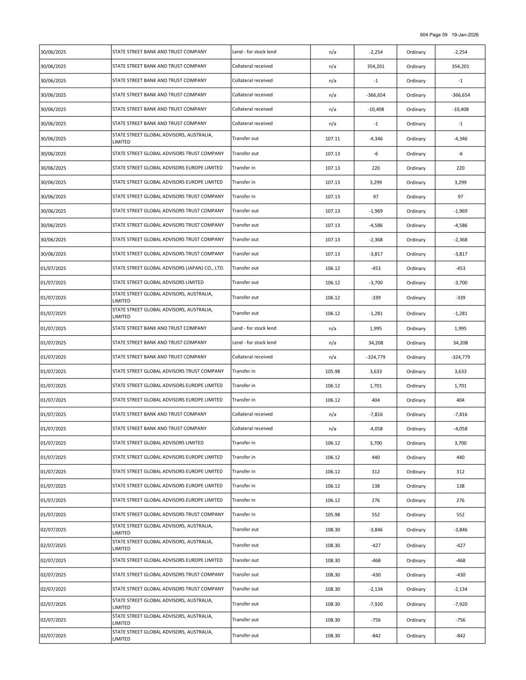 604 Page 61 19-Jan-2026 04/07/2025 n/a 177 Ordinary 177 04/07/2025 n/a 175,147 Ordinary 175,147 04/07/2025 n/a 863 Ordinary 863 04/07/2025 n/a 1,580 Ordinary 1,580 04/07/2025 n/a -414 Ordinary -414 04/07/2025 n/a 414 Ordinary 414 04/07/2025 n/a -7,816 Ordinary -7,816 04/07/2025 n/a 7,816 Ordinary 7,816 04/07/2025 n/a -510 Ordinary -510 04/07/2025 n/a 510 Ordinary 510 04/07/2025 n/a -4,058 Ordinary -4,058 04/07/2025 n/a 4,058 Ordinary 4,058 04/07/2025 n/a -41,490 Ordinary -41,490 04/07/2025 n/a 41,490 Ordinary 41,490 07/07/2025 108.62 472 Ordinary 472 07/07/2025 n/a -101,408 Ordinary -101,408 07/07/2025 n/a 70,000 Ordinary 70,000 07/07/2025 n/a -39,000 Ordinary -39,000 07/07/2025 n/a -106 Ordinary -106 07/07/2025 n/a -177 Ordinary -177 07/07/2025 n/a -175,147 Ordinary -175,147 07/07/2025 n/a -863 Ordinary -863 07/07/2025 108.62 45 Ordinary 45 07/07/2025 108.62 161 Ordinary 161 07/07/2025 108.62 1,337 Ordinary 1,337 08/07/2025 107.99 993 Ordinary 993 08/07/2025 106.61 470 Ordinary 470 08/07/2025 108.19 -6,126 Ordinary -6,126 08/07/2025 108.19 -707 Ordinary -707 08/07/2025 108.19 -1,553 Ordinary -1,553 08/07/2025 108.19 -698 Ordinary -698 08/07/2025 108.19 -7,090 Ordinary -7,090 08/07/2025 108.19 698 Ordinary 698 08/07/2025 108.19 139 Ordinary 139 08/07/2025 n/a -2,221 Ordinary -2,221 08/07/2025 n/a 1,236 Ordinary 1,236 08/07/2025 n/a 985 Ordinary 985 08/07/2025 n/a 5,158 Ordinary 5,158 08/07/2025 n/a -16,000 Ordinary -16,000 08/07/2025 108.19 510 Ordinary 510 08/07/2025 n/a -1,398 Ordinary -1,398 Collateral received STATE STREET GLOBAL ADVISORS TRUST COMPANY Collateral received Transfer in Transfer in STATE STREET BANK AND TRUST COMPANY STATE STREET BANK AND TRUST COMPANY Collateral received STATE STREET GLOBAL ADVISORS EUROPE LIMITED Collateral received STATE STREET BANK AND TRUST COMPANY STATE STREET BANK AND TRUST COMPANY STATE STREET GLOBAL ADVISORS TRUST COMPANY Collateral received STATE STREET GLOBAL ADVISORS EUROPE LIMITED Transfer in Collateral received Lend - for stock lend STATE STREET BANK AND TRUST COMPANY STATE STREET BANK AND TRUST COMPANY Transfer in Lend - for stock lend STATE STREET BANK AND TRUST COMPANY STATE STREET BANK AND TRUST COMPANY Collateral received Collateral received STATE STREET GLOBAL ADVISORS EUROPE LIMITED STATE STREET BANK AND TRUST COMPANY Lend - for stock lend Transfer in STATE STREET GLOBAL ADVISORS (JAPAN) CO., LTD. STATE STREET GLOBAL ADVISORS LIMITED Lend - for stock lend STATE STREET BANK AND TRUST COMPANY Collateral received Transfer in Lend - for stock lend Transfer out STATE STREET BANK AND TRUST COMPANY STATE STREET BANK AND TRUST COMPANY Collateral received STATE STREET GLOBAL ADVISORS, LTD. Transfer in STATE STREET BANK AND TRUST COMPANY STATE STREET BANK AND TRUST COMPANY STATE STREET BANK AND TRUST COMPANY STATE STREET BANK AND TRUST COMPANY Collateral received STATE STREET GLOBAL ADVISORS LIMITED Lend - for stock lend Collateral received STATE STREET BANK AND TRUST COMPANY Collateral received SSGA FUNDS MANAGEMENT, INC. Transfer out Collateral received STATE STREET BANK AND TRUST COMPANY STATE STREET BANK AND TRUST COMPANY Collateral received STATE STREET GLOBAL ADVISORS, AUSTRALIA, LIMITED Collateral received STATE STREET BANK AND TRUST COMPANY Transfer in Transfer out STATE STREET BANK AND TRUST COMPANY STATE STREET BANK AND TRUST COMPANY STATE STREET GLOBAL ADVISORS EUROPE LIMITED STATE STREET BANK AND TRUST COMPANY Collateral received Collateral received Transfer out STATE STREET BANK AND TRUST COMPANY STATE STREET BANK AND TRUST COMPANY Collateral received STATE STREET GLOBAL ADVISORS, AUSTRALIA, LIMITED Transfer in STATE STREET BANK AND TRUST COMPANY STATE STREET BANK AND TRUST COMPANY Collateral received STATE STREET GLOBAL ADVISORS EUROPE LIMITED Transfer out Collateral received