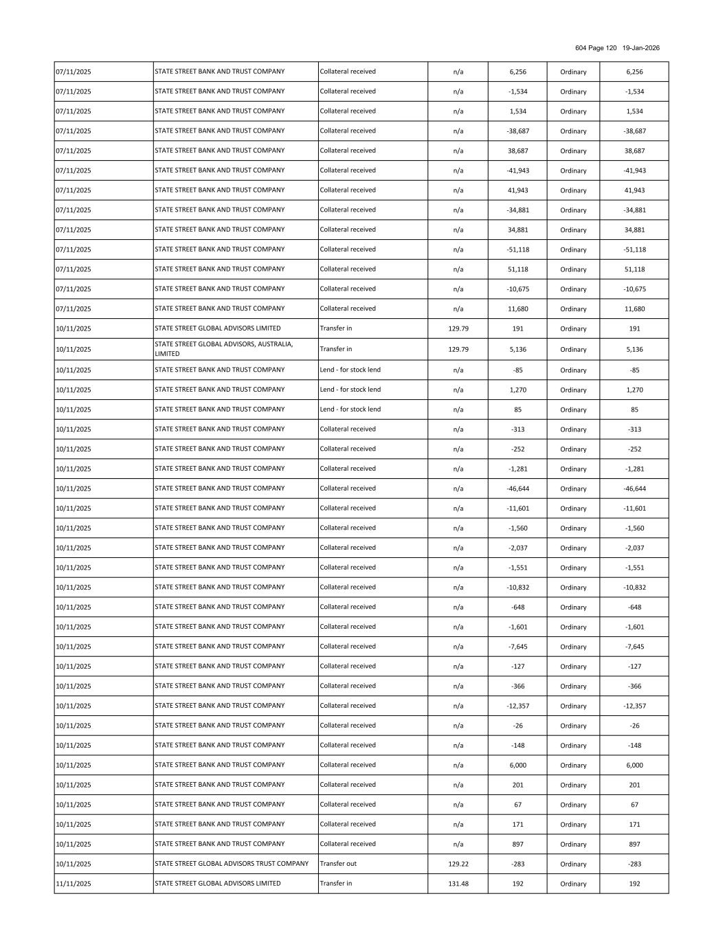 604 Page 120 19-Jan-2026 07/11/2025 n/a 6,256 Ordinary 6,256 07/11/2025 n/a -1,534 Ordinary -1,534 07/11/2025 n/a 1,534 Ordinary 1,534 07/11/2025 n/a -38,687 Ordinary -38,687 07/11/2025 n/a 38,687 Ordinary 38,687 07/11/2025 n/a -41,943 Ordinary -41,943 07/11/2025 n/a 41,943 Ordinary 41,943 07/11/2025 n/a -34,881 Ordinary -34,881 07/11/2025 n/a 34,881 Ordinary 34,881 07/11/2025 n/a -51,118 Ordinary -51,118 07/11/2025 n/a 51,118 Ordinary 51,118 07/11/2025 n/a -10,675 Ordinary -10,675 07/11/2025 n/a 11,680 Ordinary 11,680 10/11/2025 129.79 191 Ordinary 191 10/11/2025 129.79 5,136 Ordinary 5,136 10/11/2025 n/a -85 Ordinary -85 10/11/2025 n/a 1,270 Ordinary 1,270 10/11/2025 n/a 85 Ordinary 85 10/11/2025 n/a -313 Ordinary -313 10/11/2025 n/a -252 Ordinary -252 10/11/2025 n/a -1,281 Ordinary -1,281 10/11/2025 n/a -46,644 Ordinary -46,644 10/11/2025 n/a -11,601 Ordinary -11,601 10/11/2025 n/a -1,560 Ordinary -1,560 10/11/2025 n/a -2,037 Ordinary -2,037 10/11/2025 n/a -1,551 Ordinary -1,551 10/11/2025 n/a -10,832 Ordinary -10,832 10/11/2025 n/a -648 Ordinary -648 10/11/2025 n/a -1,601 Ordinary -1,601 10/11/2025 n/a -7,645 Ordinary -7,645 10/11/2025 n/a -127 Ordinary -127 10/11/2025 n/a -366 Ordinary -366 10/11/2025 n/a -12,357 Ordinary -12,357 10/11/2025 n/a -26 Ordinary -26 10/11/2025 n/a -148 Ordinary -148 10/11/2025 n/a 6,000 Ordinary 6,000 10/11/2025 n/a 201 Ordinary 201 10/11/2025 n/a 67 Ordinary 67 10/11/2025 n/a 171 Ordinary 171 10/11/2025 n/a 897 Ordinary 897 10/11/2025 129.22 -283 Ordinary -283 11/11/2025 131.48 192 Ordinary 192 Collateral received Collateral received Collateral received Collateral receivedSTATE STREET BANK AND TRUST COMPANY Collateral received STATE STREET BANK AND TRUST COMPANY STATE STREET BANK AND TRUST COMPANY STATE STREET BANK AND TRUST COMPANY Collateral received Collateral received STATE STREET BANK AND TRUST COMPANY STATE STREET BANK AND TRUST COMPANY Transfer in STATE STREET BANK AND TRUST COMPANY Collateral received STATE STREET BANK AND TRUST COMPANY STATE STREET BANK AND TRUST COMPANY STATE STREET BANK AND TRUST COMPANY STATE STREET BANK AND TRUST COMPANY Collateral received Collateral received STATE STREET BANK AND TRUST COMPANY STATE STREET GLOBAL ADVISORS LIMITED Collateral received Collateral received Collateral received Collateral received STATE STREET BANK AND TRUST COMPANY Transfer in Lend - for stock lend STATE STREET BANK AND TRUST COMPANY STATE STREET BANK AND TRUST COMPANY Collateral received Collateral received Collateral received Collateral received STATE STREET BANK AND TRUST COMPANY STATE STREET BANK AND TRUST COMPANY Lend - for stock lend Collateral received STATE STREET BANK AND TRUST COMPANY STATE STREET GLOBAL ADVISORS, AUSTRALIA, LIMITED STATE STREET BANK AND TRUST COMPANY STATE STREET BANK AND TRUST COMPANY STATE STREET BANK AND TRUST COMPANY STATE STREET BANK AND TRUST COMPANY Collateral received STATE STREET BANK AND TRUST COMPANY STATE STREET BANK AND TRUST COMPANY Transfer out STATE STREET BANK AND TRUST COMPANY Collateral received Collateral received Lend - for stock lend Transfer in Collateral received Collateral received STATE STREET GLOBAL ADVISORS TRUST COMPANY Collateral received Collateral received STATE STREET BANK AND TRUST COMPANY Collateral received STATE STREET BANK AND TRUST COMPANY Collateral received STATE STREET BANK AND TRUST COMPANY STATE STREET BANK AND TRUST COMPANY Collateral received STATE STREET BANK AND TRUST COMPANY Collateral received STATE STREET BANK AND TRUST COMPANY Collateral received STATE STREET GLOBAL ADVISORS LIMITED STATE STREET BANK AND TRUST COMPANY STATE STREET BANK AND TRUST COMPANY STATE STREET BANK AND TRUST COMPANY STATE STREET BANK AND TRUST COMPANY STATE STREET BANK AND TRUST COMPANY STATE STREET BANK AND TRUST COMPANY Collateral received Collateral received Collateral received STATE STREET BANK AND TRUST COMPANY Collateral received