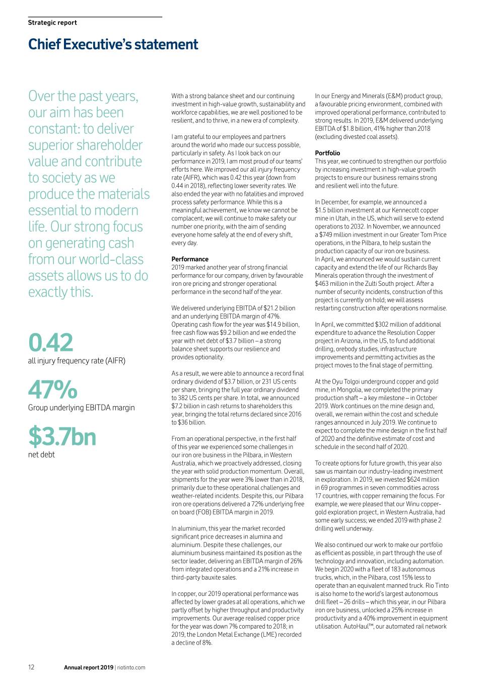 Strategic report Chief Executive’s statement Over the past years, With a strong balance sheet and our continuing In our Energy and Minerals (E&M) product group, investment in high-value growth, sustainability and a favourable pricing environment, combined with our aim has been workforce capabilities, we are well positioned to be improved operational performance, contributed to resilient, and to thrive, in a new era of complexity. strong results. In 2019, E&M delivered underlying constant: to deliver EBITDA of $1.8 billion, 41% higher than 2018 I am grateful to our employees and partners (excluding divested coal assets). superior shareholder around the world who made our success possible, particularly in safety. As I look back on our Portfolio value and contribute performance in 2019, I am most proud of our teams’ This year, we continued to strengthen our portfolio efforts here. We improved our all injury frequency by increasing investment in high-value growth to society as we rate (AIFR), which was 0.42 this year (down from projects to ensure our business remains strong 0.44 in 2018), reflecting lower severity rates. We and resilient well into the future. produce the materials also ended the year with no fatalities and improved process safety performance. While this is a In December, for example, we announced a essential to modern meaningful achievement, we know we cannot be $1.5 billion investment at our Kennecott copper complacent; we will continue to make safety our mine in Utah, in the US, which will serve to extend life. Our strong focus number one priority, with the aim of sending operations to 2032. In November, we announced everyone home safely at the end of every shift, a $749 million investment in our Greater Tom Price on generating cash every day. operations, in the Pilbara, to help sustain the production capacity of our iron ore business. from our world-class Performance In April, we announced we would sustain current 2019 marked another year of strong financial capacity and extend the life of our Richards Bay assets allows us to do performance for our company, driven by favourable Minerals operation through the investment of iron ore pricing and stronger operational $463 million in the Zulti South project. After a exactly this. performance in the second half of the year. number of security incidents, construction of this project is currently on hold; we will assess We delivered underlying EBITDA of $21.2 billion restarting construction after operations normalise. and an underlying EBITDA margin of 47%. Operating cash flow for the year was $14.9 billion, In April, we committed $302 million of additional free cash flow was $9.2 billion and we ended the expenditure to advance the Resolution Copper year with net debt of $3.7 billion – a strong project in Arizona, in the US, to fund additional 0.42 balance sheet supports our resilience and drilling, orebody studies, infrastructure all injury frequency rate (AIFR) provides optionality. improvements and permitting activities as the project moves to the final stage of permitting. As a result, we were able to announce a record final ordinary dividend of $3.7 billion, or 231 US cents At the Oyu Tolgoi underground copper and gold per share, bringing the full year ordinary dividend mine, in Mongolia, we completed the primary 47% to 382 US cents per share. In total, we announced production shaft – a key milestone – in October Group underlying EBITDA margin $7.2 billion in cash returns to shareholders this 2019. Work continues on the mine design and, year, bringing the total returns declared since 2016 overall, we remain within the cost and schedule to $36 billion. ranges announced in July 2019. We continue to expect to complete the mine design in the first half From an operational perspective, in the first half of 2020 and the definitive estimate of cost and $3.7bn of this year we experienced some challenges in schedule in the second half of 2020. net debt our iron ore business in the Pilbara, in Western Australia, which we proactively addressed, closing To create options for future growth, this year also the year with solid production momentum. Overall, saw us maintain our industry-leading investment shipments for the year were 3% lower than in 2018, in exploration. In 2019, we invested $624 million primarily due to these operational challenges and in 69 programmes in seven commodities across weather-related incidents. Despite this, our Pilbara 17 countries, with copper remaining the focus. For iron ore operations delivered a 72% underlying free example, we were pleased that our Winu copper- on board (FOB) EBITDA margin in 2019. gold exploration project, in Western Australia, had some early success; we ended 2019 with phase 2 In aluminium, this year the market recorded drilling well underway. significant price decreases in alumina and aluminium. Despite these challenges, our We also continued our work to make our portfolio aluminium business maintained its position as the as efficient as possible, in part through the use of sector leader, delivering an EBITDA margin of 26% technology and innovation, including automation. from integrated operations and a 21% increase in We begin 2020 with a fleet of 183 autonomous third-party bauxite sales. trucks, which, in the Pilbara, cost 15% less to operate than an equivalent manned truck. Rio Tinto In copper, our 2019 operational performance was is also home to the world’s largest autonomous affected by lower grades at all operations, which we drill fleet – 26 drills – which this year, in our Pilbara partly offset by higher throughput and productivity iron ore business, unlocked a 25% increase in improvements. Our average realised copper price productivity and a 40% improvement in equipment for the year was down 7% compared to 2018; in utilisation. AutoHaul™, our automated rail network 2019, the London Metal Exchange (LME) recorded a decline of 8%. 12 Annual report 2019 | riotinto