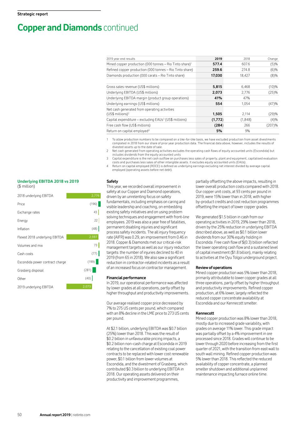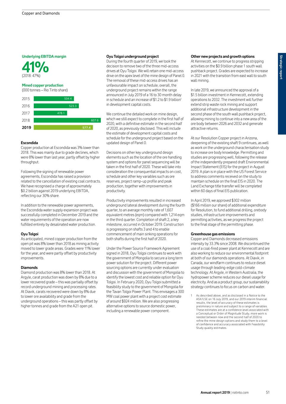 Copper and Diamonds Underlying EBITDA margin Oyu Tolgoi underground project Other new projects and growth options report Strategic During the fourth quarter of 2019, we took the At Kennecott, we continue to progress stripping decision to remove two of the three mid-access activities on the $0.9 billion phase 1 south wall 41% drives at Oyu Tolgoi. We will retain one mid-access pushback project. Grades are expected to increase (2018: 47%) drive on the apex level of the mine design of Panel 0. in 2021 with the transition from east wall to south The removal of these mid-access drives has an wall mining. Mined copper production unfavourable impact on schedule; overall, the (000 tonnes – Rio Tinto share) underground project remains within the range In late 2019, we announced the approval of a announced in July 2019 of a 16 to 30 month delay $1.5 billion investment in Kennecott, extending ���� ���.� in schedule and an increase of $1.2 to $1.9 billion1 operations to 2032. The investment will further ���� ���.� in development capital costs. extend strip waste rock mining and support additional infrastructure development in the ���� ���.� We continue the detailed work on mine design, second phase of the south wall pushback project, ���� ���.� which we still expect to complete in the first half of allowing mining to continue into a new area of the 2020, with a definitive estimate in the second half ore body between 2026 and 2032 and generate 2019 ����� of 2020, as previously disclosed. This will include attractive returns. the estimate of development capital costs and schedule for the underground project based on the At our Resolution Copper project in Arizona, Escondida updated design of Panel 0. deepening of the existing shaft 9 continues, as well Copper production at Escondida was 3% lower than as work on the underground characterisation study 2018. This was mainly due to grade declines, which Decisions on other key underground design to increase ore body knowledge. Permitting and were 8% lower than last year, partly offset by higher elements such as the location of the ore handling studies are progressing well, following the release throughput. system and options for panel sequencing will be of the independently prepared draft Environmental taken in the first half of 2020. These will take into Impact Statement (EIS) for the project in August Following the signing of renewable power consideration the consequential impacts on cost, 2019. A plan is in place with the US Forest Service agreements, Escondida has raised a provision schedule and other key variables such as ore to address comments received on the study to related to the cancellation of existing coal contracts. reserves, project ramp-up profile and peak maintain schedule on the final EIS in 2020. The We have recognised a charge of approximately production, together with improvements in Land Exchange title transfer will be completed $0.2 billion against 2019 underlying EBITDA, productivity. within 60 days of final EIS publication. reflecting our 30% share. Productivity improvements resulted in increased In April 2019, we approved $302 million In addition to the renewable power agreements, underground lateral development during the fourth ($166 million our share) of additional expenditure the Escondida water supply expansion project was quarter, to an average monthly rate of 1,607 for Resolution, to fund additional drilling, orebody successfully completed in December 2019 and the equivalent metres (eqm) compared with 1,214 eqm studies, infrastructure improvements and water requirements of the operation are now in the third quarter. Completion of shaft 2, a key permitting activities, as we progress the project fulfilled entirely by desalinated water production. milestone, occurred in October 2019. Construction to the final stage of the permitting phase. is progressing on shafts 3 and 4 to enable Oyu Tolgoi commencement of main sinking operations for Greenhouse gas emissions As anticipated, mined copper production from the both shafts during the first half of 2020. Copper and Diamonds decreased emissions open pit was 8% lower than 2018 as mining activity intensity by 33.3% since 2008. We discontinued the moved to lower grade areas. Grades were 11% lower Under the Power Source Framework Agreement use of a coal-fired power plant at Kennecott and are for the year, and were partly offset by productivity signed in 2018, Oyu Tolgoi continues to work with also working to reduce our environmental footprint improvements. the government of Mongolia to secure a long term at both of our diamonds operations. At Diavik, in power solution for the project. Different power Canada, our windfarm continues to reduce diesel Diamonds sourcing options are currently under evaluation usage through leading-edge cold-climate Diamond production was 8% lower than 2018. At and discussion with the government of Mongolia to technology. At Argyle, in Western Australia, the Argyle, carat production was down by 8% due to a identify the lowest cost and reliable option for Oyu hydropower scheme reduces our diesel usage for lower recovered grade – this was partially offset by Tolgoi. In February 2020, Oyu Tolgoi submitted a electricity. And as a product group, our sustainability record underground mining and processing rates. feasibility study to the government of Mongolia for strategy continues to focus on carbon and water. At Diavik, carats recovered were down by 8% due the Tavan Tolgoi Power Plant. This envisages a 300 to lower ore availability and grade from the MW coal power plant with a project cost estimate 1 As described above, and as disclosed in a Notice to the ASX/LSE on 16 July 2019, and our 2019 interim financial underground operations – this was partly offset by of around $924 million. We are also progressing results, the level of accuracy of these estimates is higher tonnes and grade f