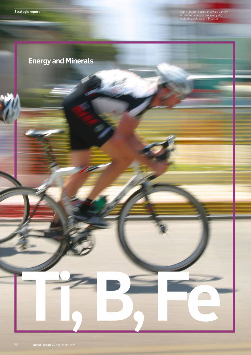 Strategic report TitaniumOur titanium is used is used in a inwide a wide array variety of applications,of products people including use lightweightevery day, bicycles.including lightweight bicycles. Energy and Minerals Ti, B, Fe 52 Annual report 2019 | riotinto.com